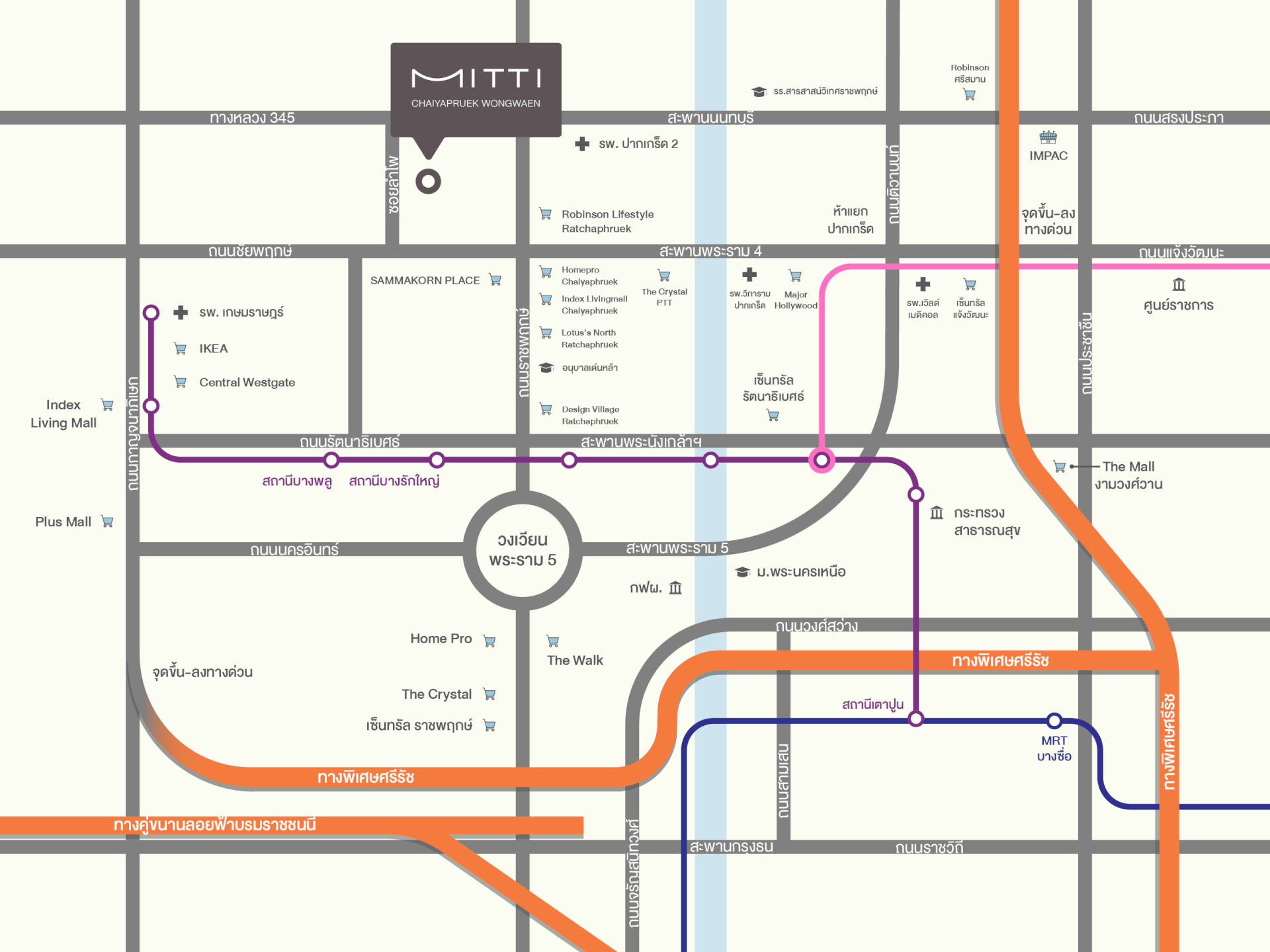 สถานศึกษาโรงเรียนสารสาสน์ราชพฤกษ์ 4.9 กม.โรงเรียนนานาชาติสิงคโปร์ SISB วิทยาเขตนนทบุรี 8 กม.โรงเรียนสวนกุหลาบวิทยาลัย 12 กม. ห้างสรรพสินค้าชิค รีพับบลิค ราชพฤกษ์ 8 กม.เซ็นทรัล แจ้งวัฒนะ 13 กม.อีเกีย บางใหญ่ 11 กม.เซ็นทรัล เวสต์เกต 11 กม.เพียวเพลส ราชพฤกษ์ 10 กม.เดอะ คริสตัล