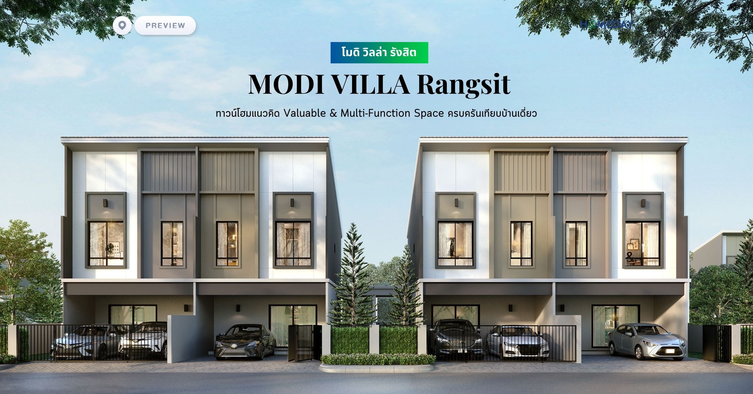 "โครงการ โมดิ วิลล่า รังสิต (MODI VILLA Rangsit) ทาวน์โฮมแนวคิด Valuable & Multi-Function Space ครบครันเทียบบ้านเดี่ยว เหนือกว่าด้วย Club House ขนาดใหญ่ พร้อมเครื่องออกกำลังกายและสระว่ายน้ำ สดชื่นกับสวนสวยภายในโครงการ"