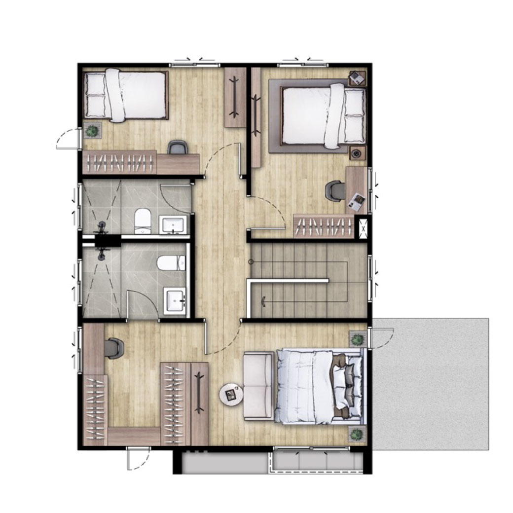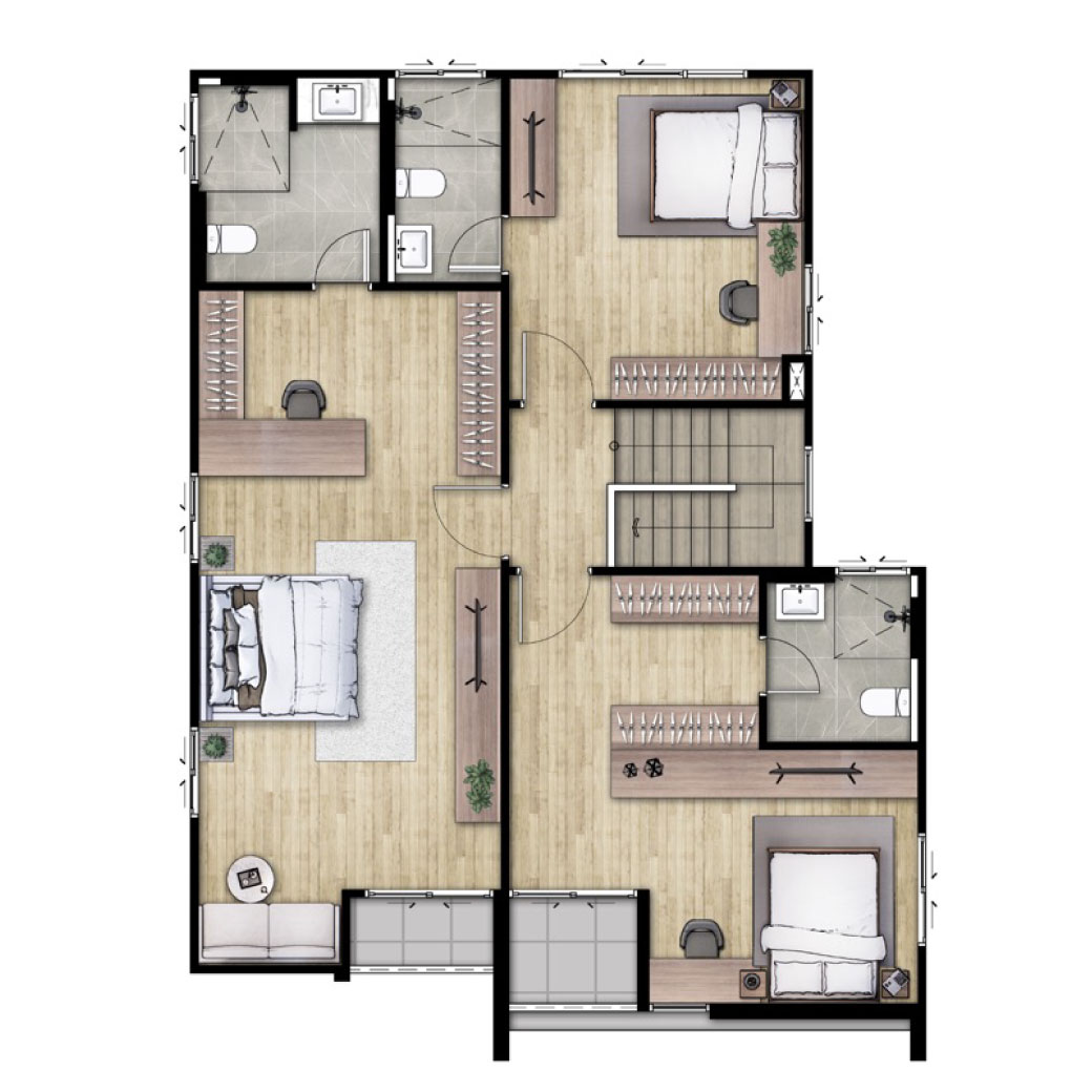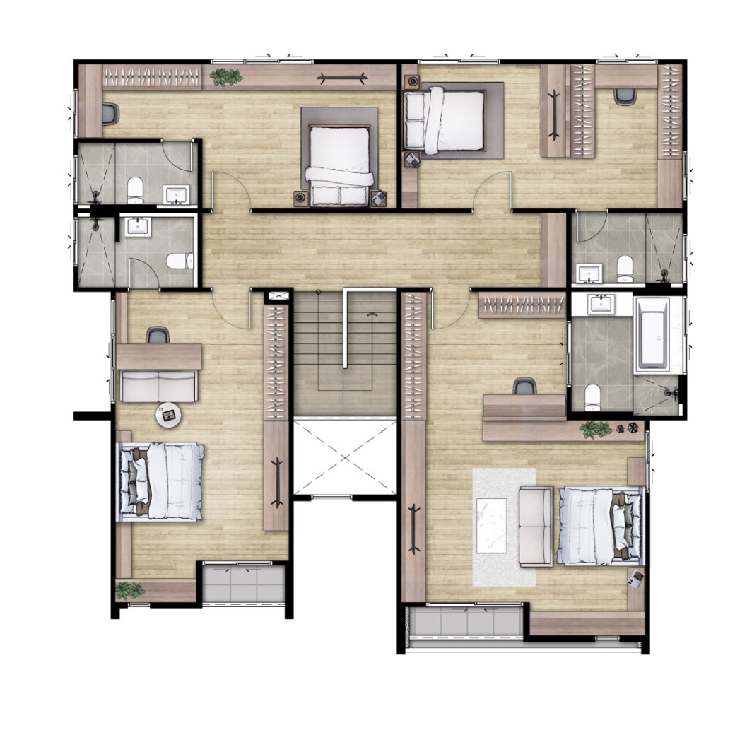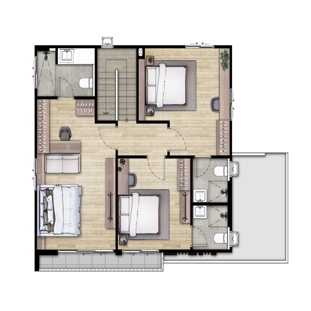 บ้านเดี่ยวสำหรับทุกคนในครอบครัว ด้วยพื้นที่ฟังก์ชั่นที่ออกแบบอย่างลงตัว เพราะทุกห้องนอน เปรียบเสมือน Master Bedroom ด้วยฟังก์ชั่น 4 ห้องนอน 4 ห้องน้ำ