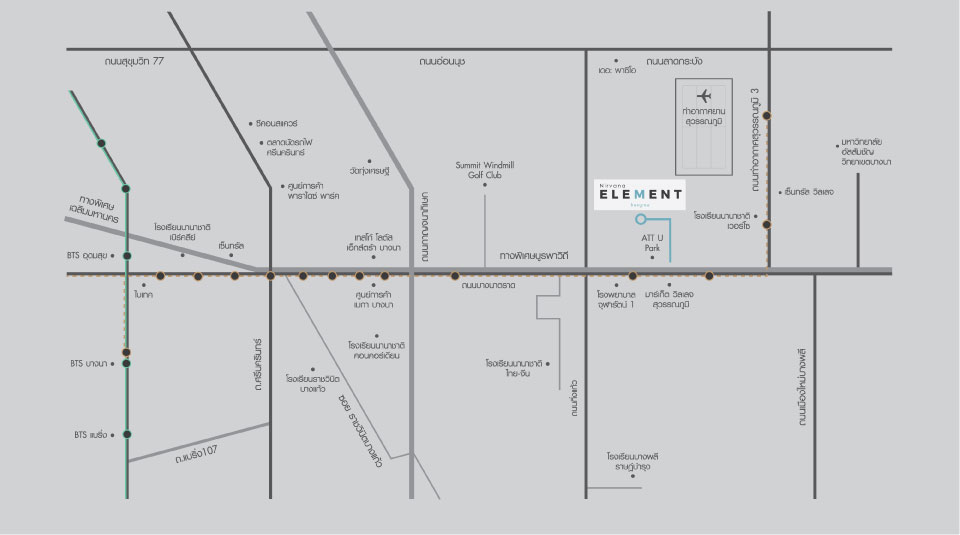 ถนนบางนา-ตราดถนนกิ่งแก้วถนนสุวรรณภูมิ 3ทางด่วนบูรพาวิถีรถไฟฟ้า BTS สถานีบางนารถไฟฟ้า BTS สถานีอุดมสุข