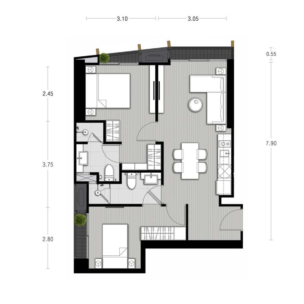 แบบบ้าน : MONACO พื้นที่ใช้สอย 156 ตร.ม.** 3 ห้องนอน พร้อมระเบียงชมวิว 3 ห้องน้ำ 1 ห้องรับแขก ส่วนเตรียมอาหาร ครัวแยกสัดส่วน ที่จอดรถ 2 คัน แบบบ้าน : PARIS