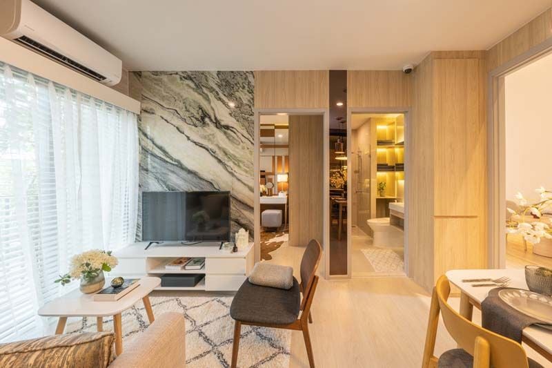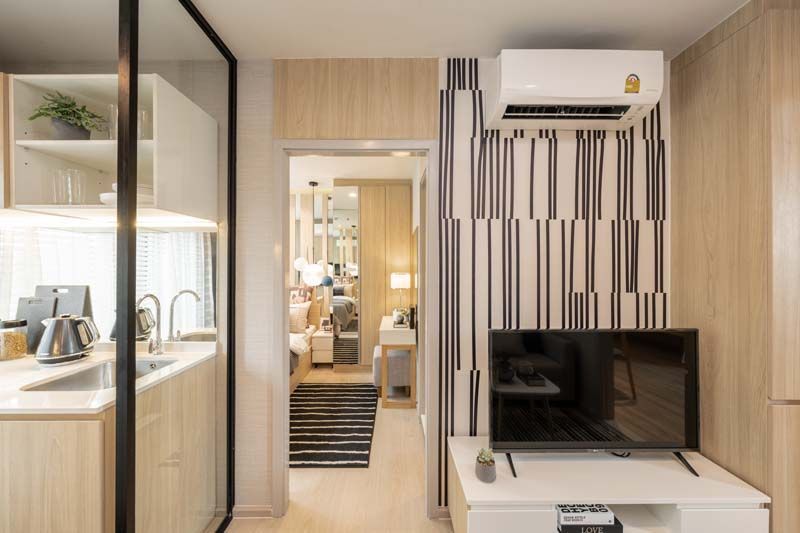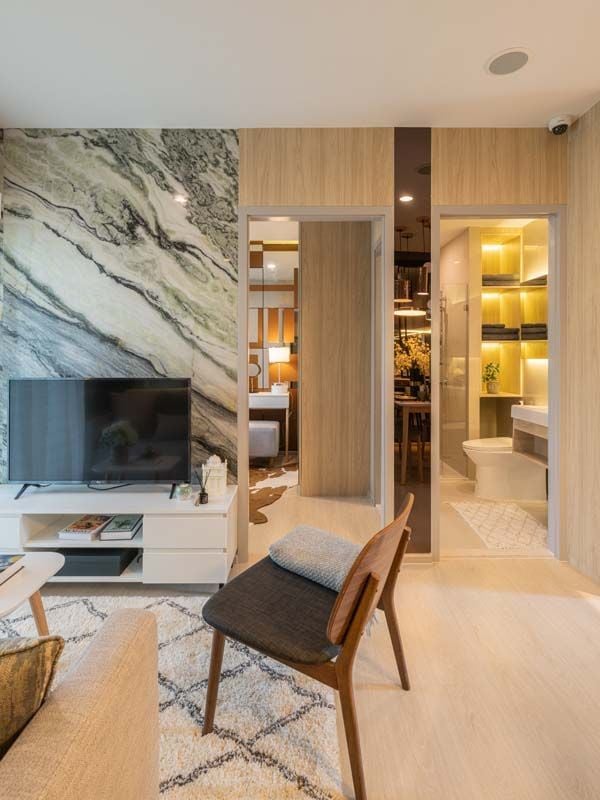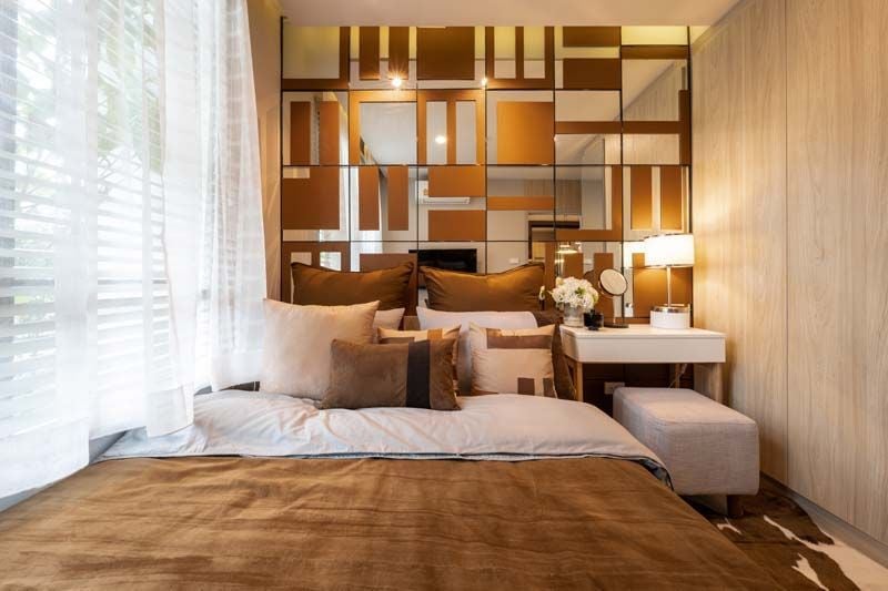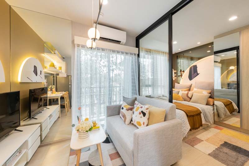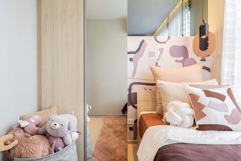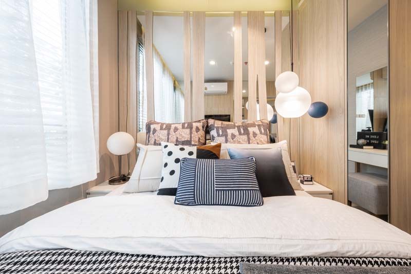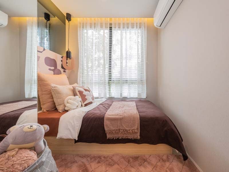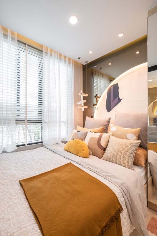 ห้องนอนจะมีประตูกระจกบานสไลด์ 3 ตอน กั้นพื้นที่ออกจากส่วนอื่น ๆ ของห้อง ให้ความเป็นสัดส่วน ซึ่งเราสามารถติดตั้งม่านเพิ่มเติมเพื่อเพิ่มความเป็นส่วนตัวไ