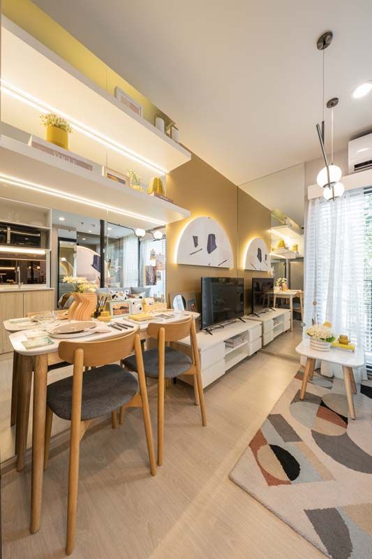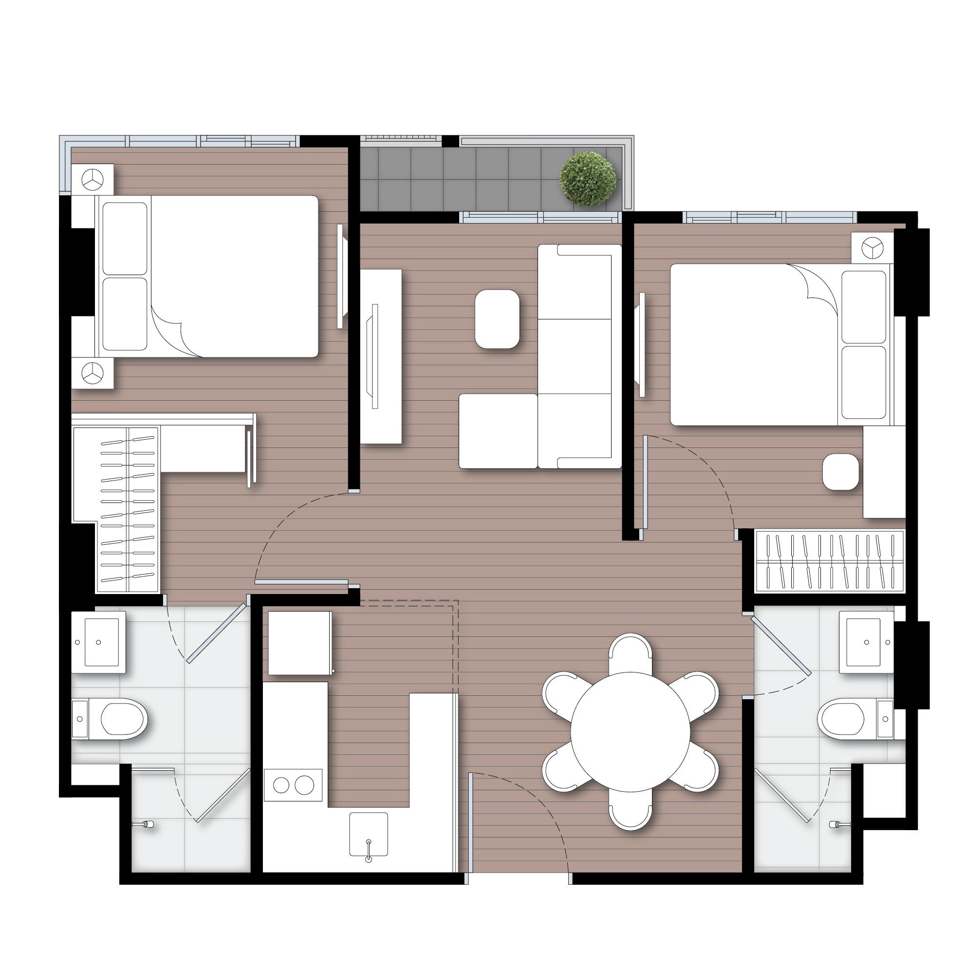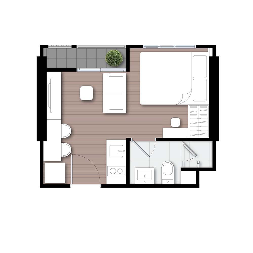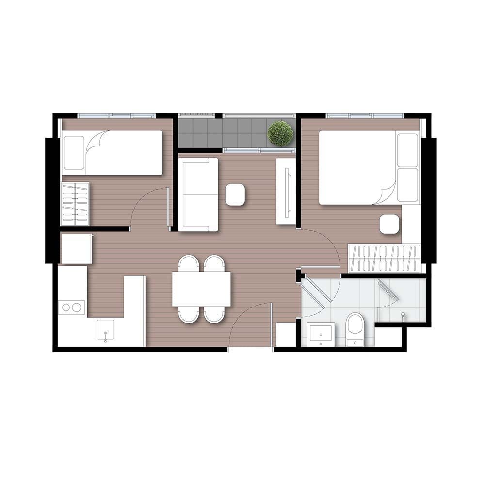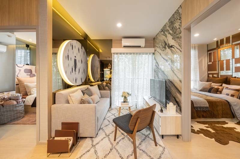 ห้องนอนจะมีประตูกระจกบานสไลด์ 3 ตอน กั้นพื้นที่ออกจากส่วนอื่น ๆ ของห้อง ให้ความเป็นสัดส่วน ซึ่งเราสามารถติดตั้งม่านเพิ่มเติมเพื่อเพิ่มความเป็นส่วนตัวไ