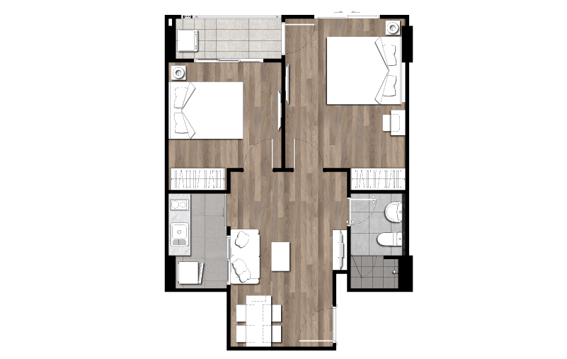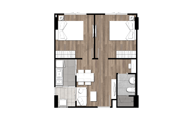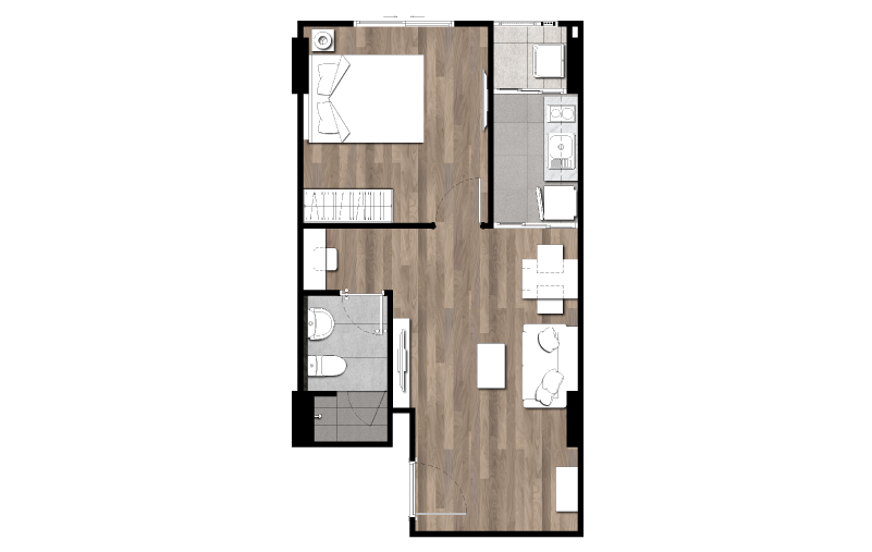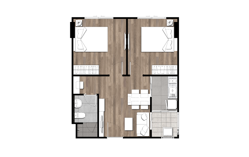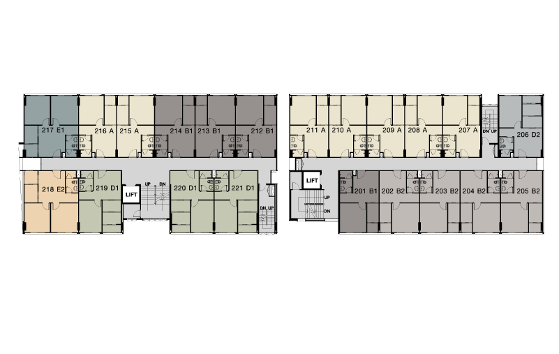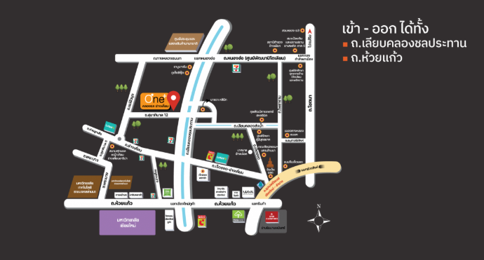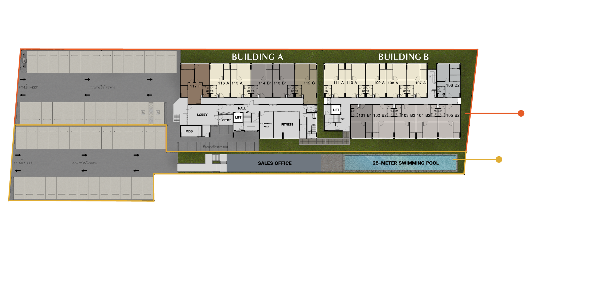 ผังโครงการ ชั้นล่าง : โถงทางเข้าอาคาร, สวนรวมใจ, ฟิตเนสโซน(สระว่ายน้ำ, ห้องออกกำลังกาย)ห้องเรียนรู้, ห้องคุณหนู, ห้องชุดพักอาศัย, ห้องเครื่อง และที่จอดรถชั้น 2-4