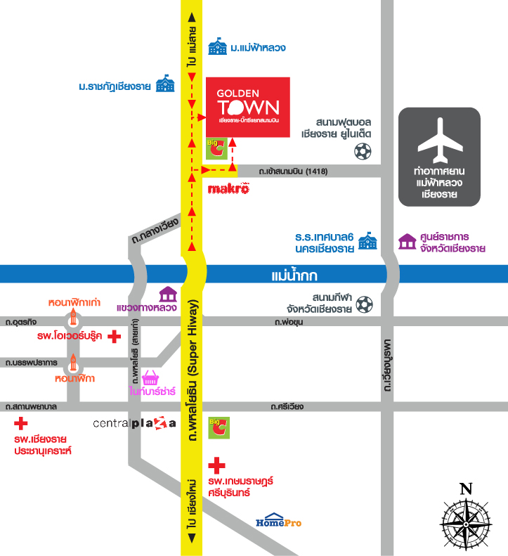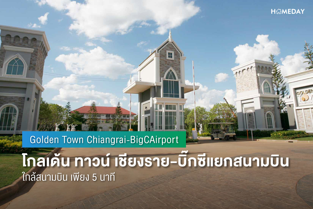 "โกลเด้น ทาวน์ เชียงราย-บิ๊กซีแยกสนามบิน (Golden Town Chiangrai-BigCAirport) สวย GOOD DESIGN ด้วยกลิ่นอายสถาปัตยกรรมยุโรปร่วมสมัย ให้ความโอ่อ่า หรูหรา ครบ FULLY FUNCTIONAL เหนือกว่าด้วยฟังก์ชันเพื่อการอยู่อาศัยที่ครบครัน พร้อมที่จอดรถ พื้นที่จัดสวน และฟังก์ซันพิเศษ อาทิ ห้องพระ, ห้องซัก ตาก รีด Glass House Laundry, ห้องนอนชั้นล่างที่ปรับเปลี่ยนได้, ห้องพักผ่อนชั้นบน, 3 ห้องนอนชั้นบน พร้อมห้องน้ำในตัว เป็นต้น"