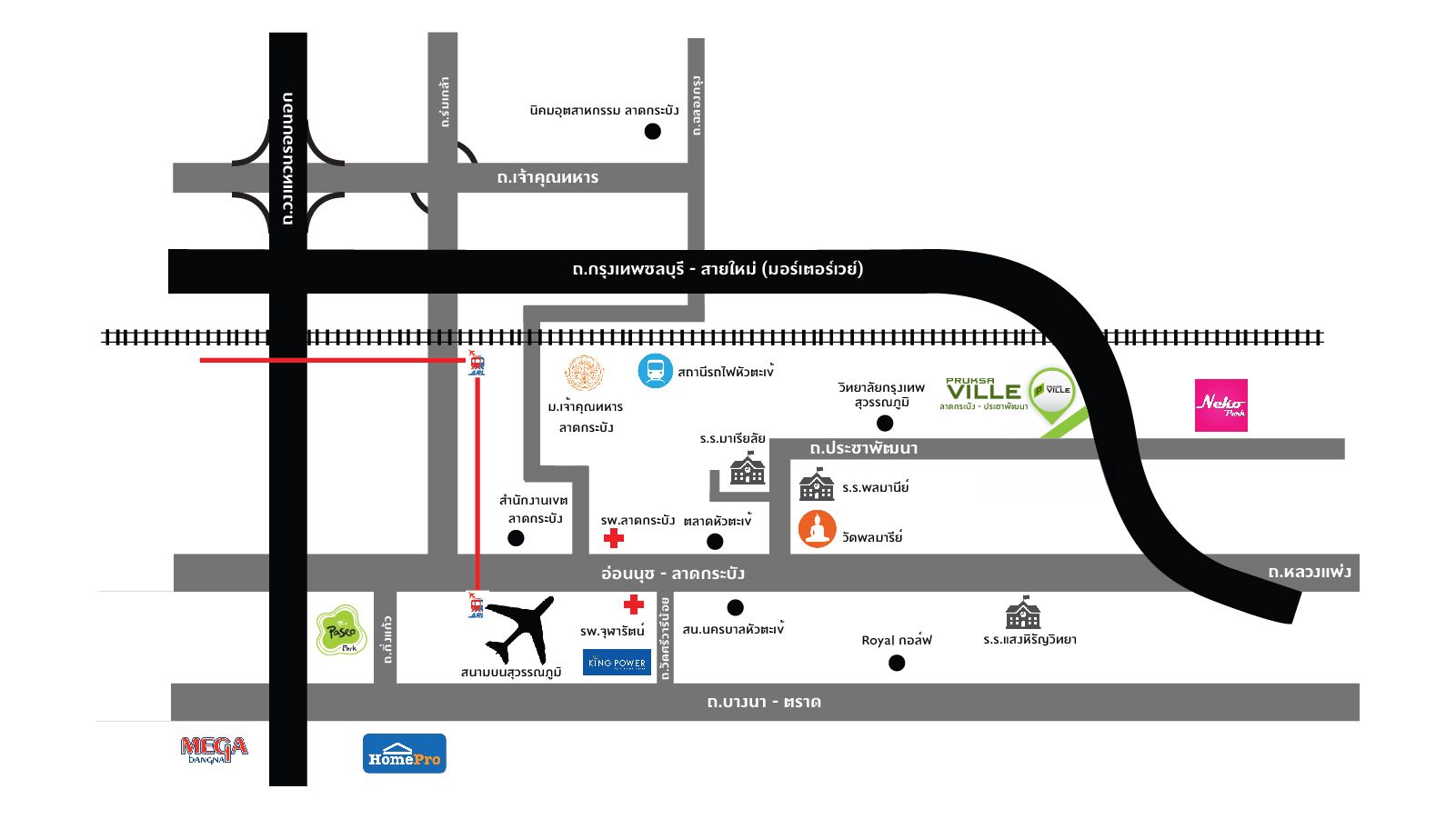 การเดินทางถนนกาญจนาภิเษก (วงแหวนรอบนอก) ห้างสรรพสินค้าอินเด็กซ์ ลิฟวิ่งมอลล์ บางกรวย-ไทรน้อยแม็คโคร บางบัวทองเทสโก้ โลตัส บางกรวย – ไทรน้อย แบบบ้าน : ศุภโชติ