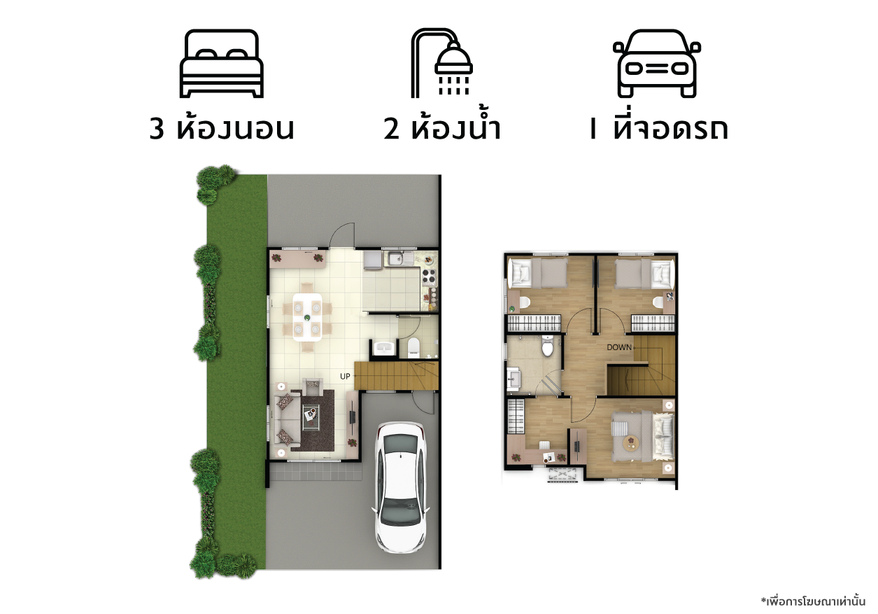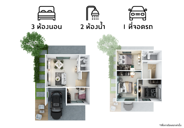 แบบบ้าน : MIRA พื้นที่ใช้สอย 105.42 ตร.ม 2 ห้องนอน 3 ห้องน้ำ 2 ที่จอดรถ แบบบ้าน : OLIVIA พื้นที่ใช้สอย 149.19 ตร.ม. 3 ห้องนอน 4 ห้องน้ำ 1 ห้องอเนกประสงค์ ที่จอดรถ 2 คัน