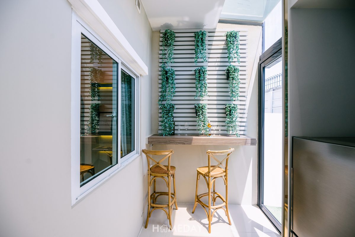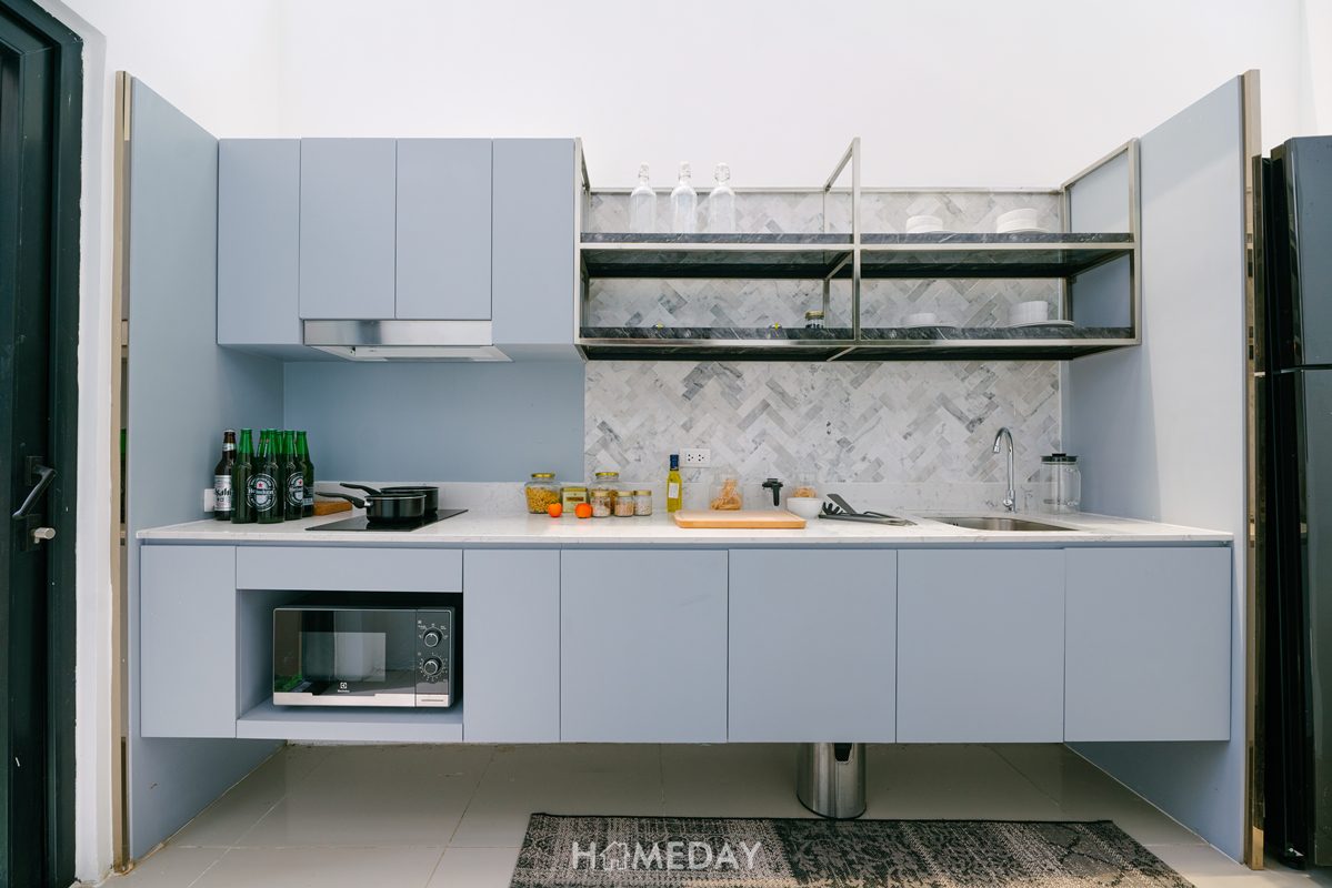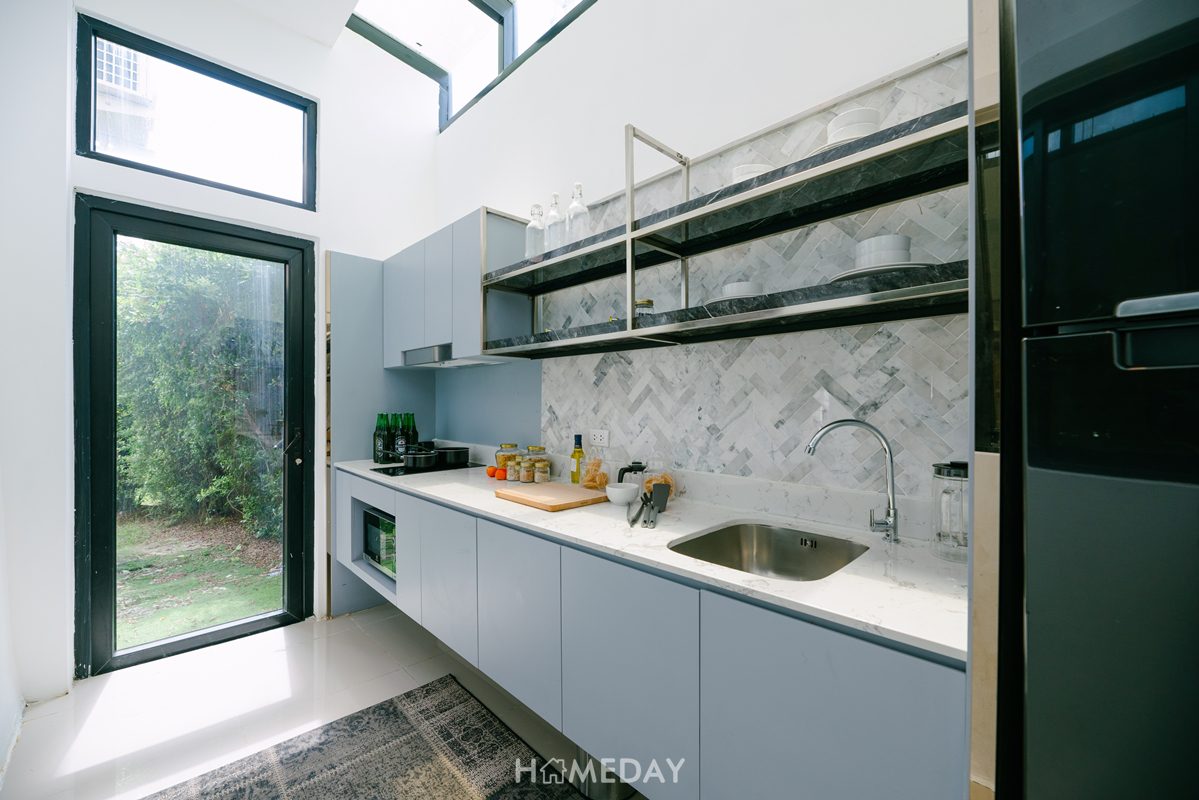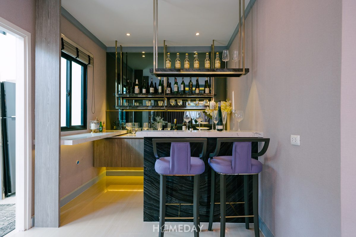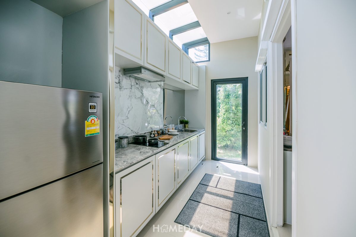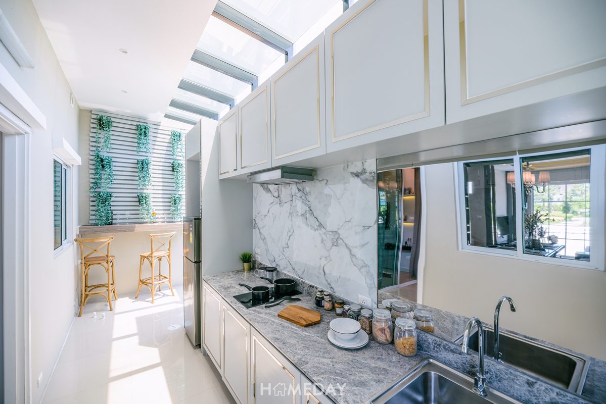 พื้นที่ด้านหลังบ้านสามารถต่อเติมเป็นครัว โดยวางเครื่องครัวและเครื่องใช้ไฟฟ้าได้สบายๆ หรือจะทำเป็นมุมกาแฟเล็กๆเอาไว้จิบกาแฟยามเช้านั่งชิลล์ยามเย็นก็ได้ตามไอเดียของผู้อยู่อาศัย