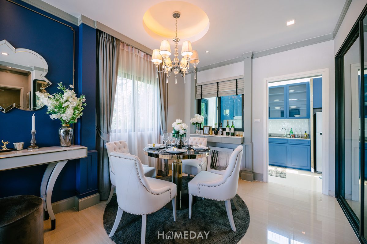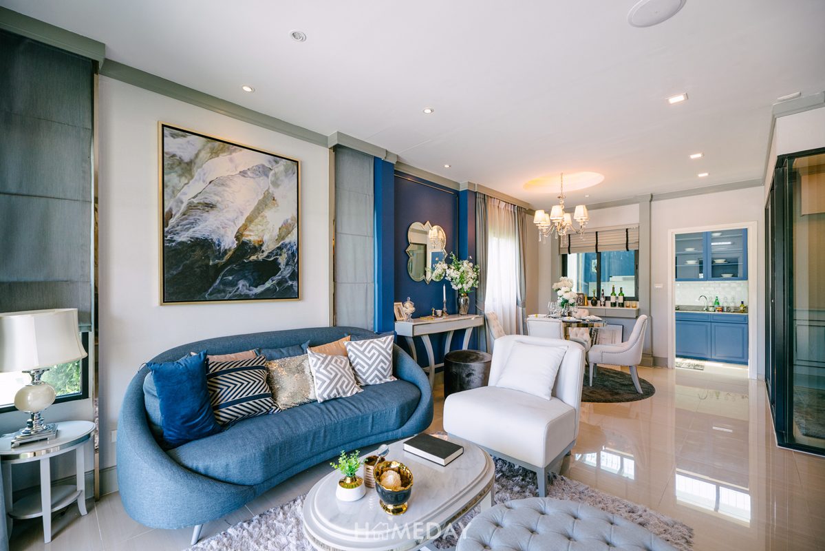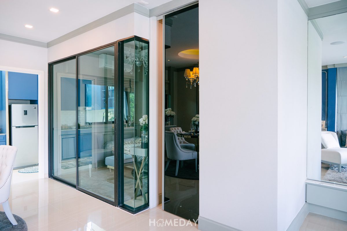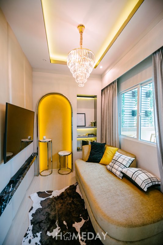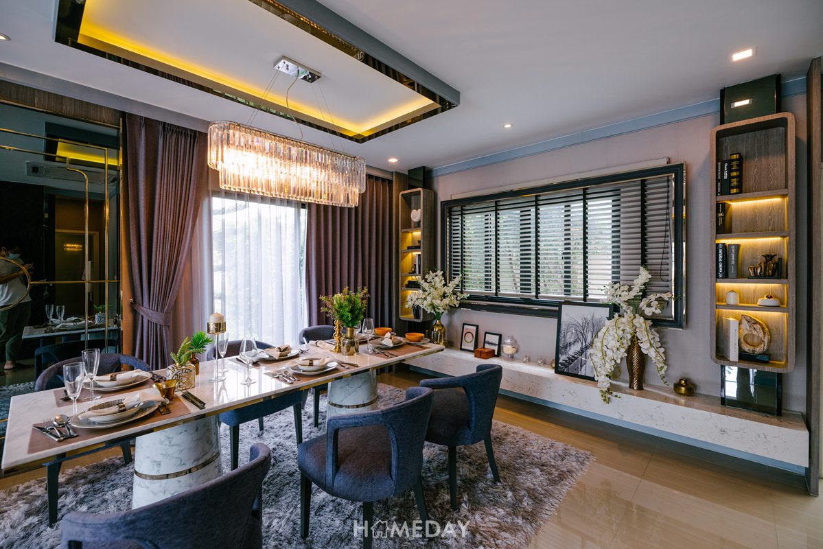 เริ่มต้นกันที่โซนห้องรับแขกหรือโซนนั่งเล่นที่มีขนาดกว้างขวาง สามารถตกแต่งได้ตามสไตล์ของผู้อยู่อาศัย ถัดมาจะจัดวางเป็นโซนรับประทานอาหาร สามารถวางโต๊ะรับประทานอาหาร ขนาด 4 – 6 ที่นั่ง และบิวท์อินเพิ่มเติมเป็นครัวหรือที่นั่งได้ เรียกได้ว่าใช้พื้นที่ได้อย่างลงตัวและคุ้มค่าเลยค่ะ