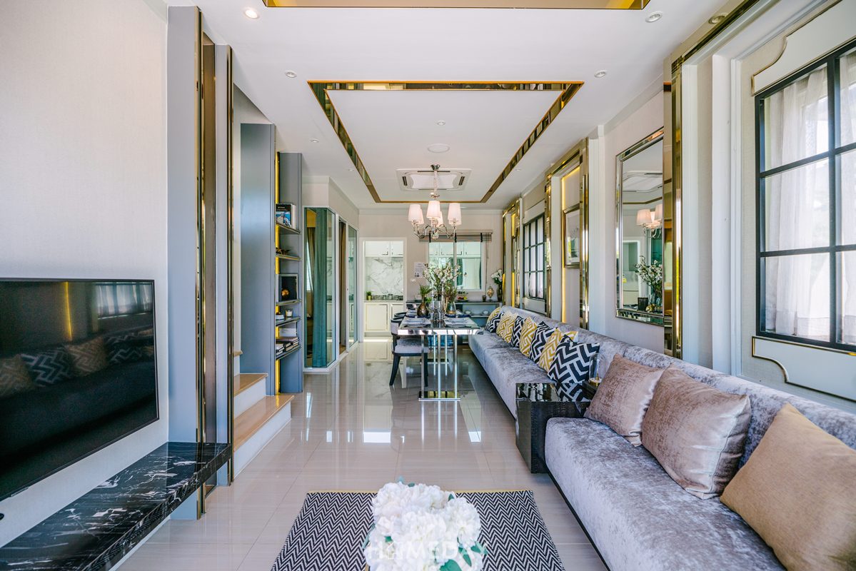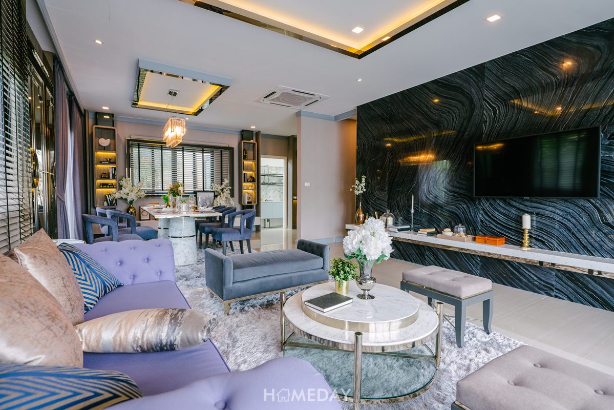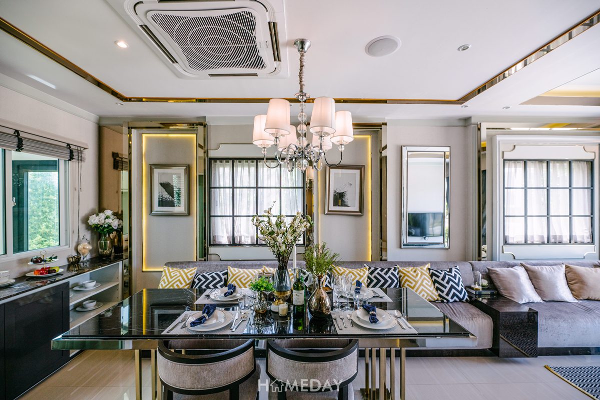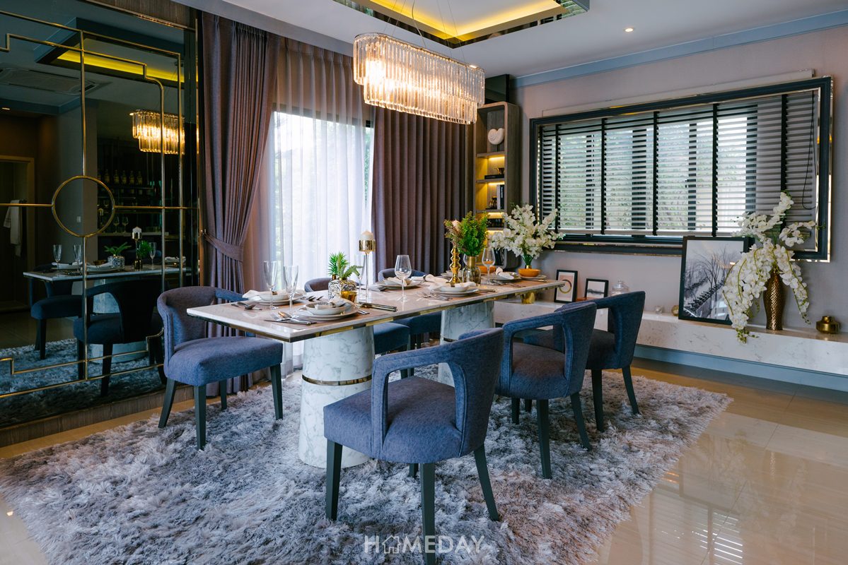 เริ่มต้นกันที่โซนห้องรับแขกหรือโซนนั่งเล่นที่มีขนาดกว้างขวาง สามารถตกแต่งได้ตามสไตล์ของผู้อยู่อาศัย ถัดมาจะจัดวางเป็นโซนรับประทานอาหาร สามารถวางโต๊ะรับประทานอาหาร ขนาด 4 – 6 ที่นั่ง และบิวท์อินเพิ่มเติมเป็นครัวหรือที่นั่งได้ เรียกได้ว่าใช้พื้นที่ได้อย่างลงตัวและคุ้มค่าเลยค่ะ