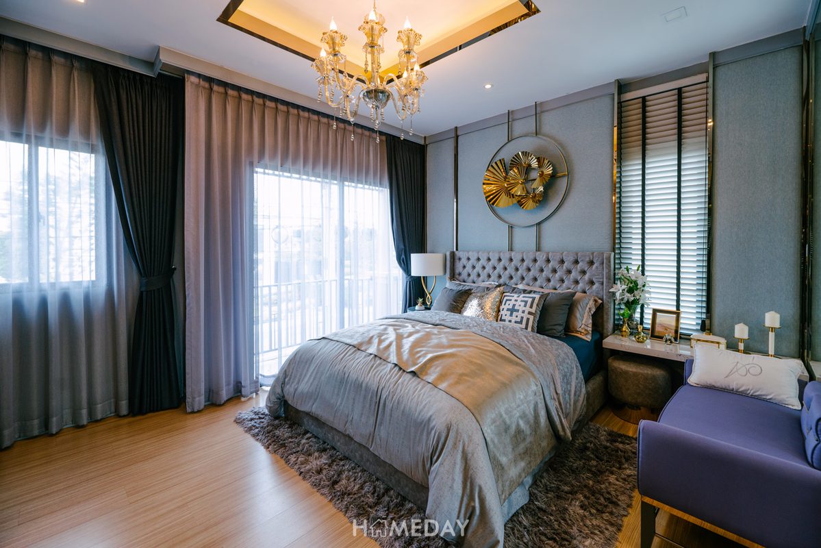ห้องนอนใหญ่ของบ้าน พื้นที่ใช้งานกว้างขวาง สามารถวางแต่งได้ 5 – 6 ฟุต และยังเหลือพื้นที่สำหรับวางโต๊ะหัวเตียงหรือของตกแต่งอื่นๆได้ อีกฝั่งจะเป็นพื้นที่ระเบียงขนาดพอประมาณ ให้สามารถวางต้นไม้หรือออกไปยืนเล่นรับลมชมวิวได้ ถัดมาจะเป็นส่วนของ walk-in closet จะแต่งเป็นตู้เสื้อผ้า โต๊ะเครื่องแป้ง หรือใช้ห้องนี้เป็นห้องแต่งตัวก็ได้ตามใจชอบ