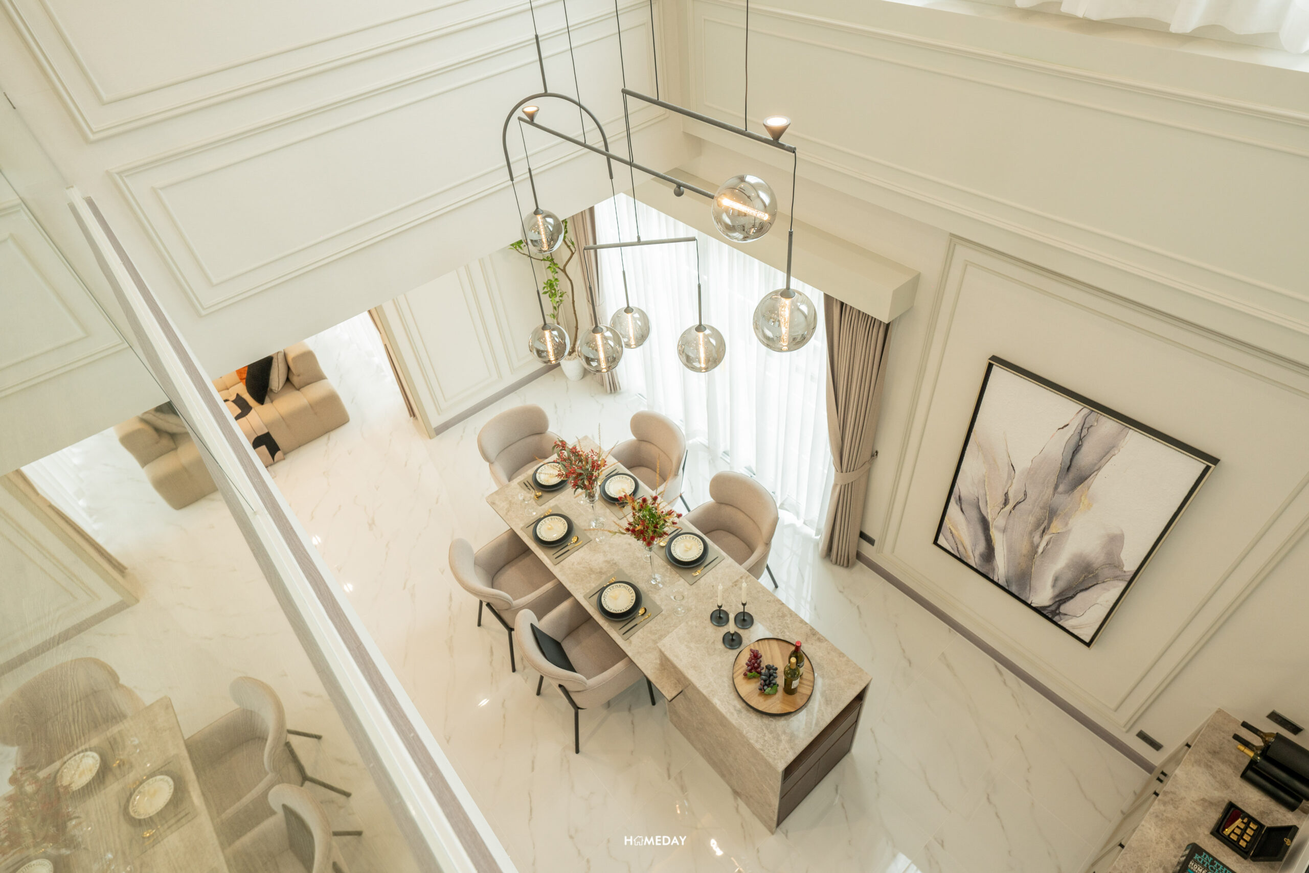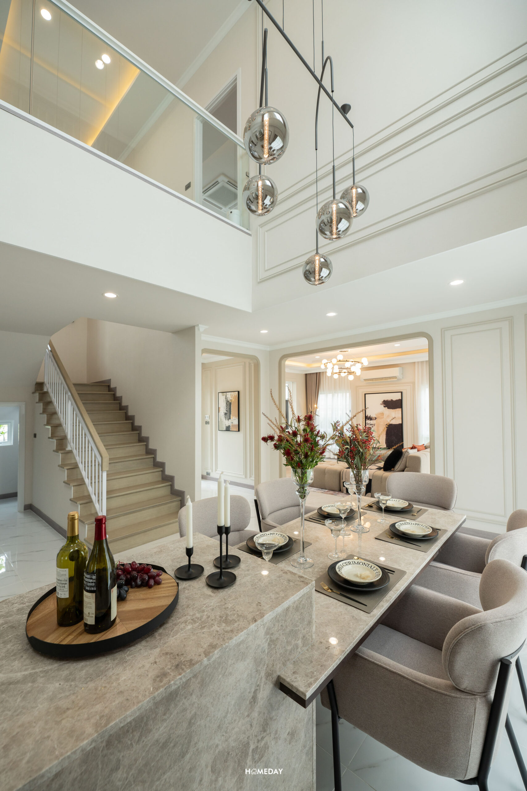 เชื่อมต่อพื้นที่แบบเปิดโล่งไปยัง Highlight จุดที่ 2 อย่าง Double Volume Dining Area ที่สูงถึง 6.3 เมตร ช่วยในการไหลเวียนอากาศภายในบ้าน และเปิดทัศนวิสัยทางสายตา สร้างความรู้สึกว่าบ้านดูโปร่งโล่ง ทำให้บ้านมีชีวิตชีวา เพราะสมาชิกในบ้านได้ Connect กันที่พื้นที่ส่วนรวมทั้ง 2 จุดของบ้าน