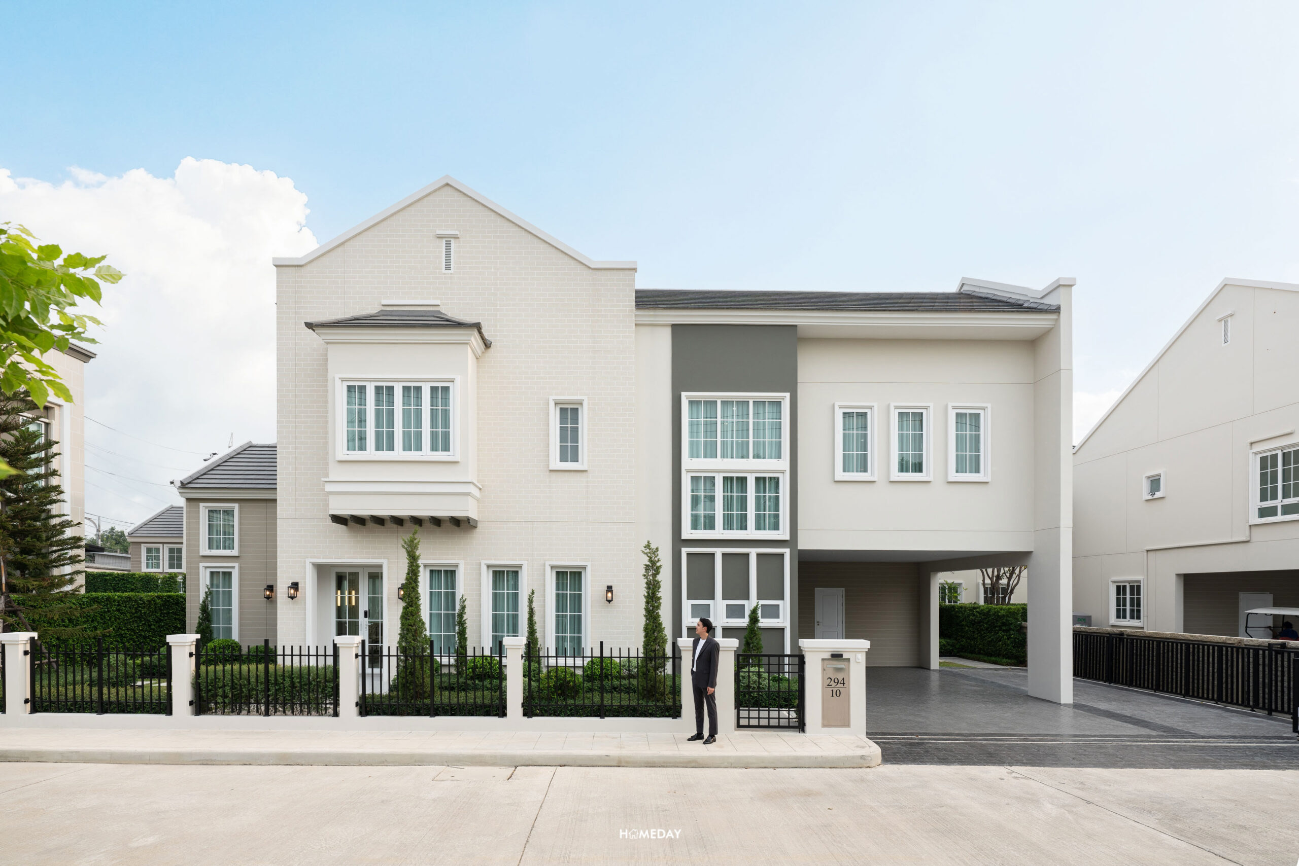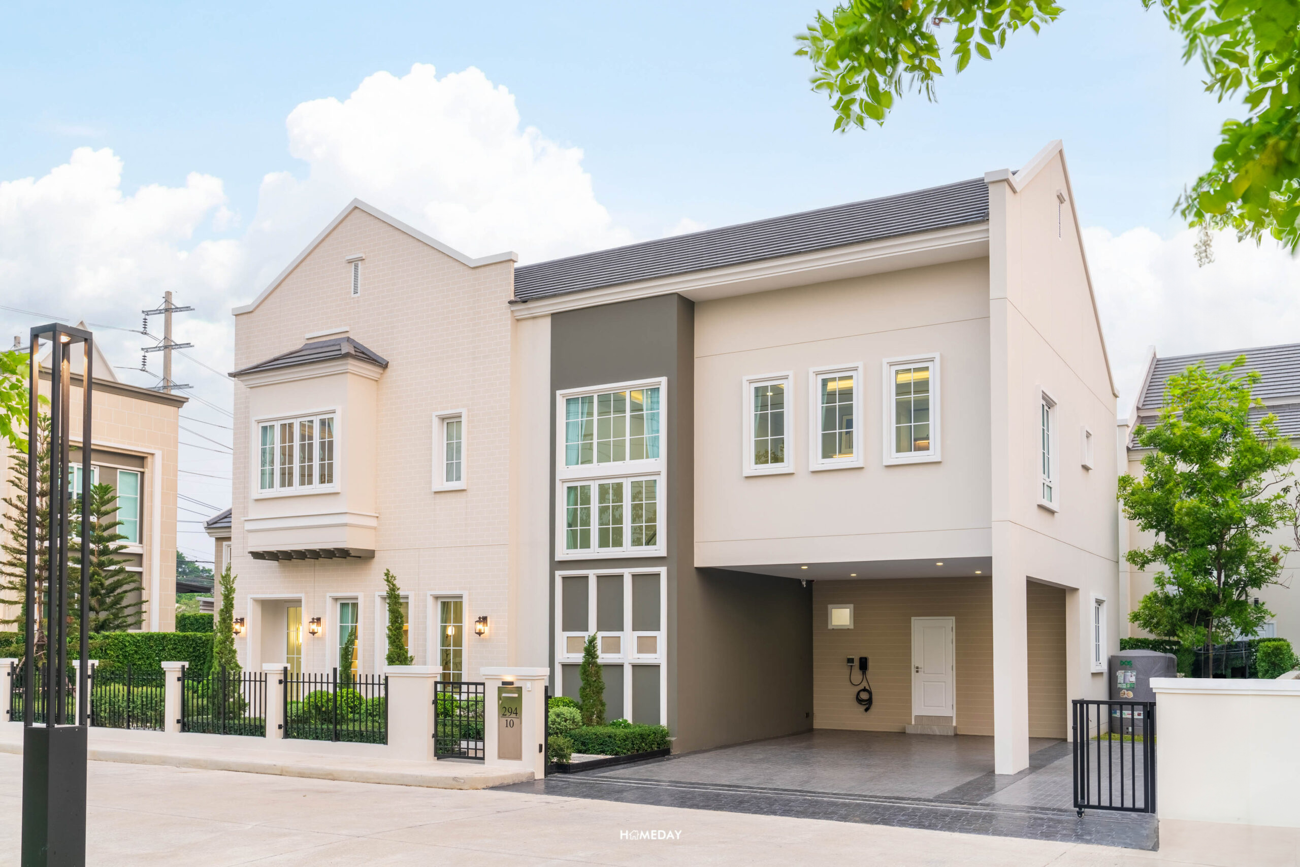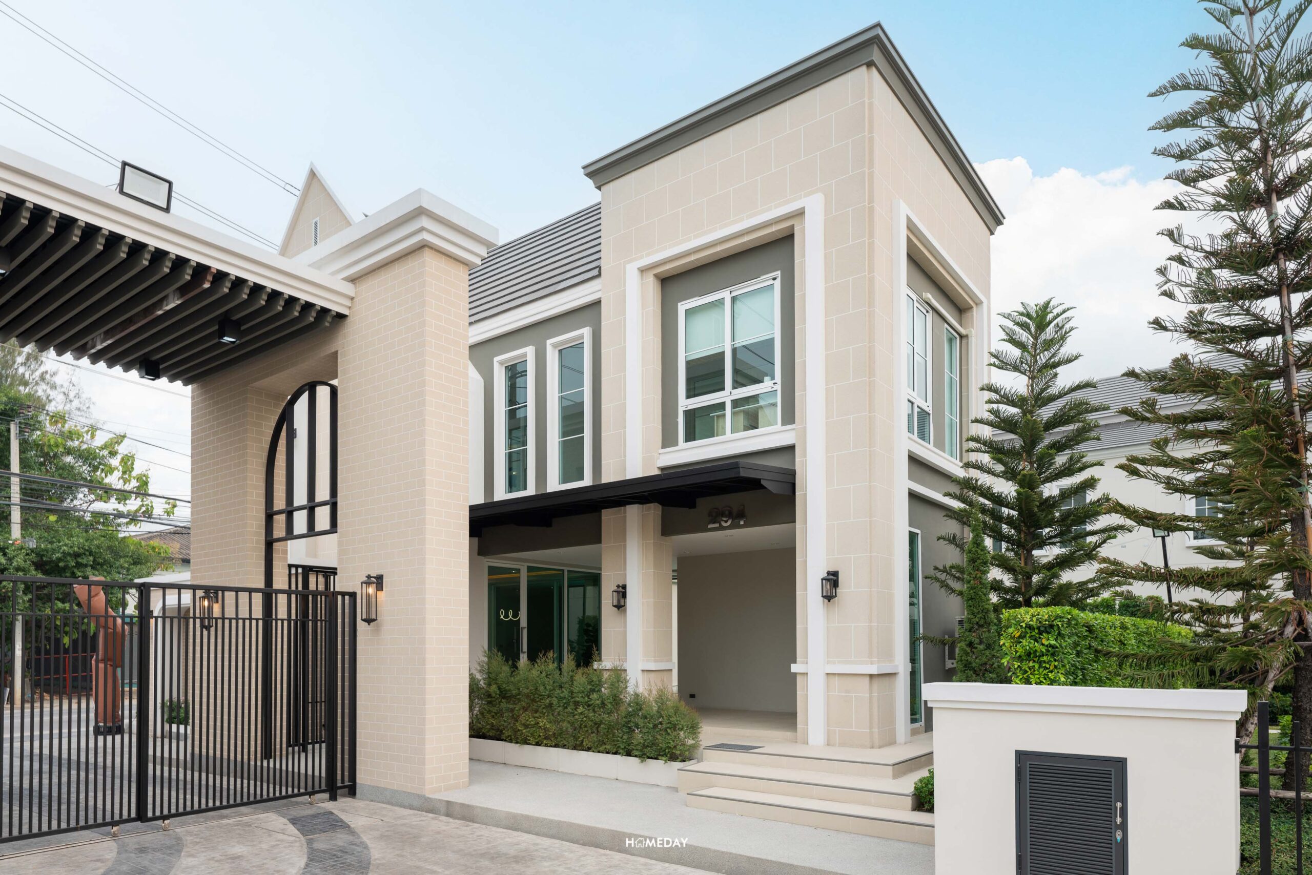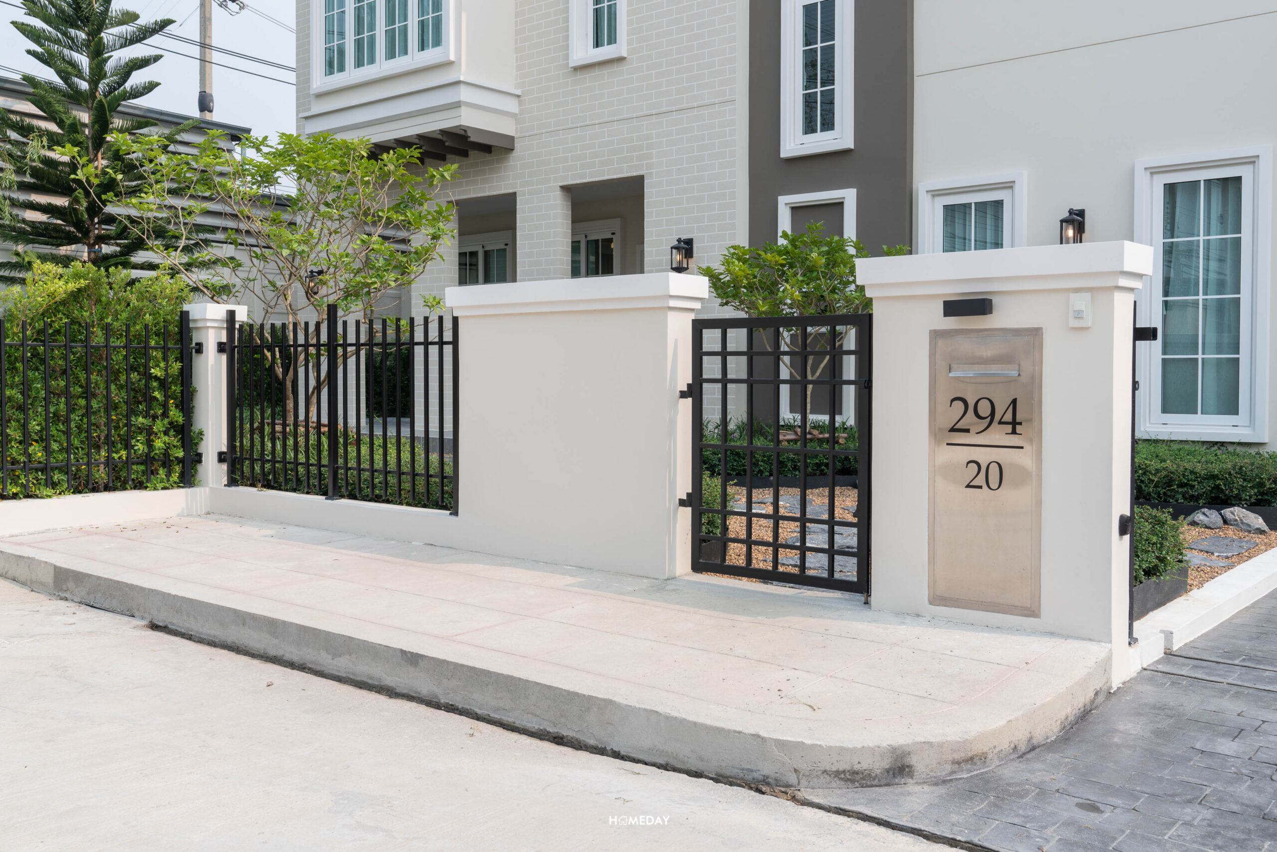 หน้าบ้านจะมีประตูรั้วเหล็กไว้สำหรับเดินเข้า-ออก พร้อมกริ่งไร้สายและไฟกิ่ง ตัว Mail Box ก็ให้มาด้วยครับ เป็นวัสดุทำจาก Stainless steel ตัดด้วยตัวเลขสีดำของเลขที่บ้าน “294” บ้านทุกหลังในโครงการจะมีการปรับพื้นรอบบ้านและจัดสวนมาตรฐานมาให้สวยงามครับ