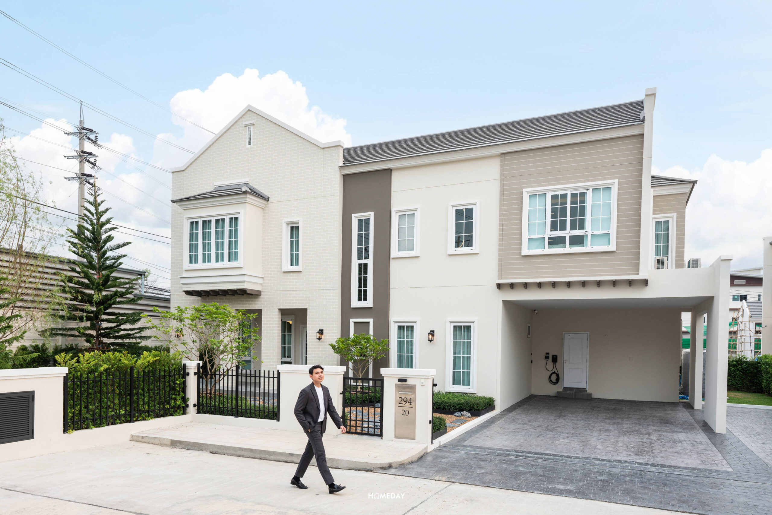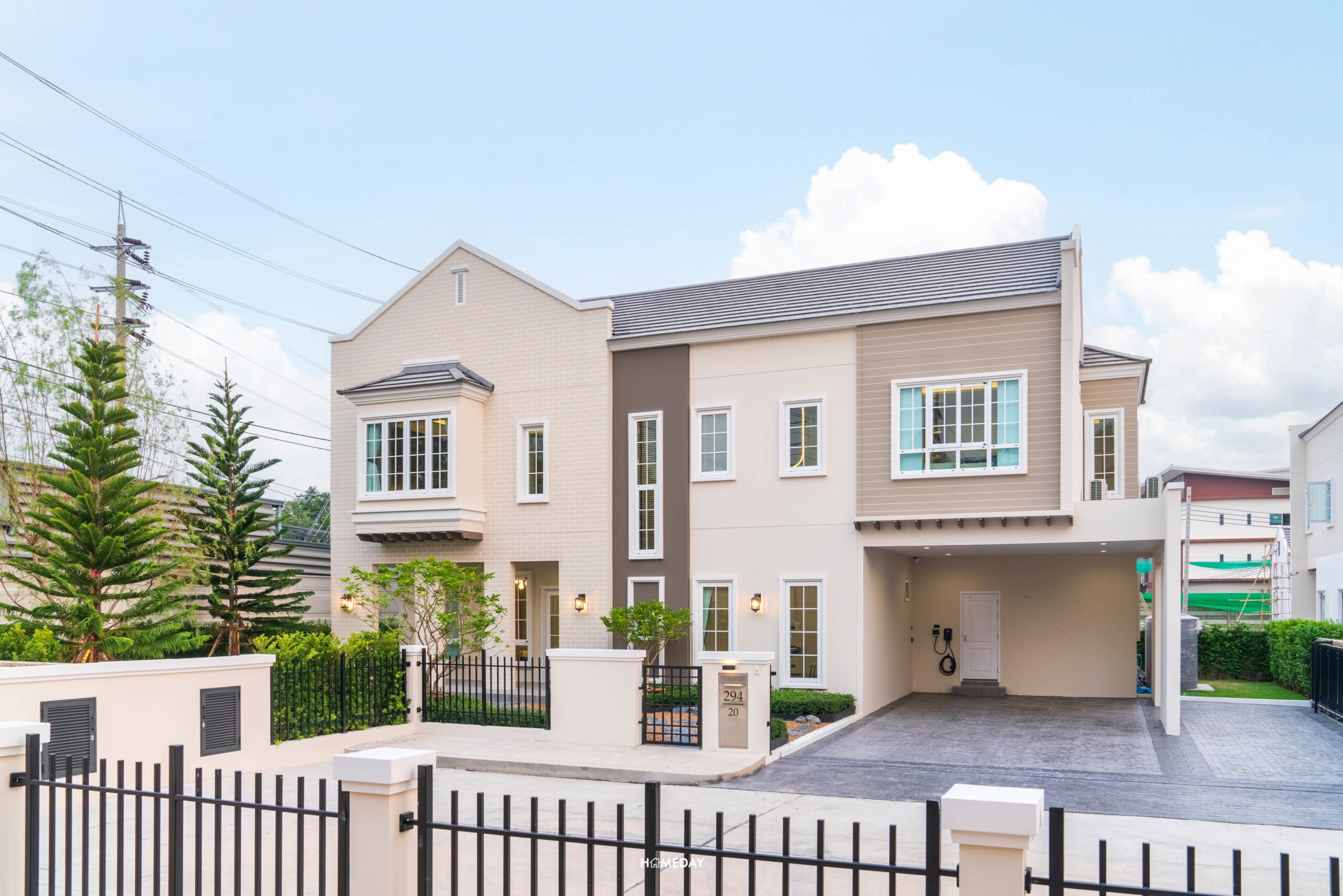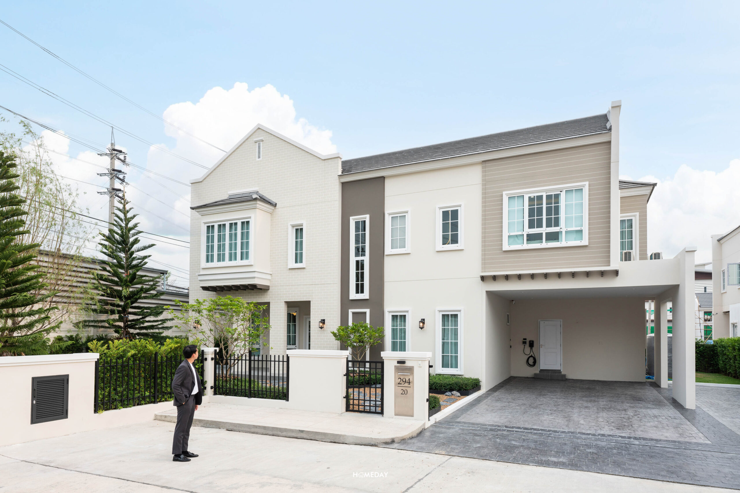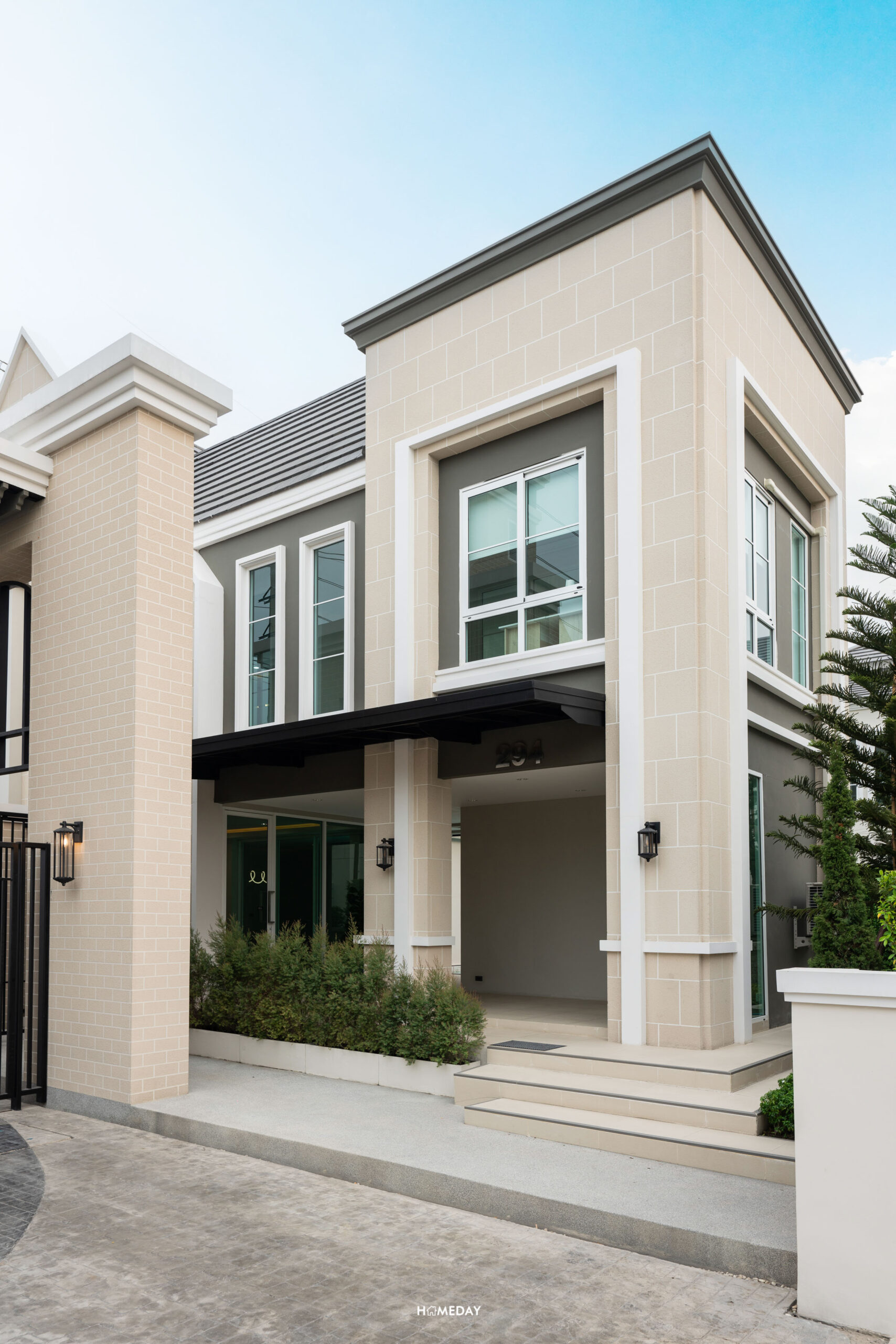 หน้าบ้านจะมีประตูรั้วเหล็กไว้สำหรับเดินเข้า-ออก พร้อมกริ่งไร้สายและไฟกิ่ง ตัว Mail Box ก็ให้มาด้วยครับ เป็นวัสดุทำจาก Stainless steel ตัดด้วยตัวเลขสีดำของเลขที่บ้าน “294” บ้านทุกหลังในโครงการจะมีการปรับพื้นรอบบ้านและจัดสวนมาตรฐานมาให้สวยงามครับ