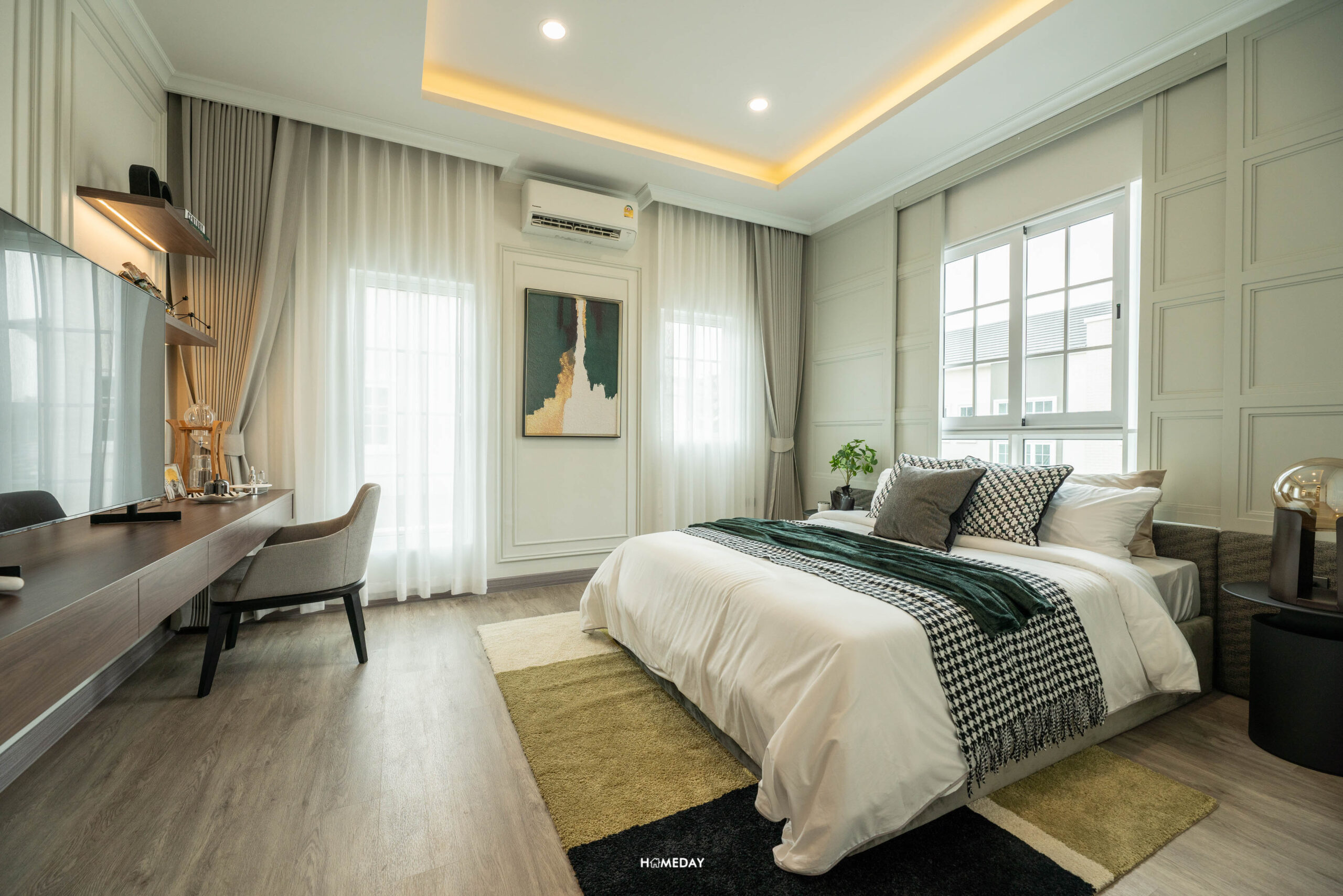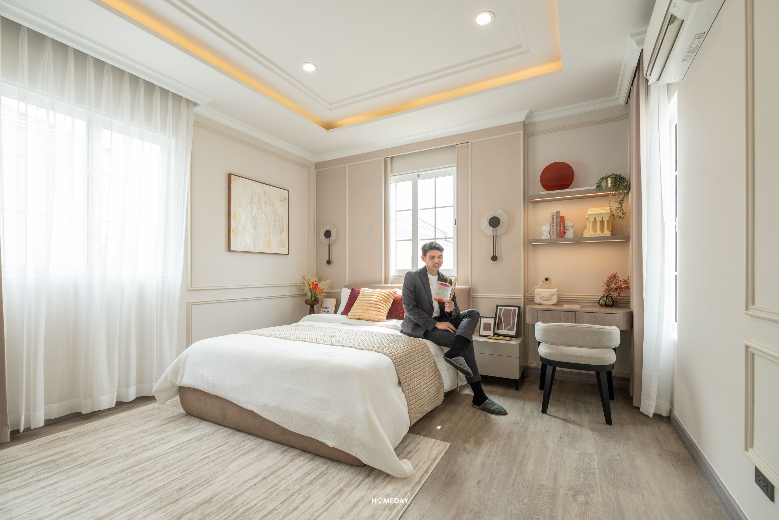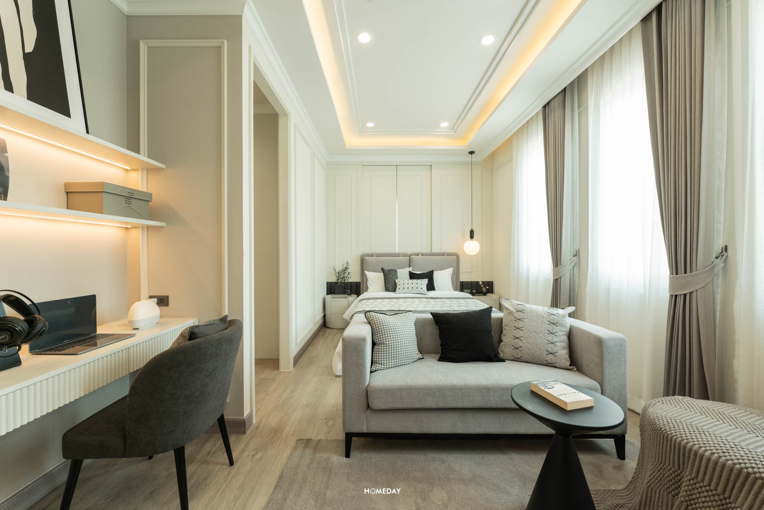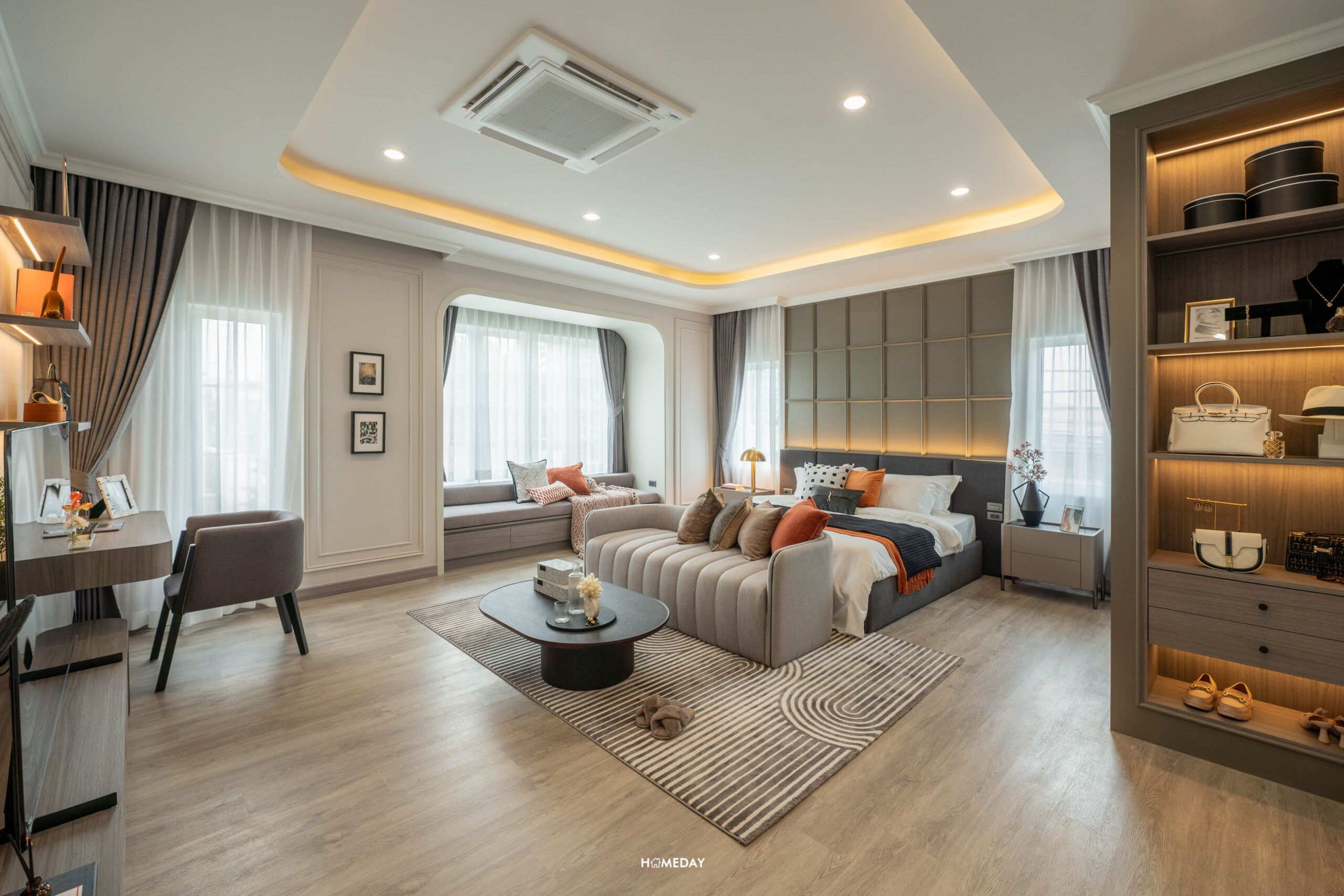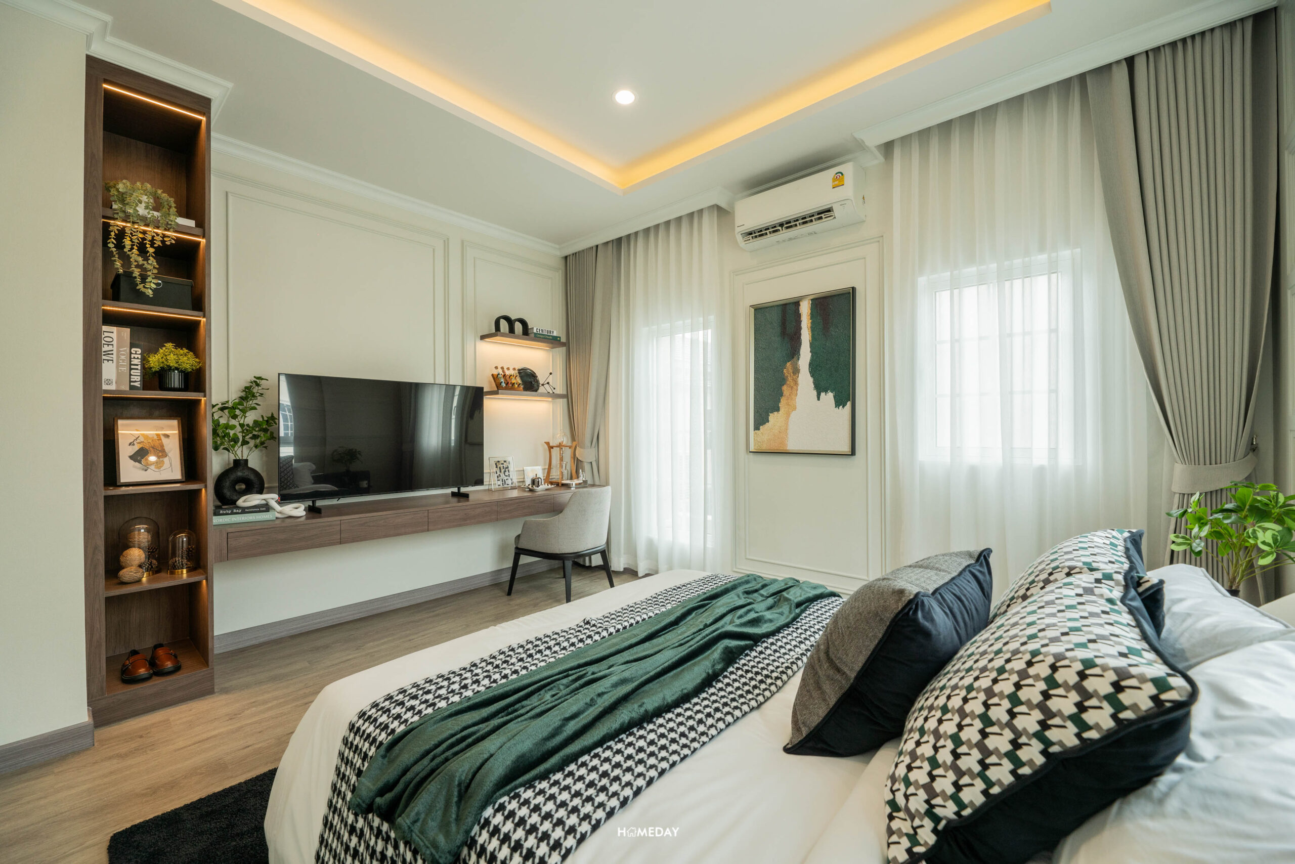 พื้นที่วางเตียงด้านในมีขนาดกว้างขวาง สามารถแบ่งสัดส่วนพื้นที่ใช้สอยได้อย่างลงตัว ได้บานหน้าต่างรับแสงมาถึง 3 บาน สามารถวางเตียงขนาด 5-6 ฟุตได้ ปลายเตียง Built-in เป็นตู้โชว์และชั้นวางทีวีได้ เชื่อมต่อทำเป็นโต๊ะทำงานได้อย่างลงตัวเลยครับ