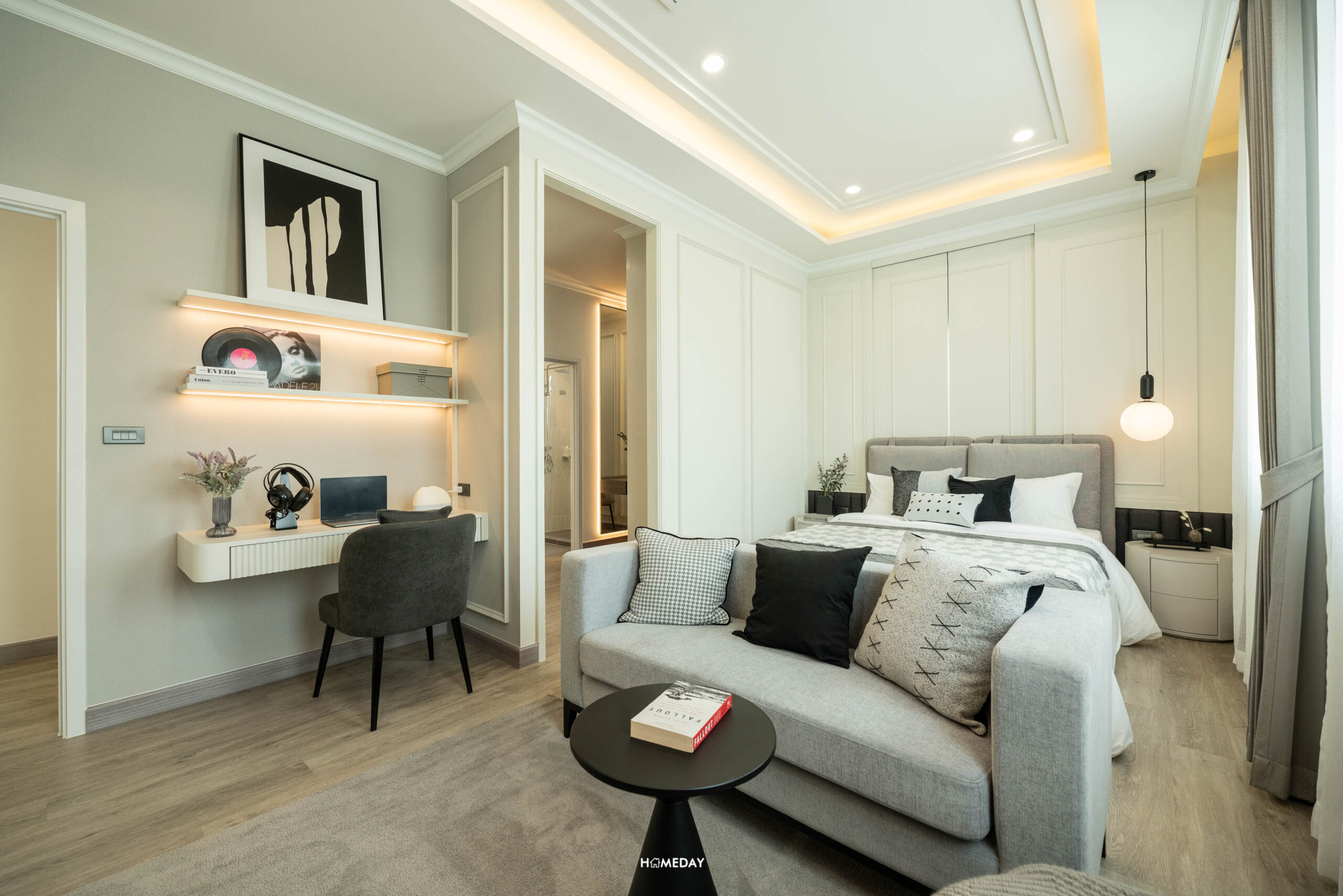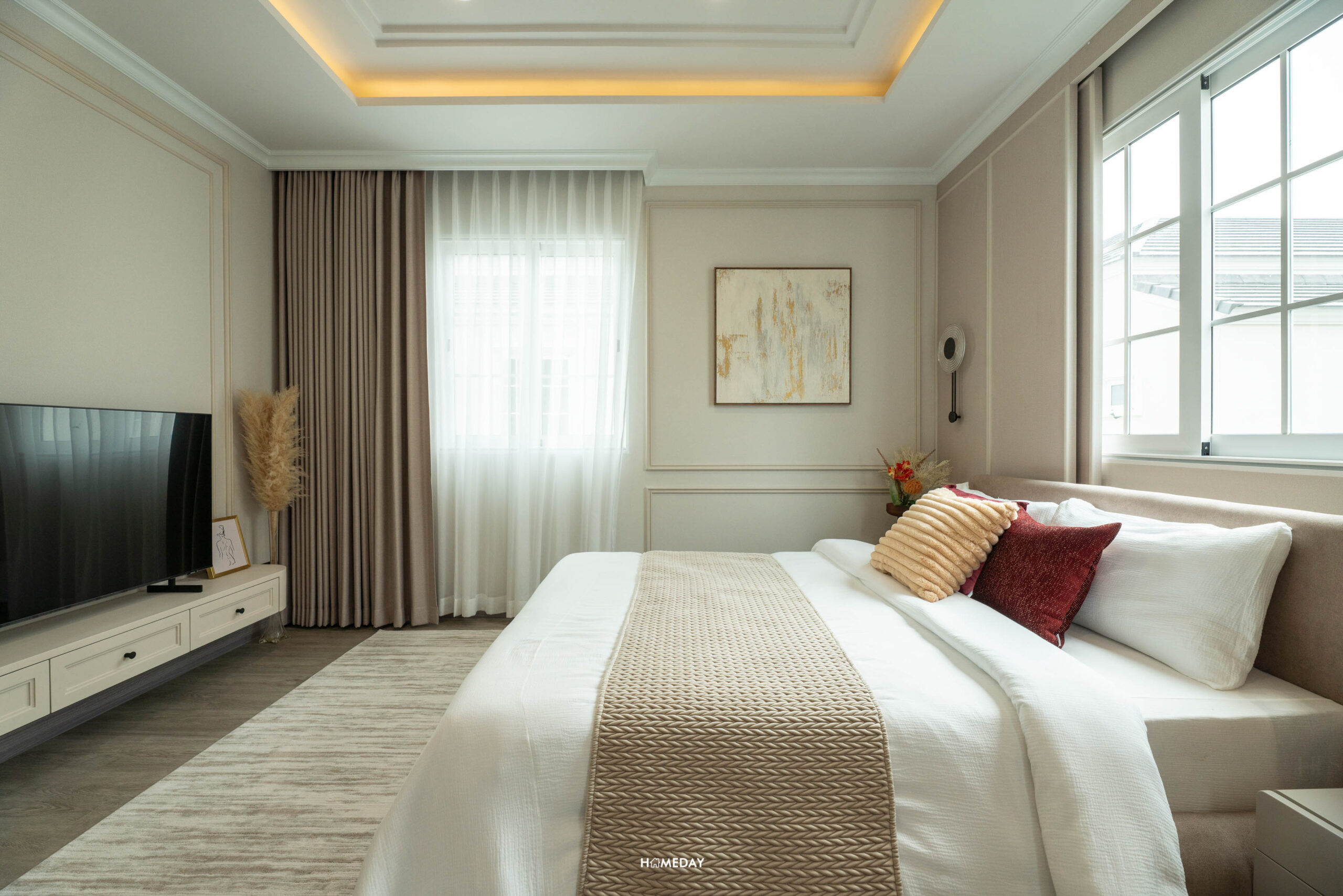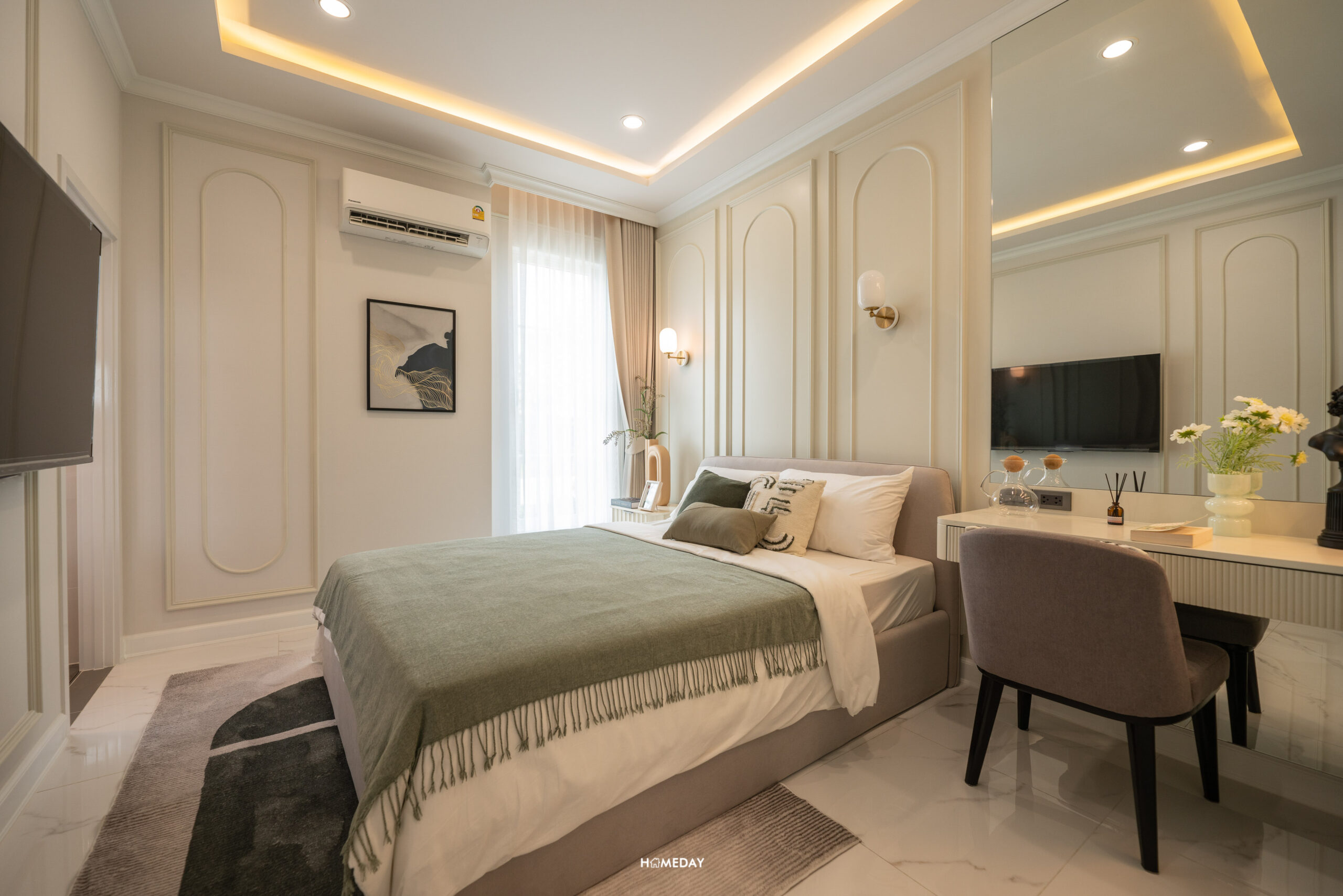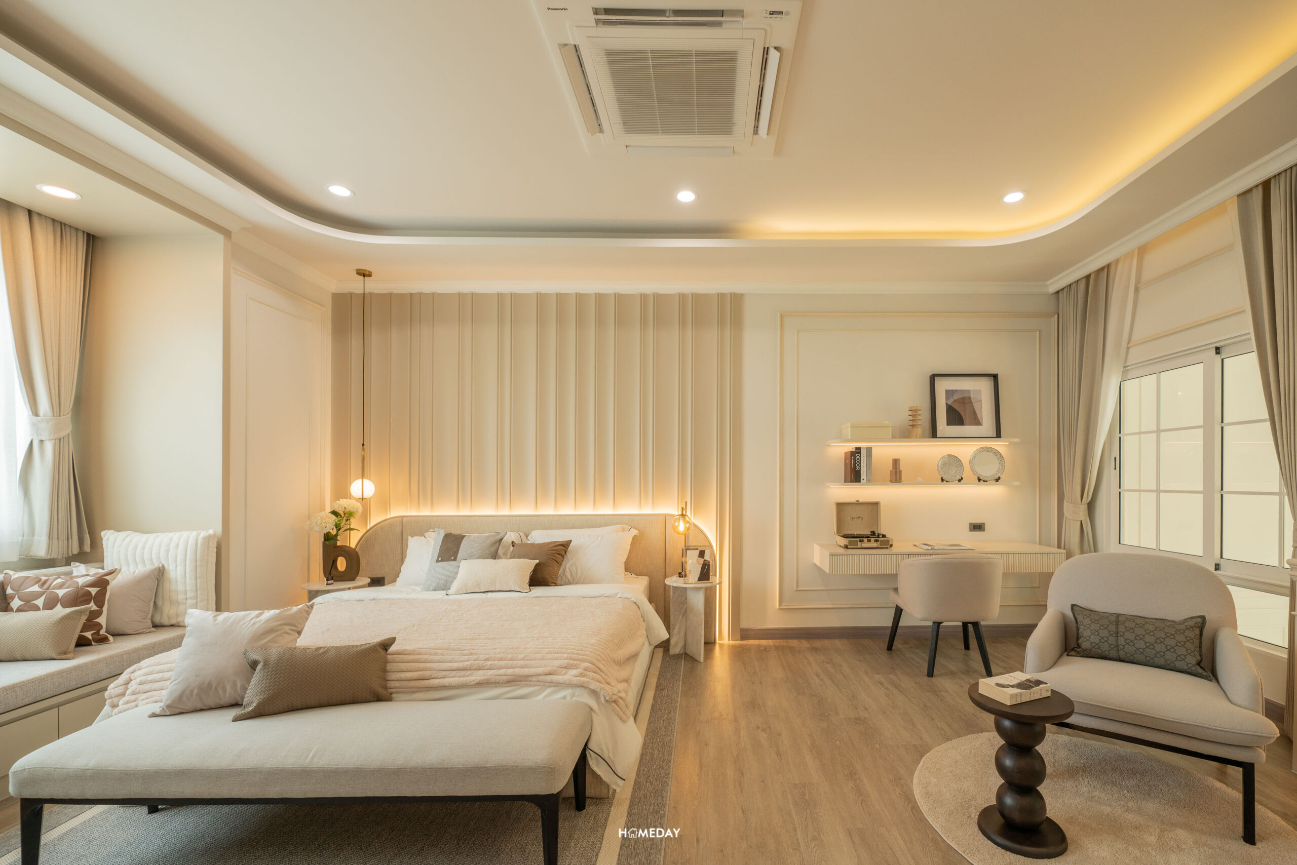 พื้นที่วางเตียงด้านในมีขนาดกว้างขวาง สามารถแบ่งสัดส่วนพื้นที่ใช้สอยได้อย่างลงตัว ได้บานหน้าต่างรับแสงมาถึง 3 บาน สามารถวางเตียงขนาด 5-6 ฟุตได้ ปลายเตียง Built-in เป็นตู้โชว์และชั้นวางทีวีได้ เชื่อมต่อทำเป็นโต๊ะทำงานได้อย่างลงตัวเลยครับ