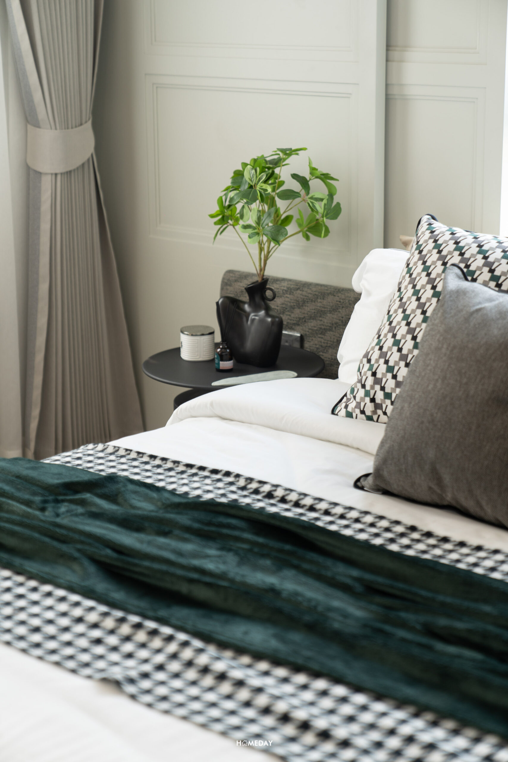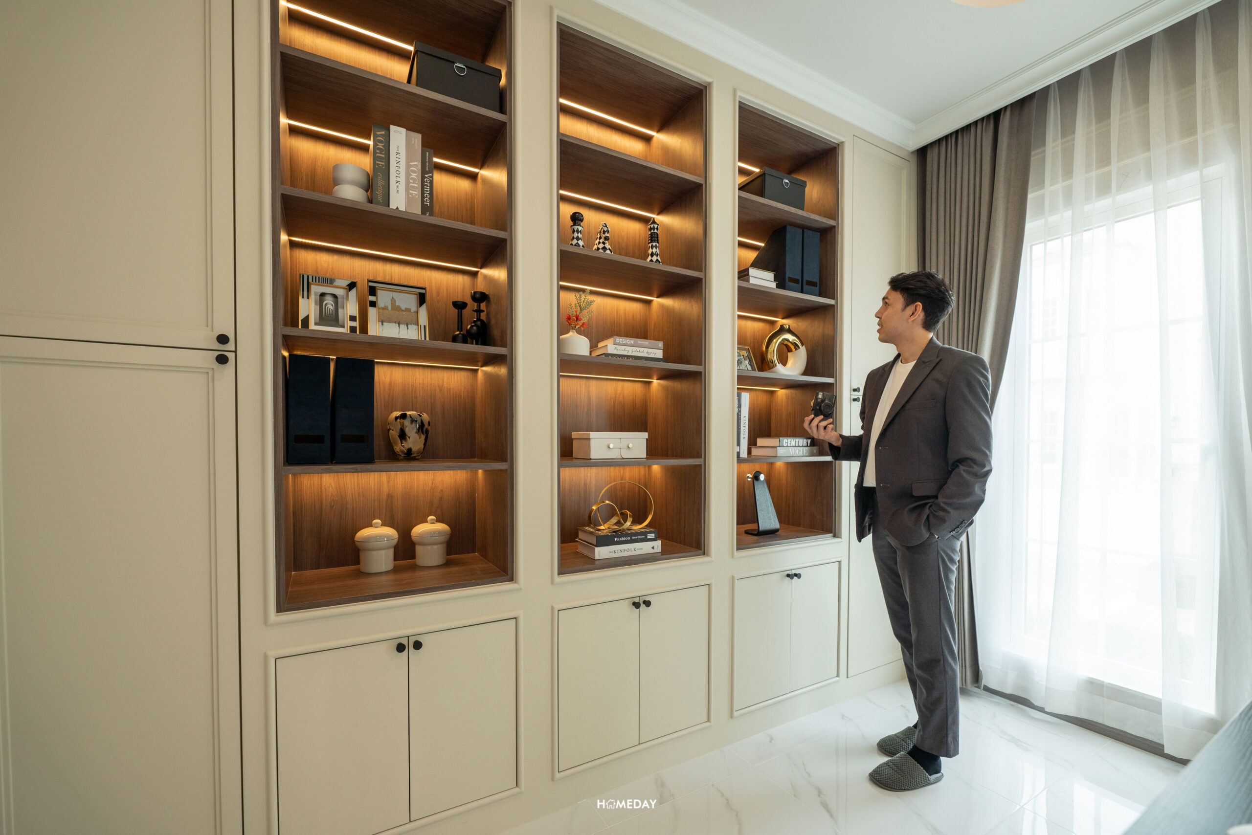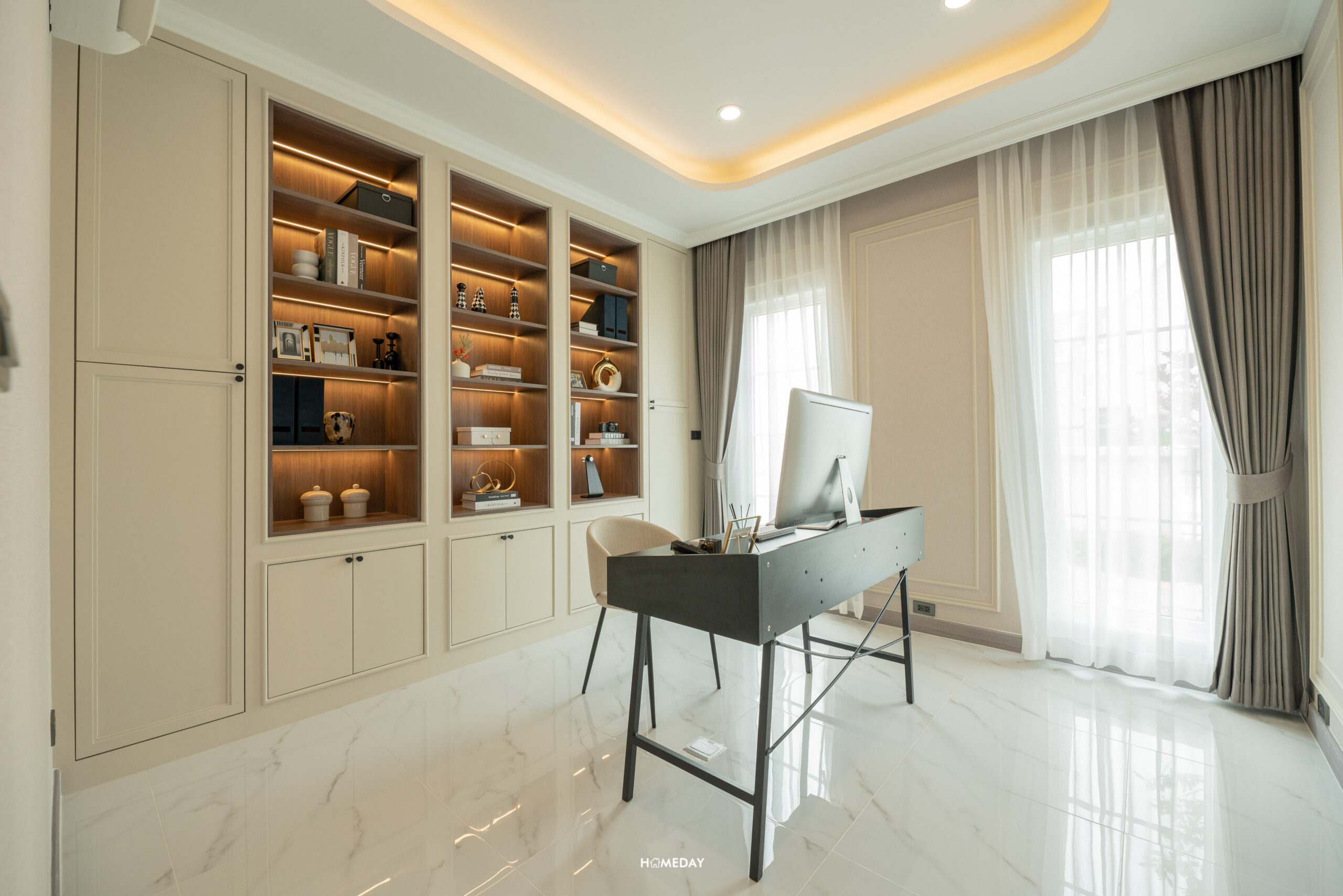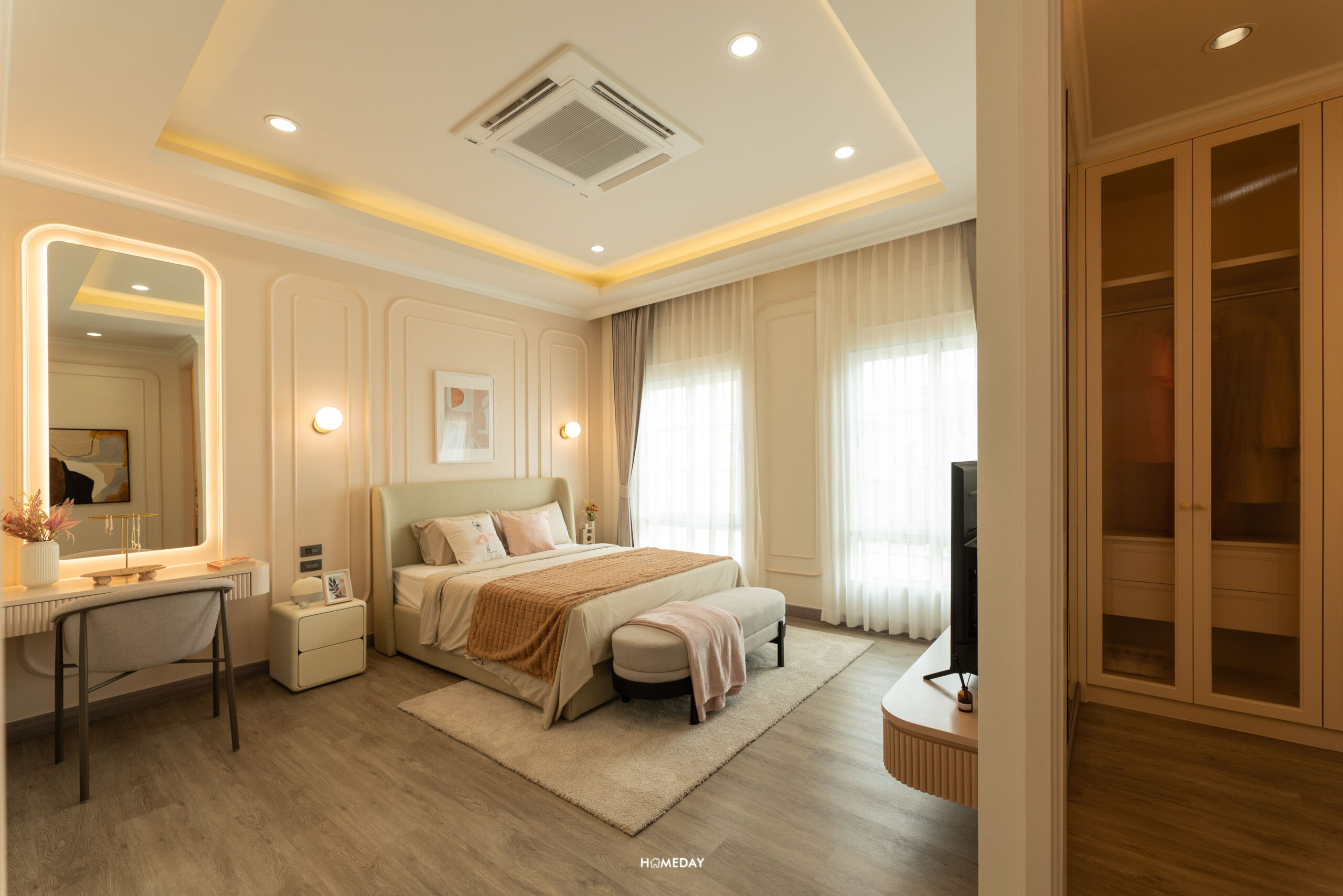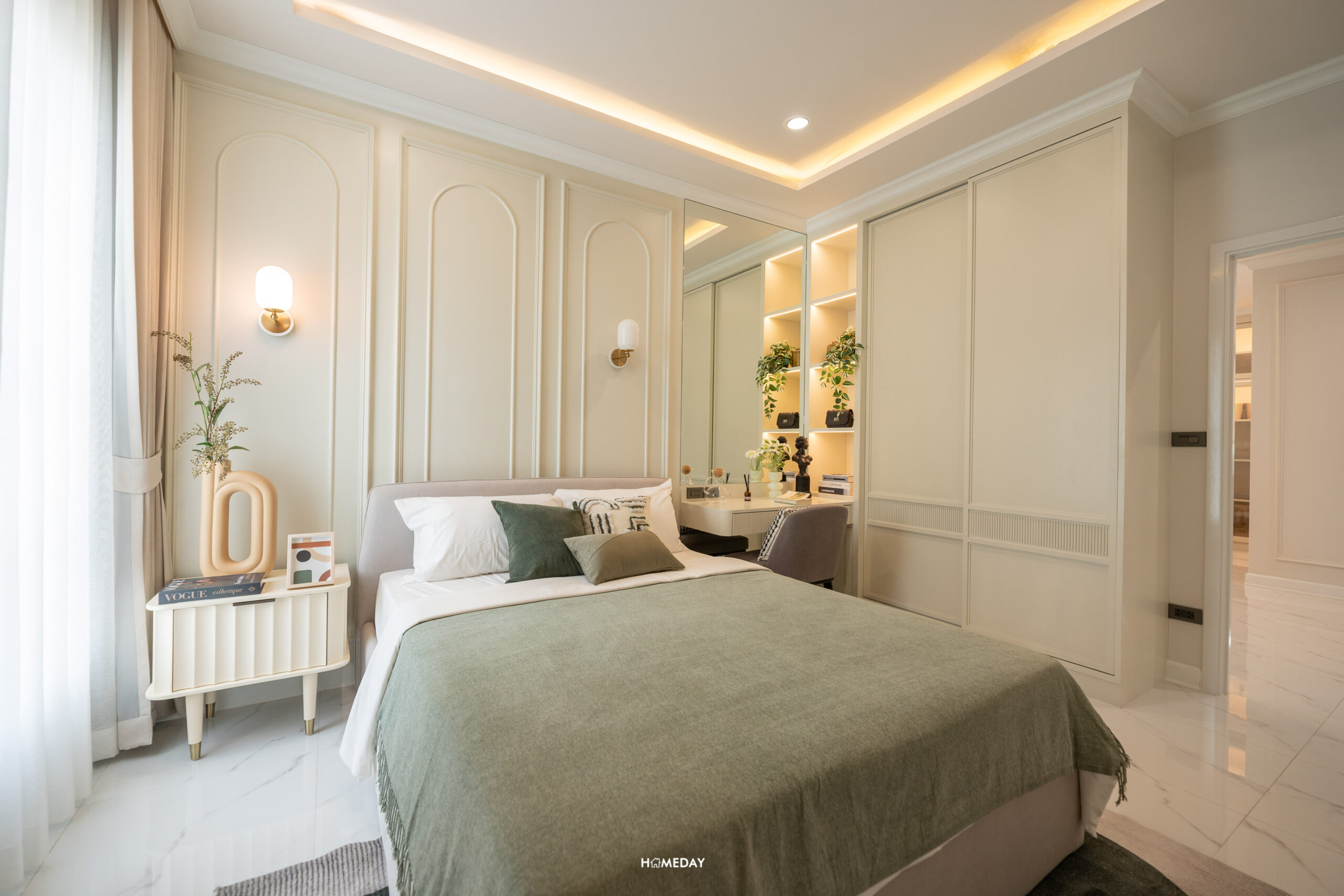 พื้นที่วางเตียงด้านในมีขนาดกว้างขวาง สามารถแบ่งสัดส่วนพื้นที่ใช้สอยได้อย่างลงตัว ได้บานหน้าต่างรับแสงมาถึง 3 บาน สามารถวางเตียงขนาด 5-6 ฟุตได้ ปลายเตียง Built-in เป็นตู้โชว์และชั้นวางทีวีได้ เชื่อมต่อทำเป็นโต๊ะทำงานได้อย่างลงตัวเลยครับ