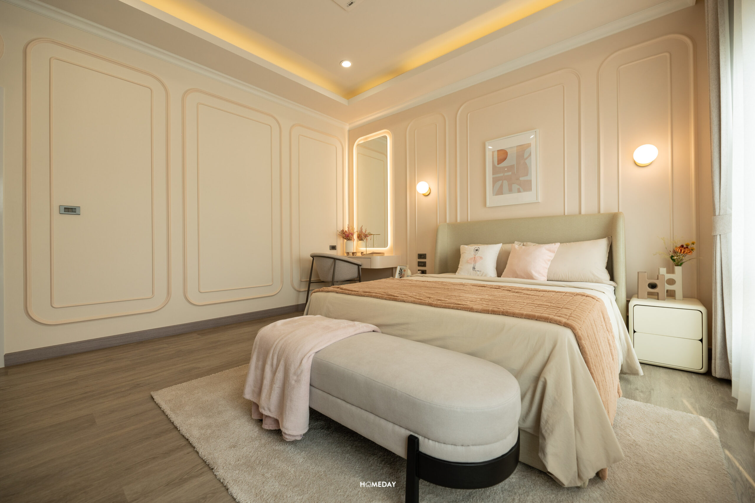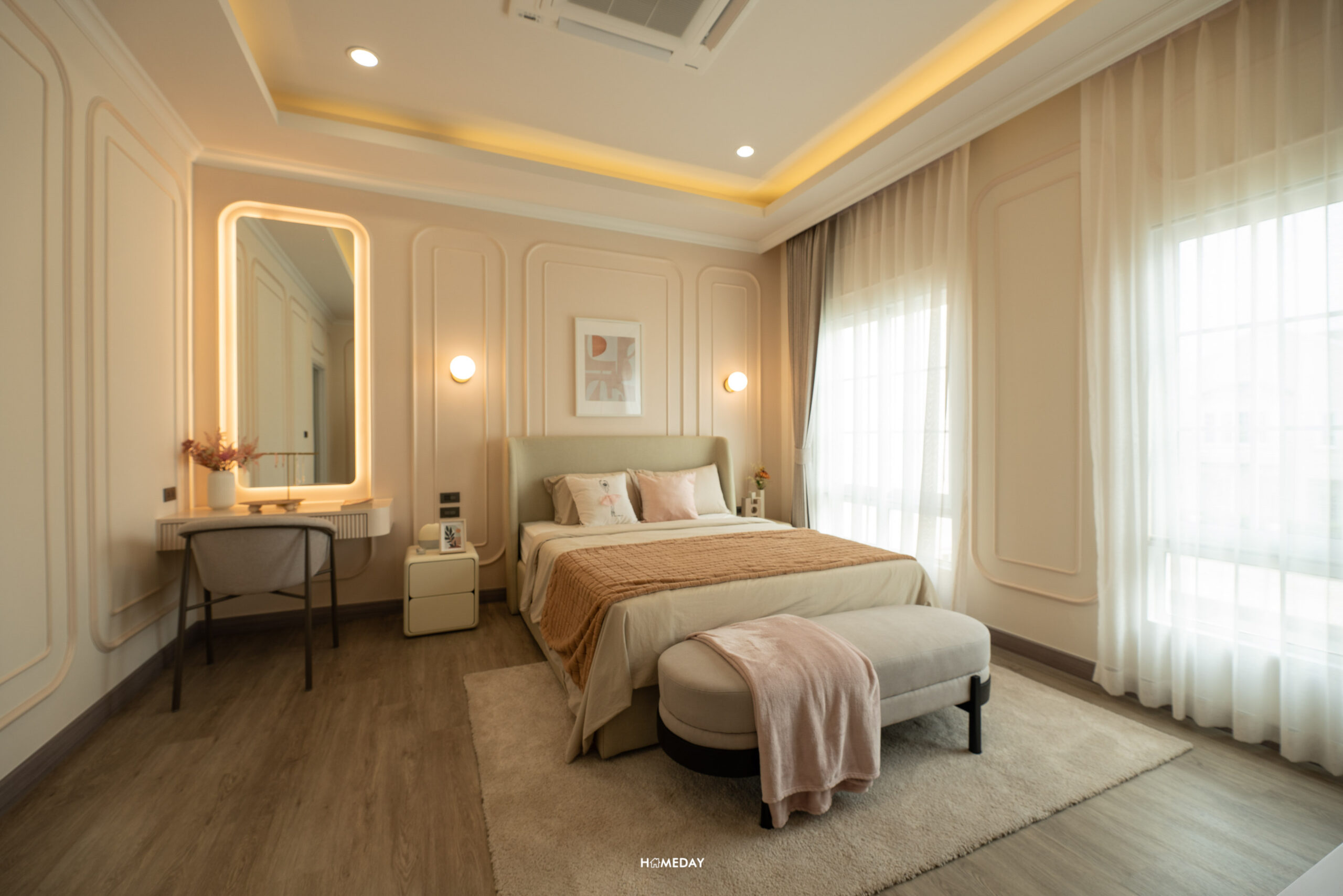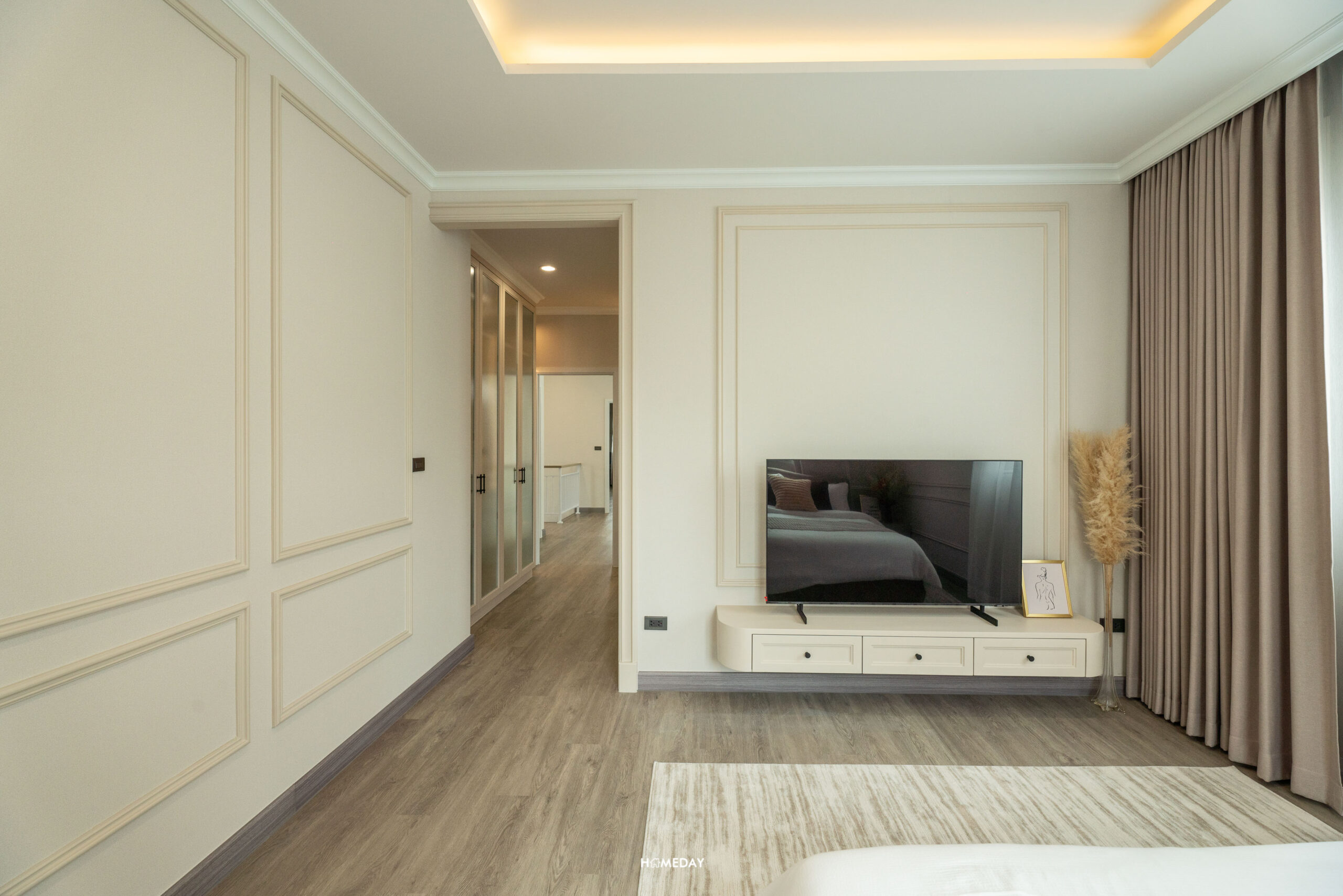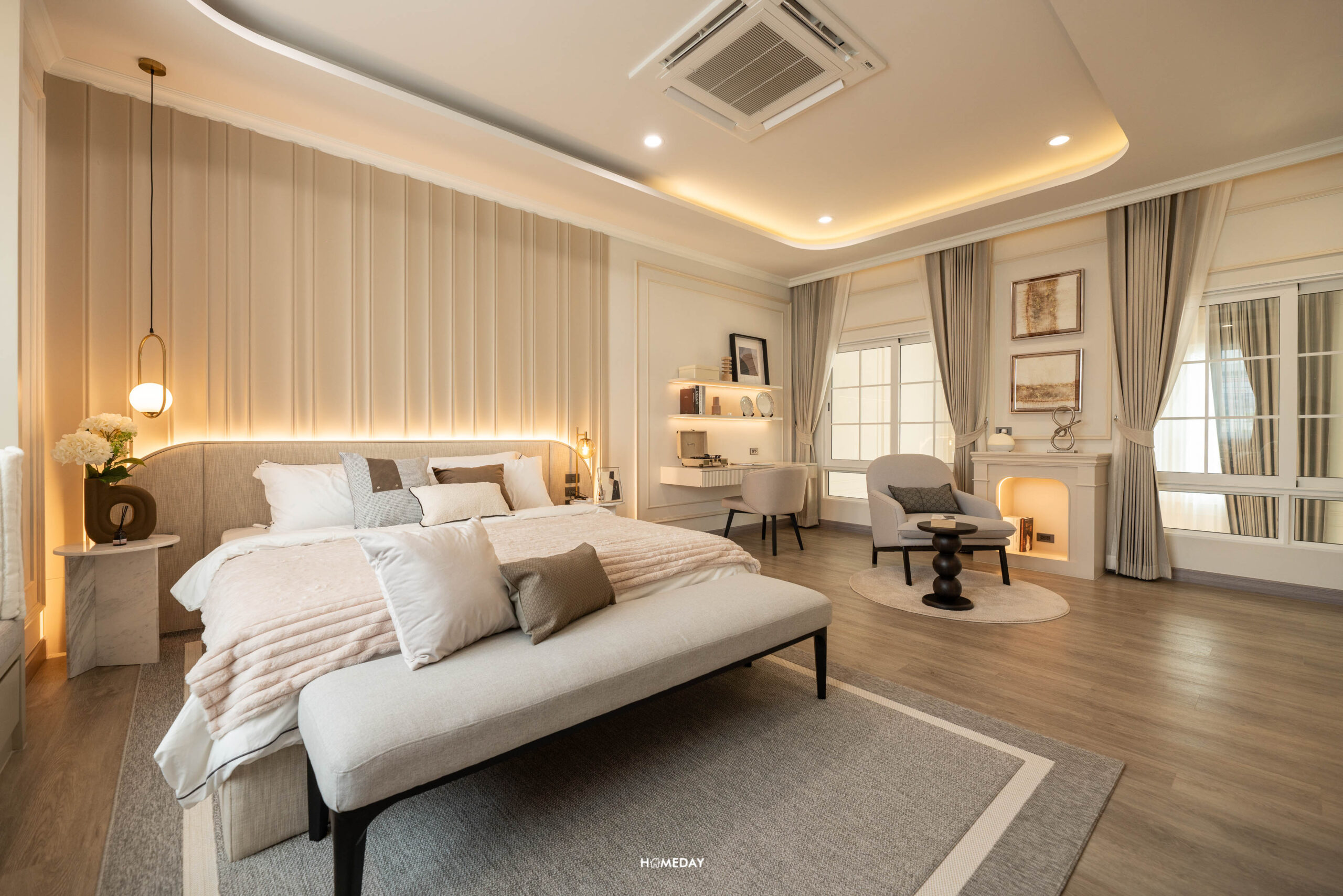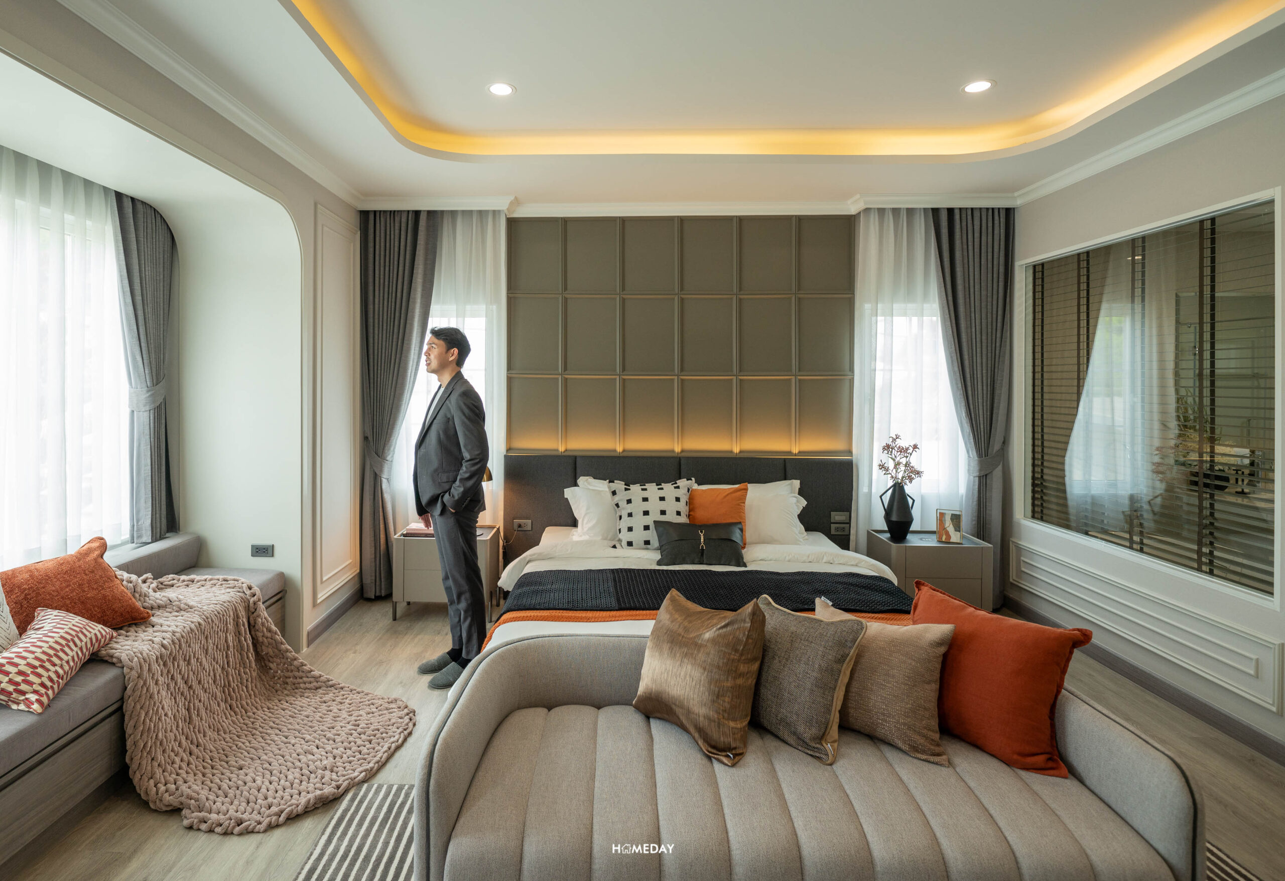 ถัดจาก Family Area จะเป็น Master Bedroom พื้นที่ห้องนี้จะมีขนาดใหญ่ที่สุด สามารถวางเตียง King Size ได้ สามารถ Built ชั้นวางทีวี พร้อมด้วยม้านั่งปลายเตียงได้ โดยยังเหลือพื้นที่ปลายเตียงโล่งกว้าง เดินผ่านเข้า-ออกได้สะดวก ได้ห้องที่โปร่งไม่อึดอัดเลยครับ จุดเด่นของ Dutch Colonial Style จะอยู่ที่ห้องนี้ นั่นคือ Bay Window ที่เป็นตัวเพิ่มพื้นที่ใช้สอยภายในบ้าน จะทำเป็นพื้นที่นั่งเล่นพักผ่อน อ่านหนังสือ หรือจะทำเป็นมุมโต๊ะทำงานเข้ามุมสวยงามรับกับหน้าต่างก็ได้ครับ