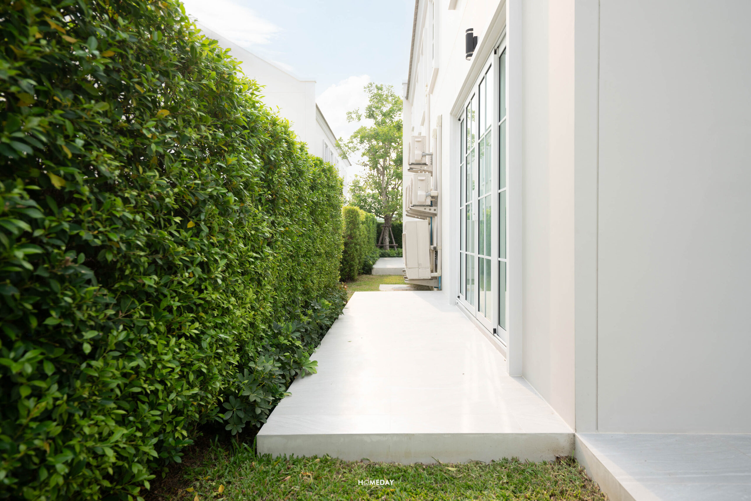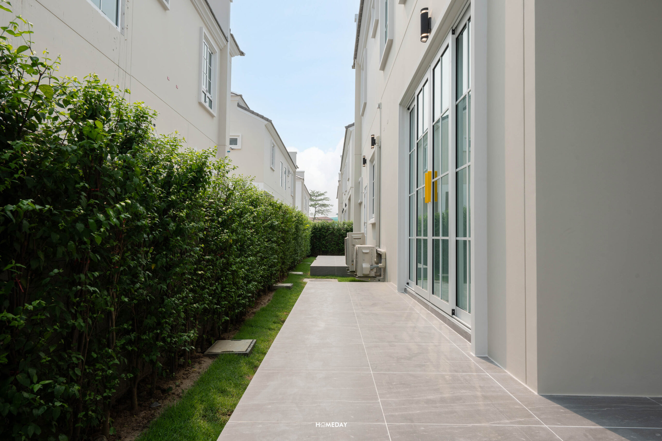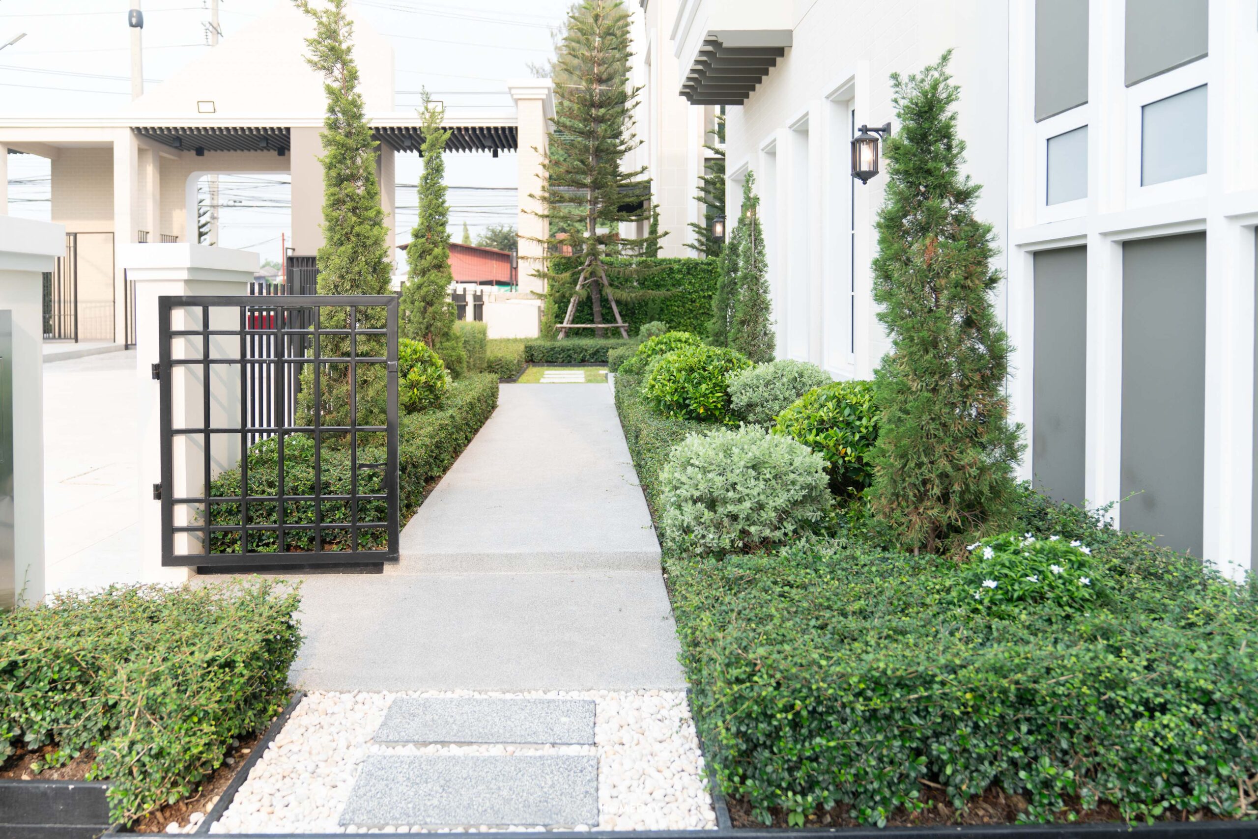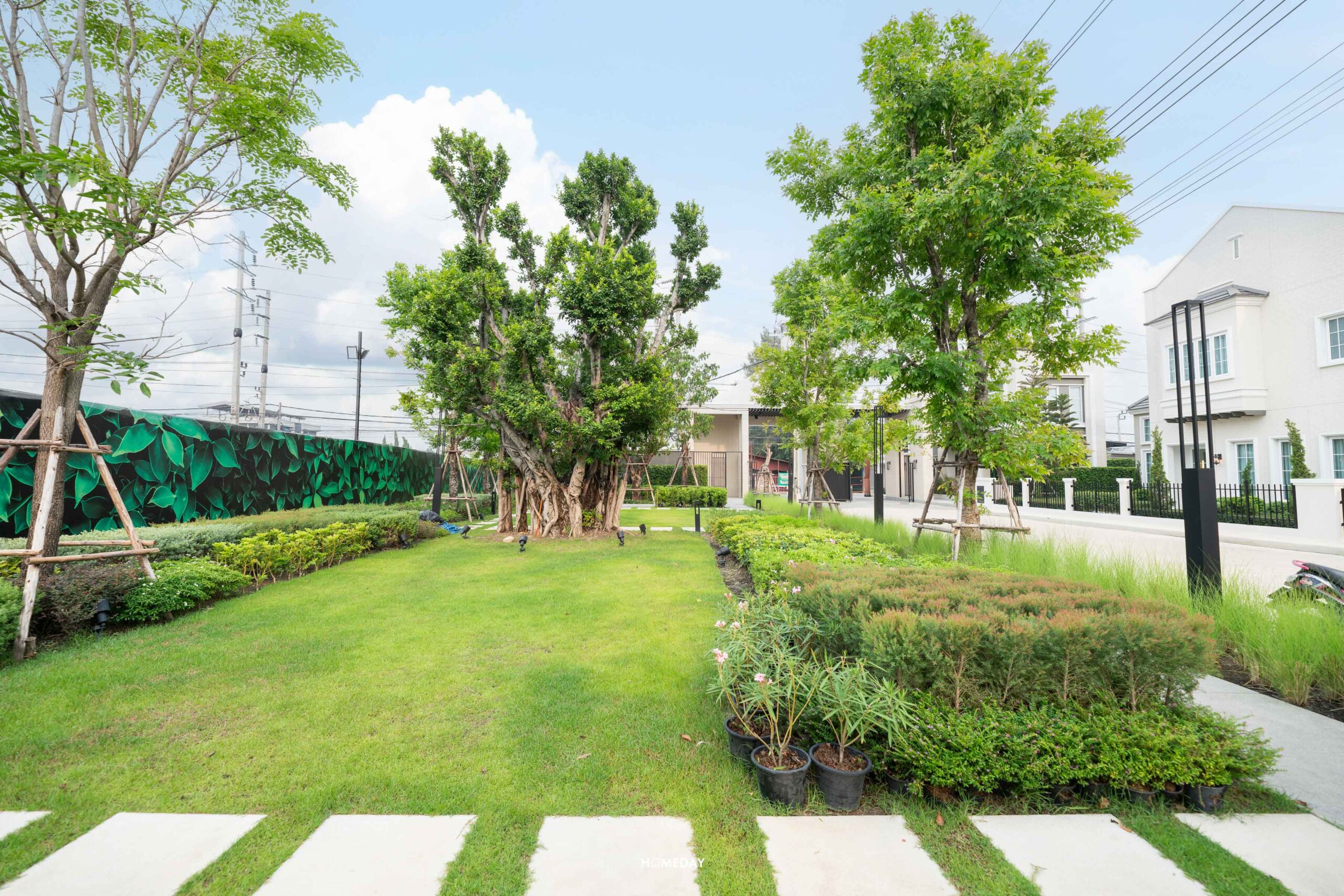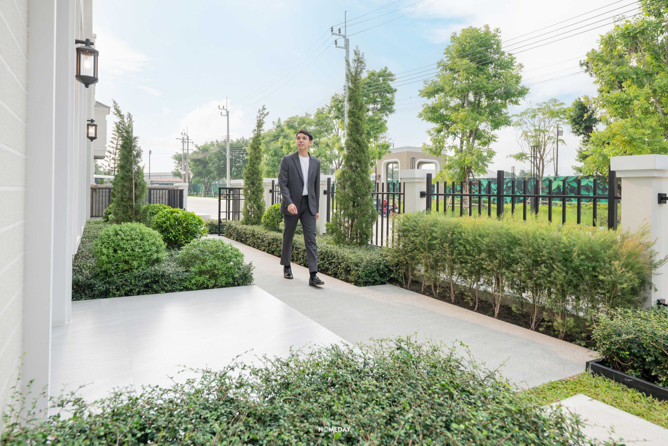 ทางคนเดินเข้าหน้าบ้านจะเป็นประตูรั้วเหล็กบานสวิง พร้อมไฟกิ่งและกริ่งไร้สาย Mail Box ทำจาก Stainless steel ที่ใช้ร่วมกันกับป้ายบ้านเลขที่ ถังขยะจะเป็นแบบฝังกำแพงก่อปูนมาให้ สะดวกทั้งลูกบ้านและพนักงานที่มา Service แบบบ้านทุกหลังในโครงการจะมีการปรับพื้นรอบบ้านและจัดสวนมาตรฐานให้ด้วยนะครับ