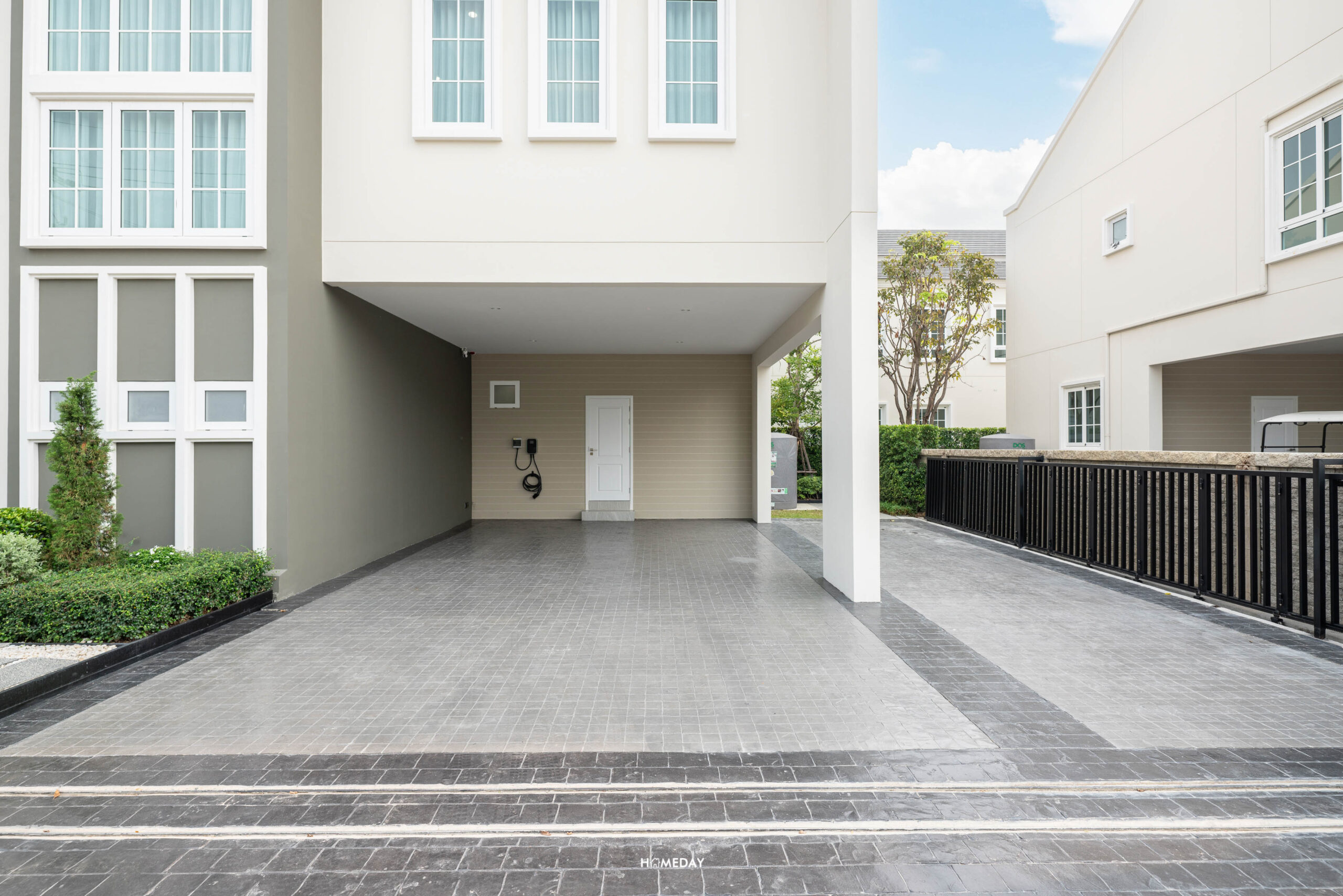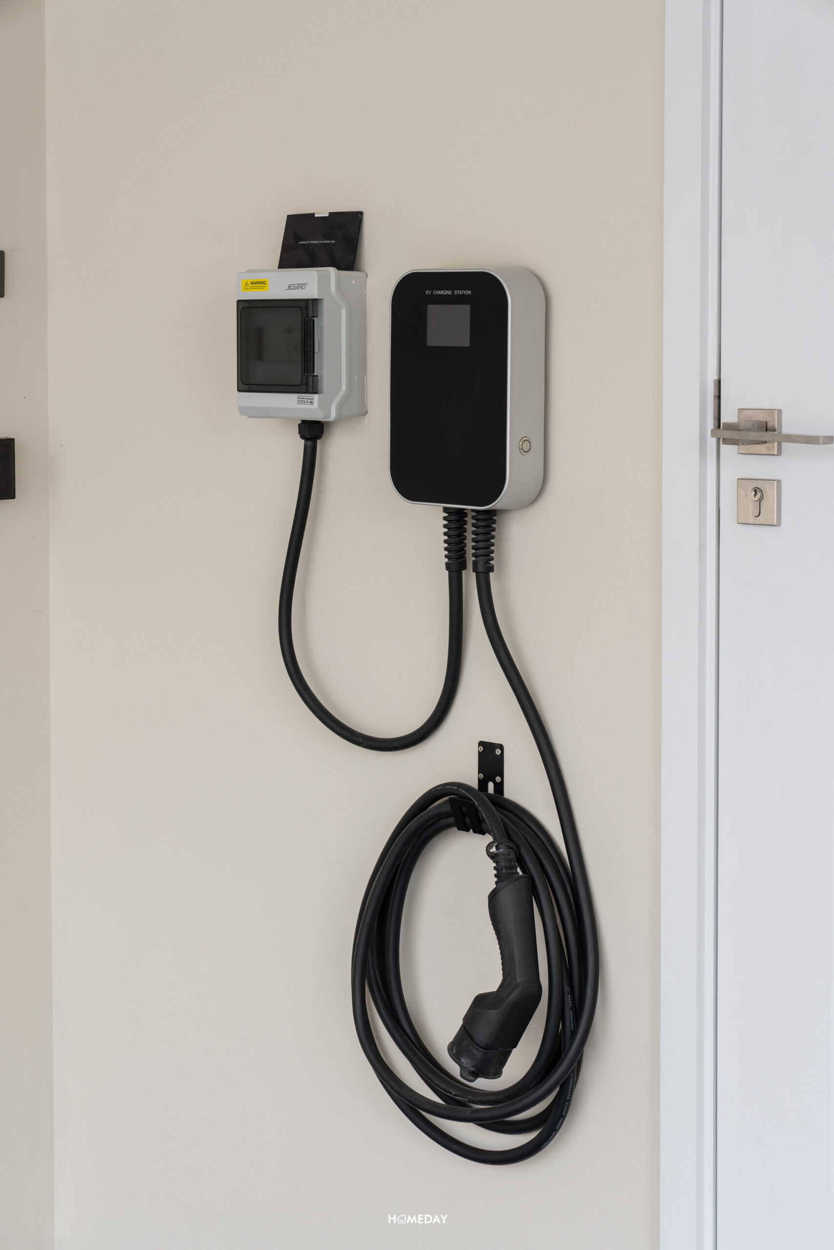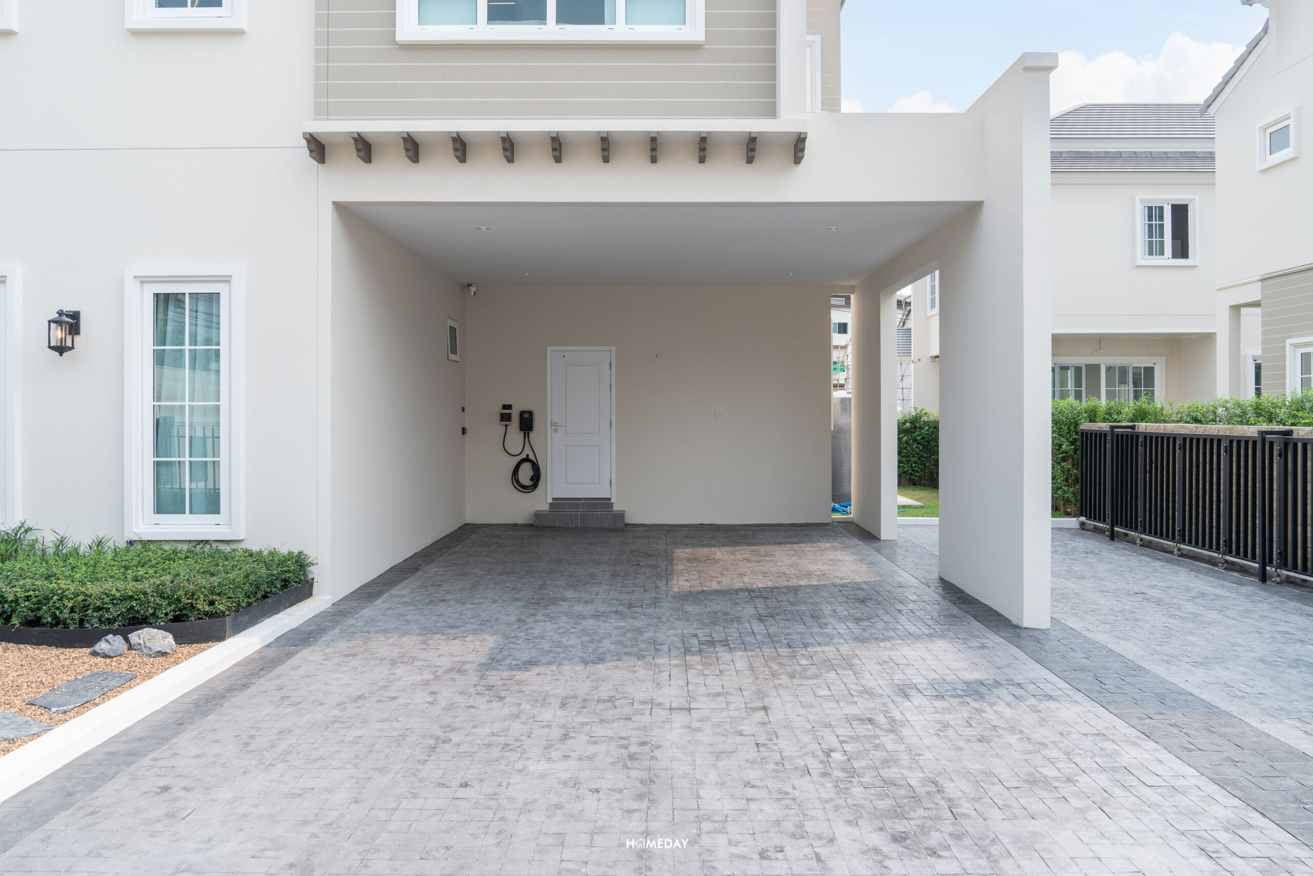 บริเวณโรงจอดรถ ทางโครงการจะติดตั้ง EV Charger มาให้ 1 จุด และทุกหลังเป็นไฟ 3 เฟส 30(100) มีการเดินไฟไว้ทำปลั๊กเพื่อรองรับ EV Charger เพิ่มอีก 1 ตัวในอนาคต มีเต้าเสียบพร้อมฝาครอบปลั๊กไฟกันน้ำมาให้อีก 1 จุด