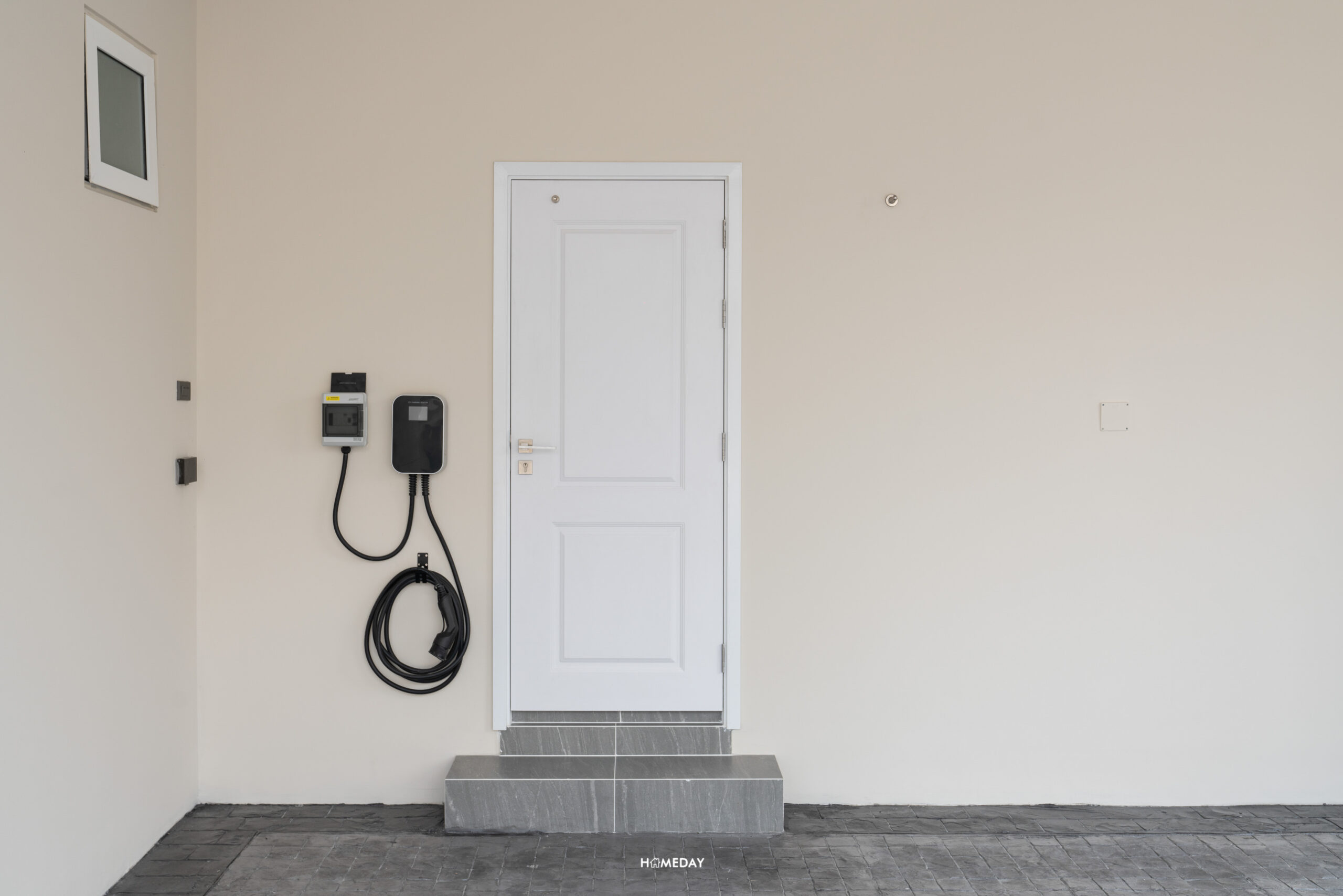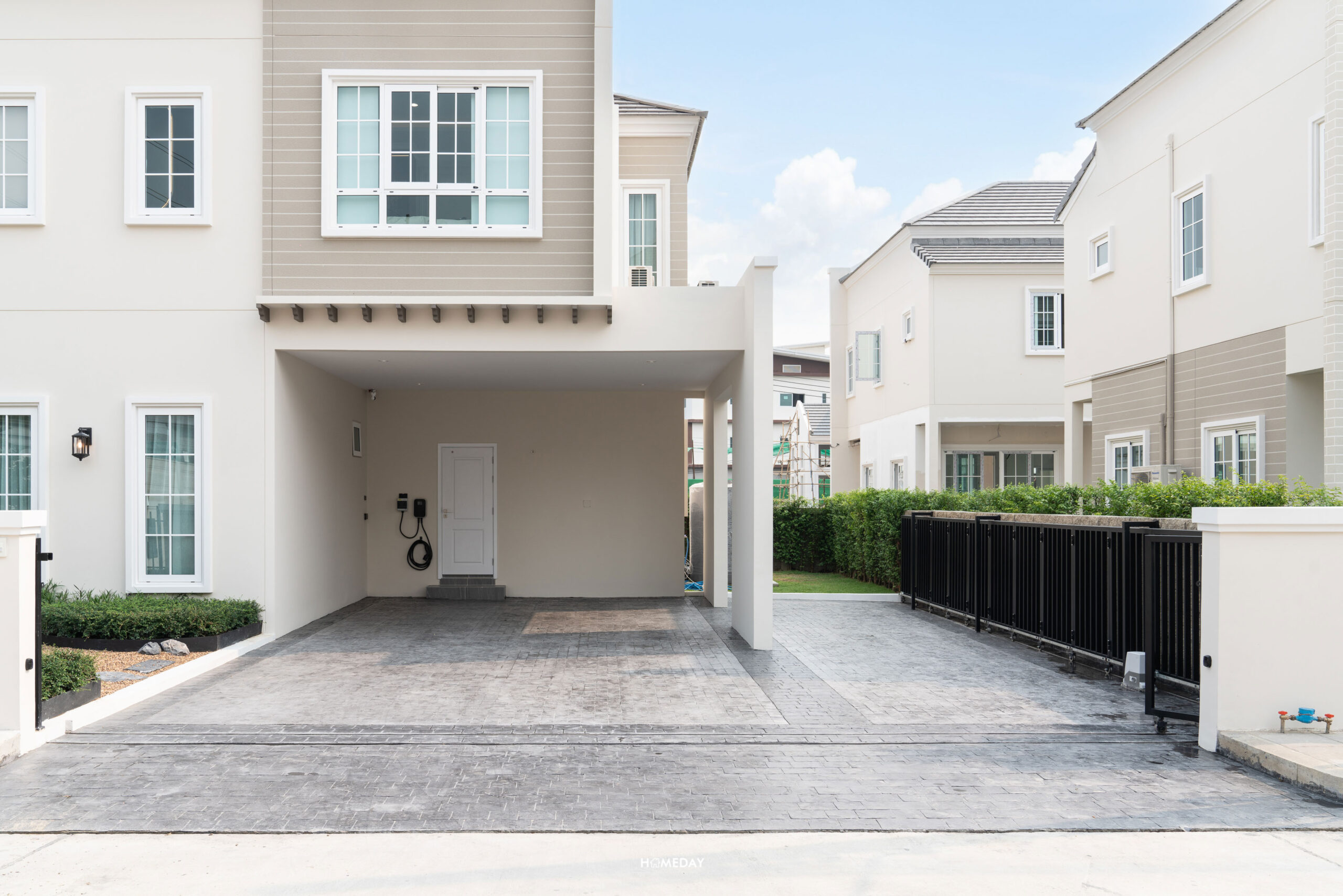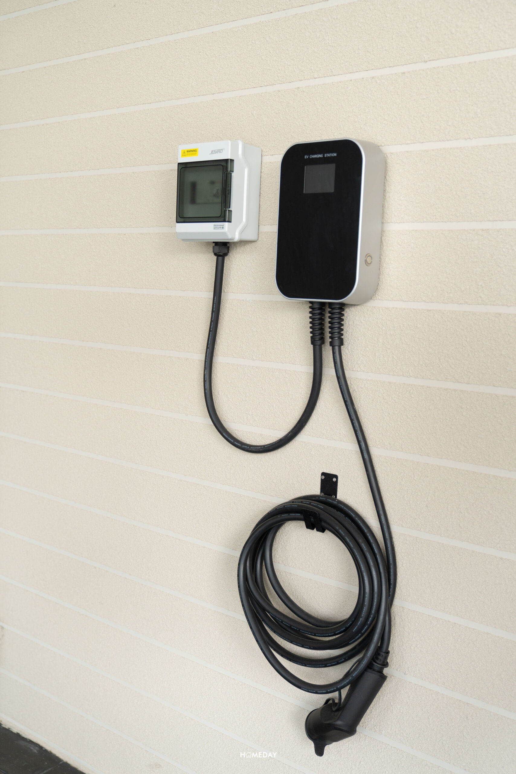 บริเวณโรงจอดรถ ทางโครงการจะติดตั้ง EV Charger มาให้ 1 จุด และทุกหลังเป็นไฟ 3 เฟส 30(100) มีการเดินไฟไว้ทำปลั๊กเพื่อรองรับ EV Charger เพิ่มอีก 1 ตัวในอนาคต มีเต้าเสียบพร้อมฝาครอบปลั๊กไฟกันน้ำมาให้อีก 1 จุด