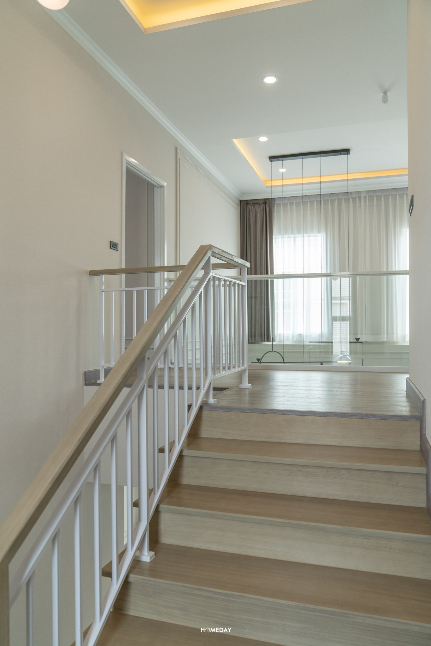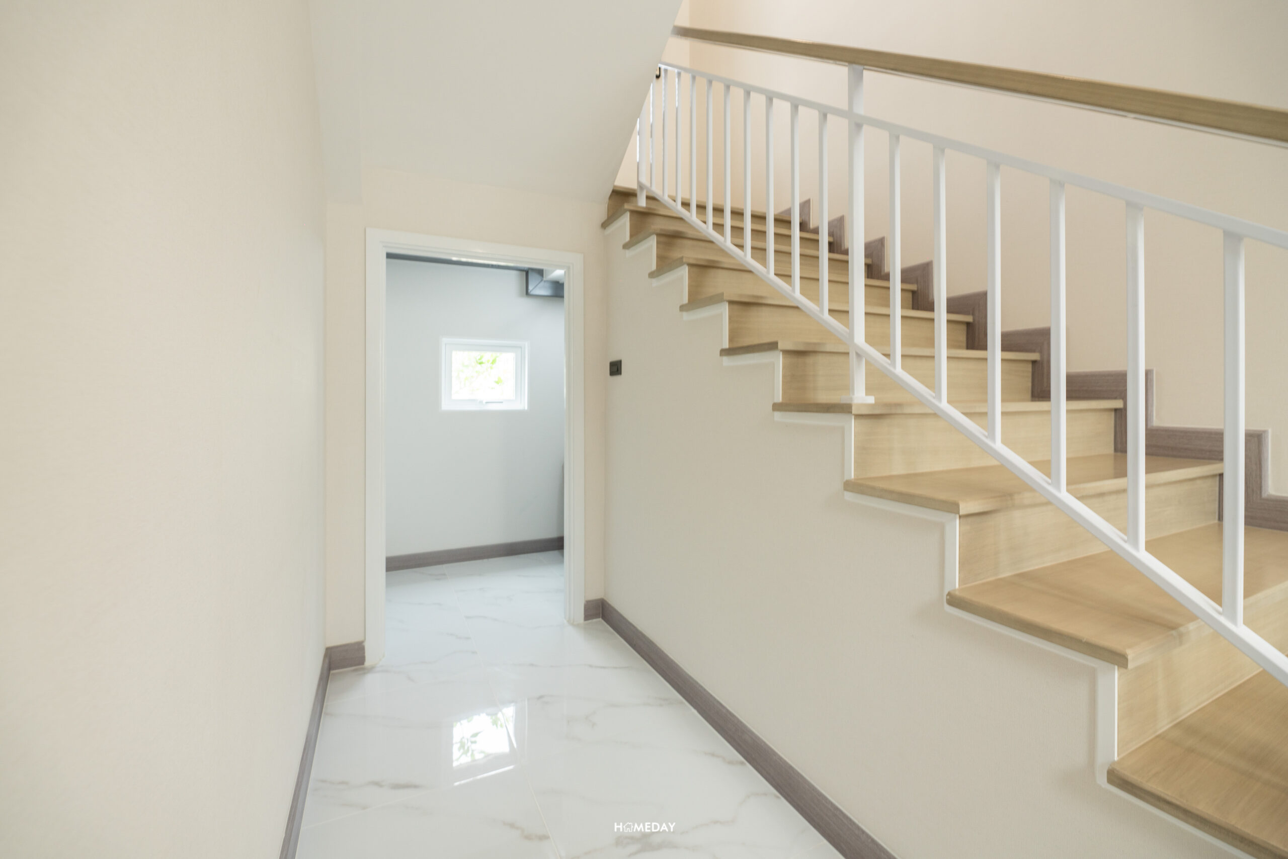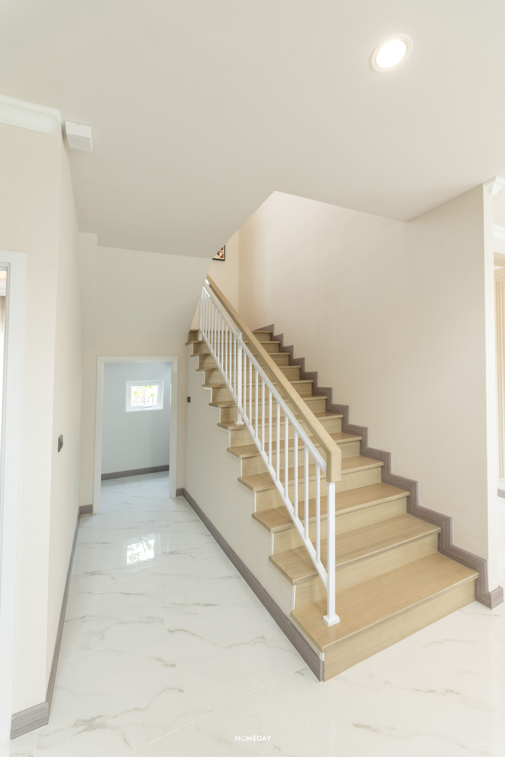 มาที่ชั้น 2 กันบ้าง โครงสร้างบันไดจะเป็นคอนกรีตเสริมเหล็ก ปิดผิวด้วยไม้ยางพารา ลูกตั้งและลูกนอนเป็นไม้สำเร็จสีอ่อน ระยะของลูกนอนมีความกว้างมาตรฐาน ราวบันไดเป็นระแนงเหล็กสีขาว พร้อมช่องแสงมาให้ 1 บาน ทำให้ดูโปร่งโล่งมากยิ่งขึ้น