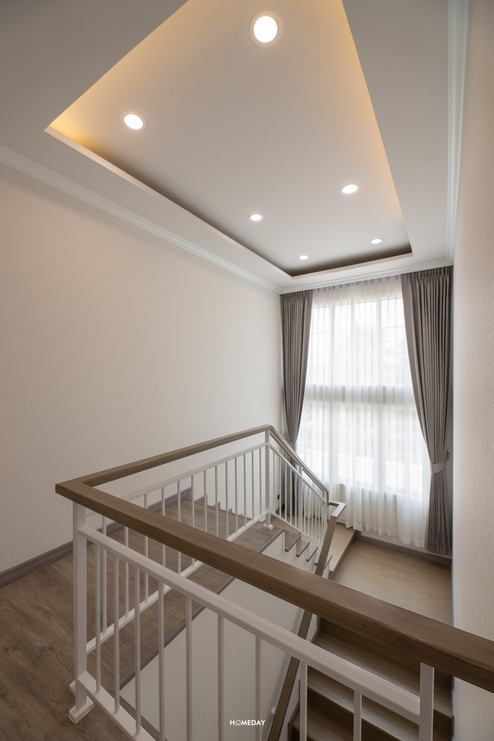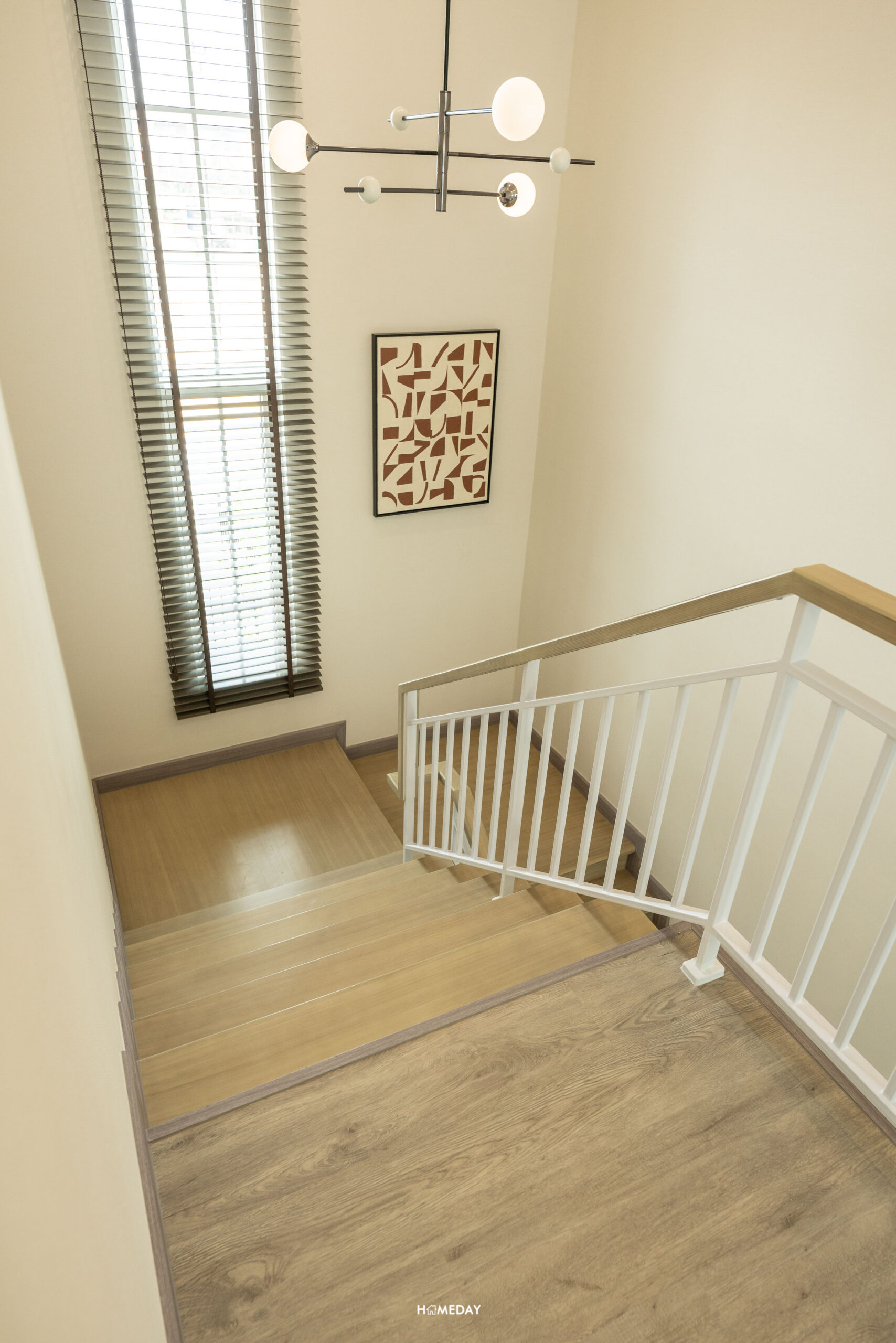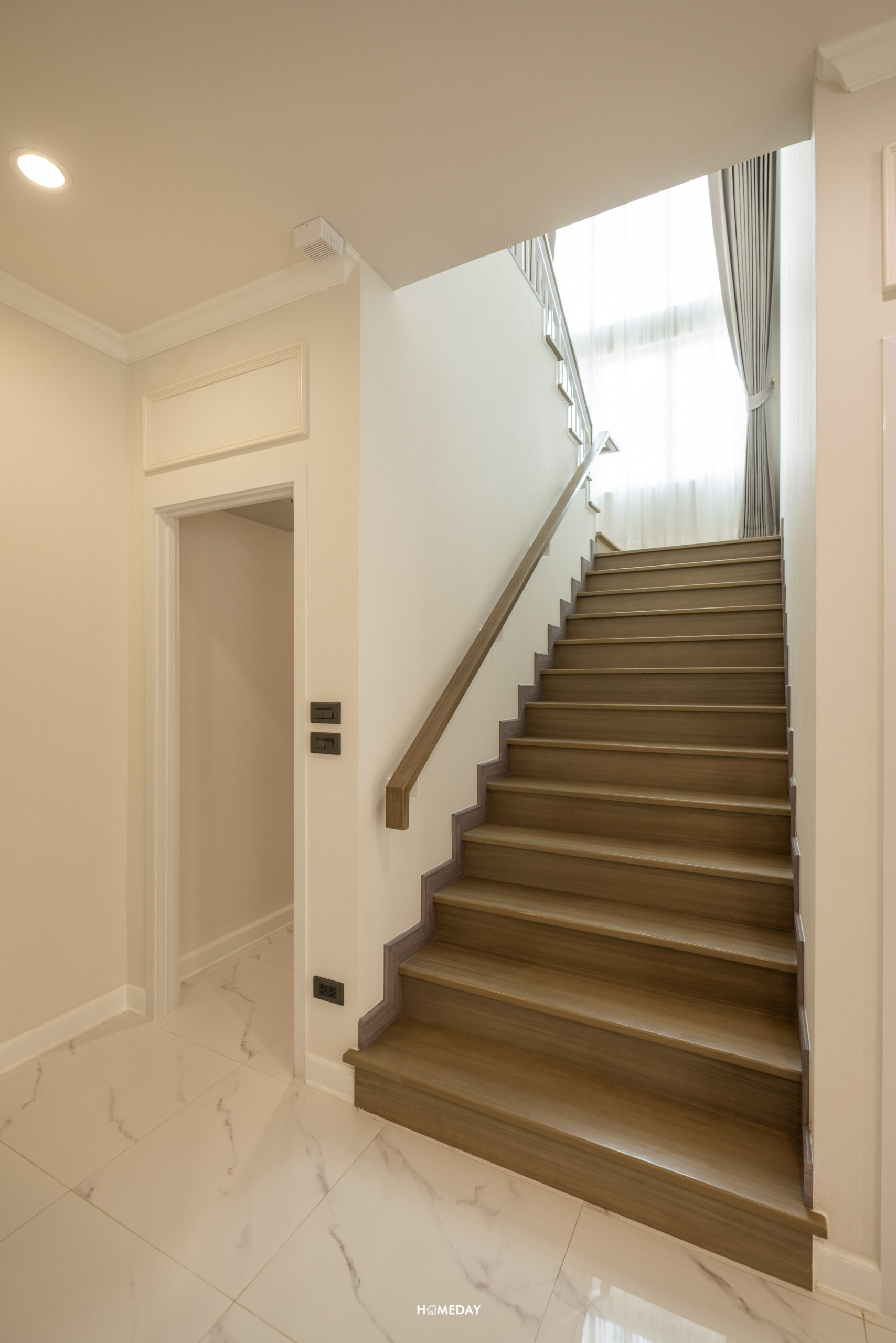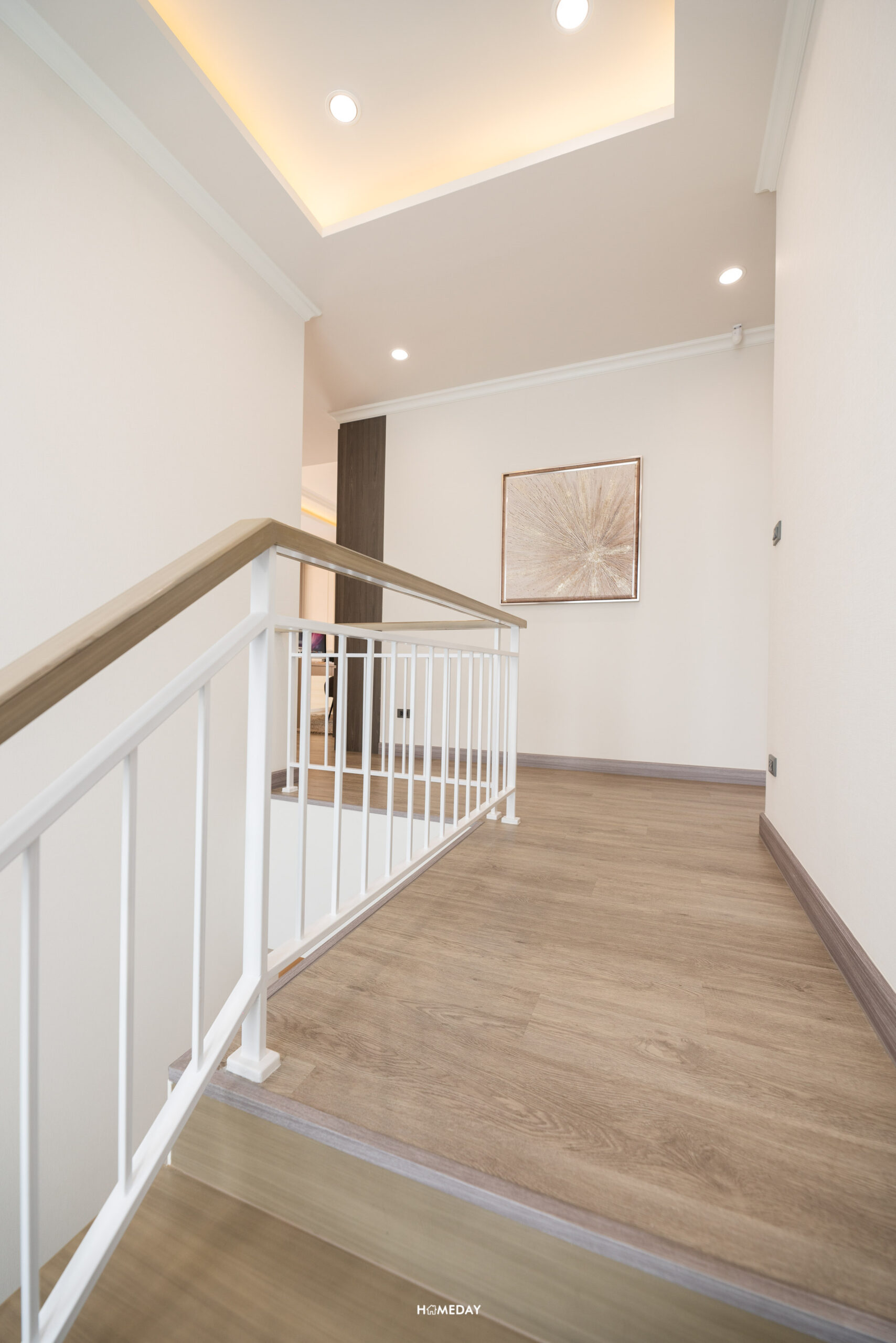 มาที่ชั้น 2 กันบ้าง โครงสร้างบันไดจะเป็นคอนกรีตเสริมเหล็ก ปิดผิวด้วยไม้ยางพารา ลูกตั้งและลูกนอนเป็นไม้สำเร็จสีอ่อน ระยะของลูกนอนมีความกว้างมาตรฐาน ราวบันไดเป็นระแนงเหล็กสีขาว พร้อมช่องแสงมาให้ 1 บาน ทำให้ดูโปร่งโล่งมากยิ่งขึ้น