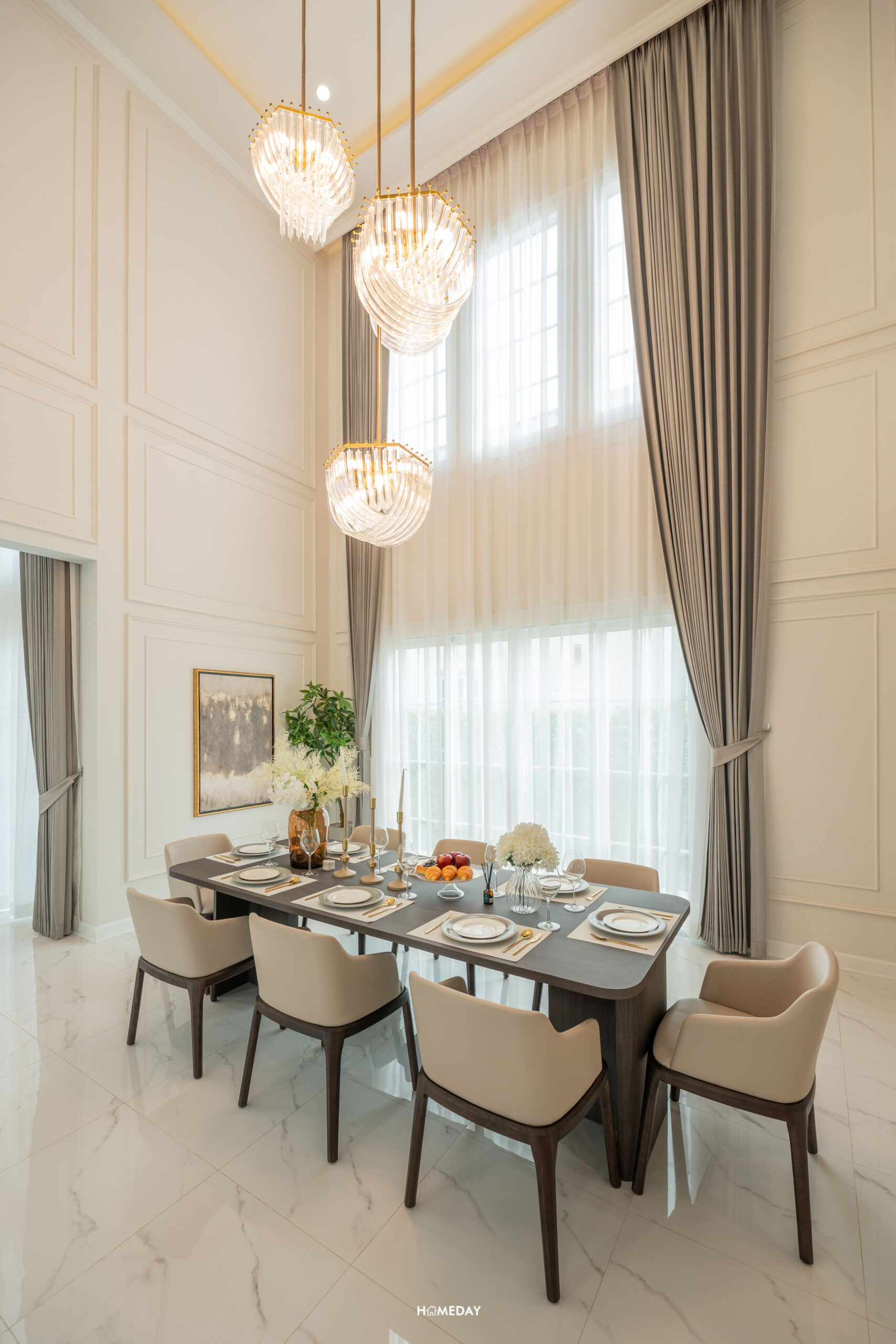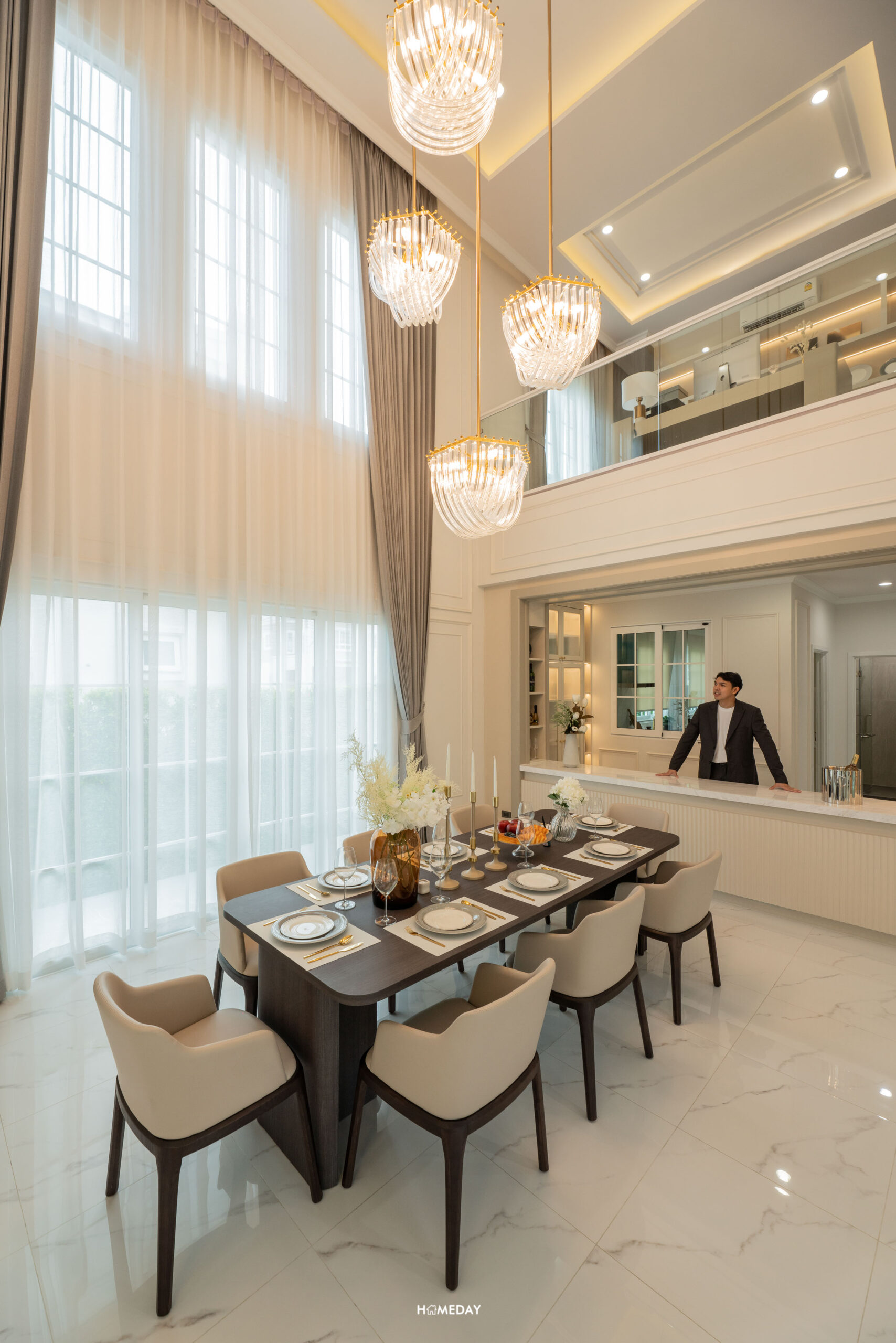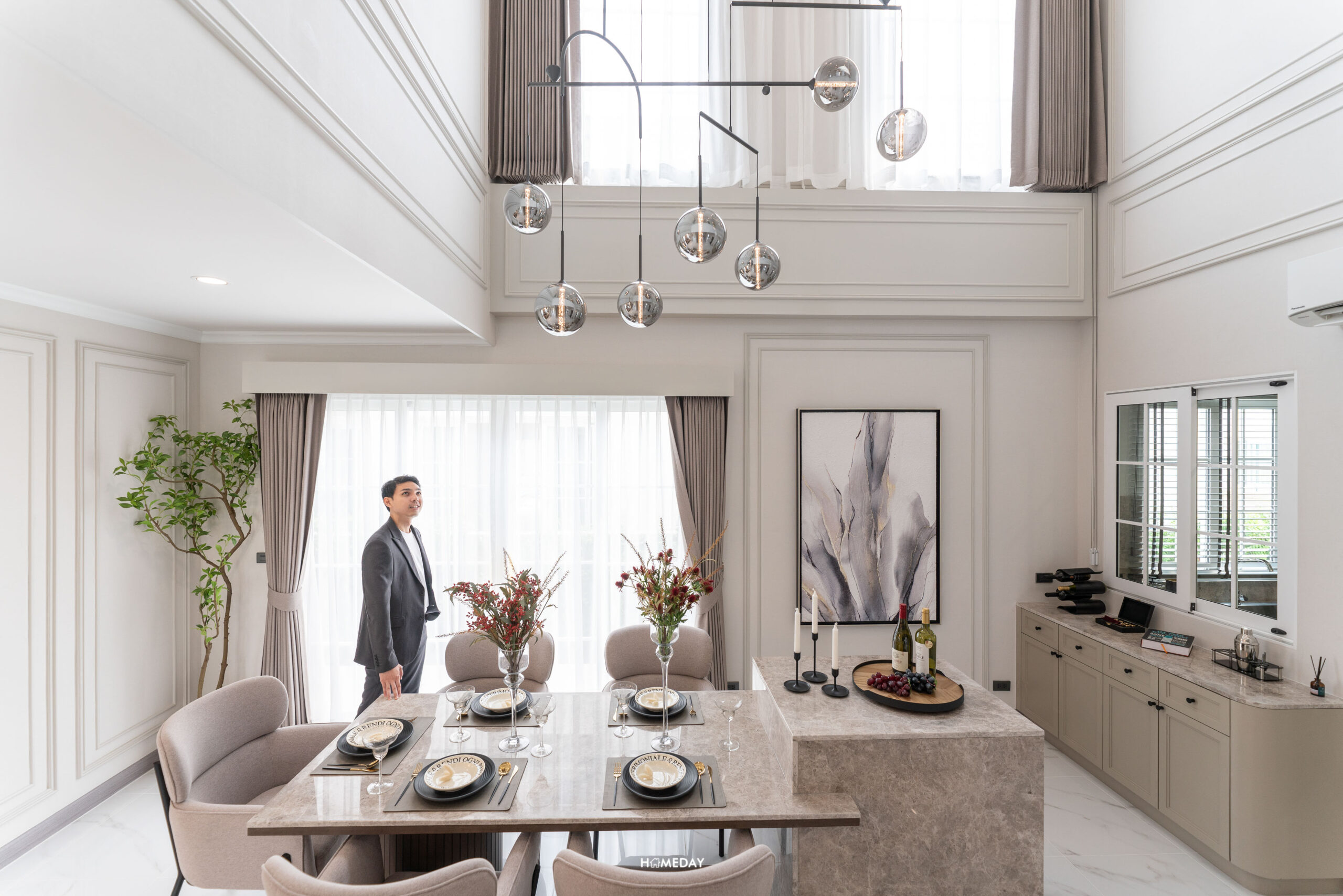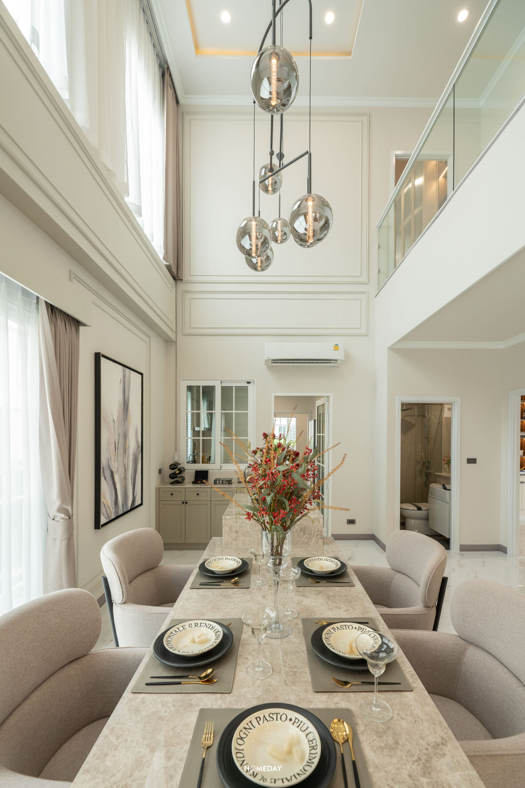 เชื่อมต่อกันที่ Highlight ของบ้านโซน Double Volume Dining Area ที่มีความสูง Floor to Ceiling 6.3 เมตร ช่องแสงกับบานประตูขนาดใหญ่ ทำให้พื้นที่ Dining Area มีความโอ่โถง สามารถวางโต๊ะทานอาหารสำหรับ 5-6 ที่นั่งได้สบาย ๆ ครับ