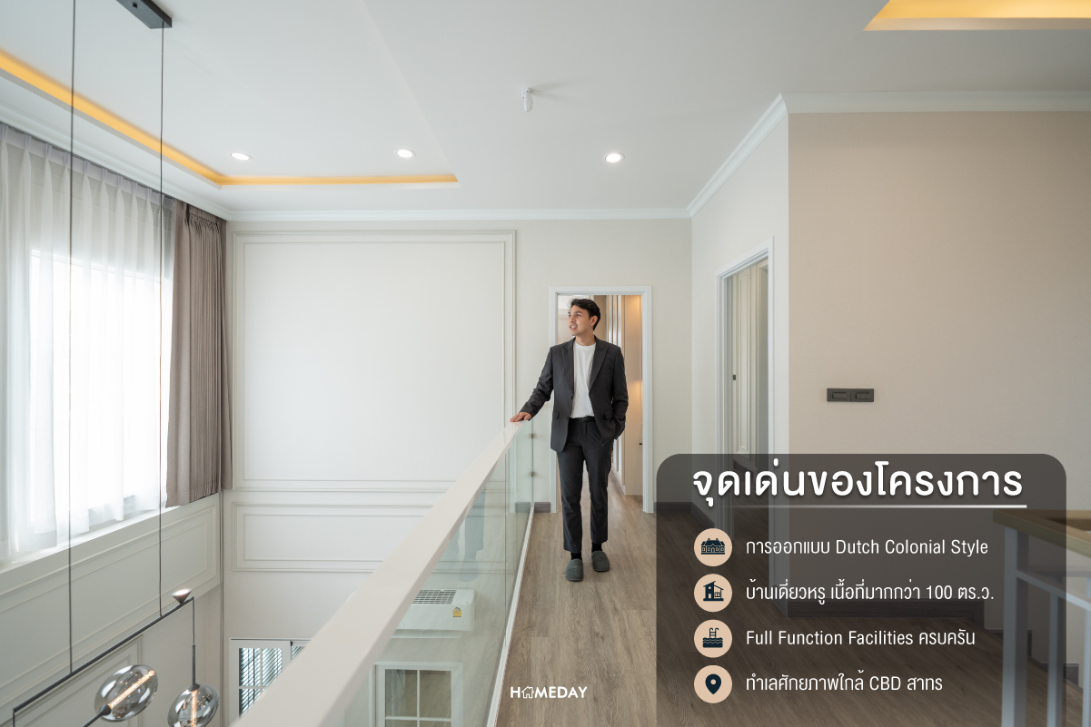 จุดเด่นโครงการ • Dutch Colonial Style เป็นสถาปัตยกรรมสไตล์ยุโรป จุดเด่นอยู่ที่หลังคาหน้าจั่วทรงสูง ชายคาสั้น มี Bay Window มีขนาดใหญ่ทำให้มีช่องแสงธรรมชาติส่องเข้ามาภายในบ้าน อีกทั้งยังเพิ่มพื้นที่ใช้สอยภายในบ้านได้อีกด้วย ซึ่งการออกแบบบ้านสไตล์นี้หาได้ยากจากโครงการบ้านทั่ว ๆ ไป เป็นการออกแบบบ้านที่มีเอกลักษณ์เฉพาะตัวครับ