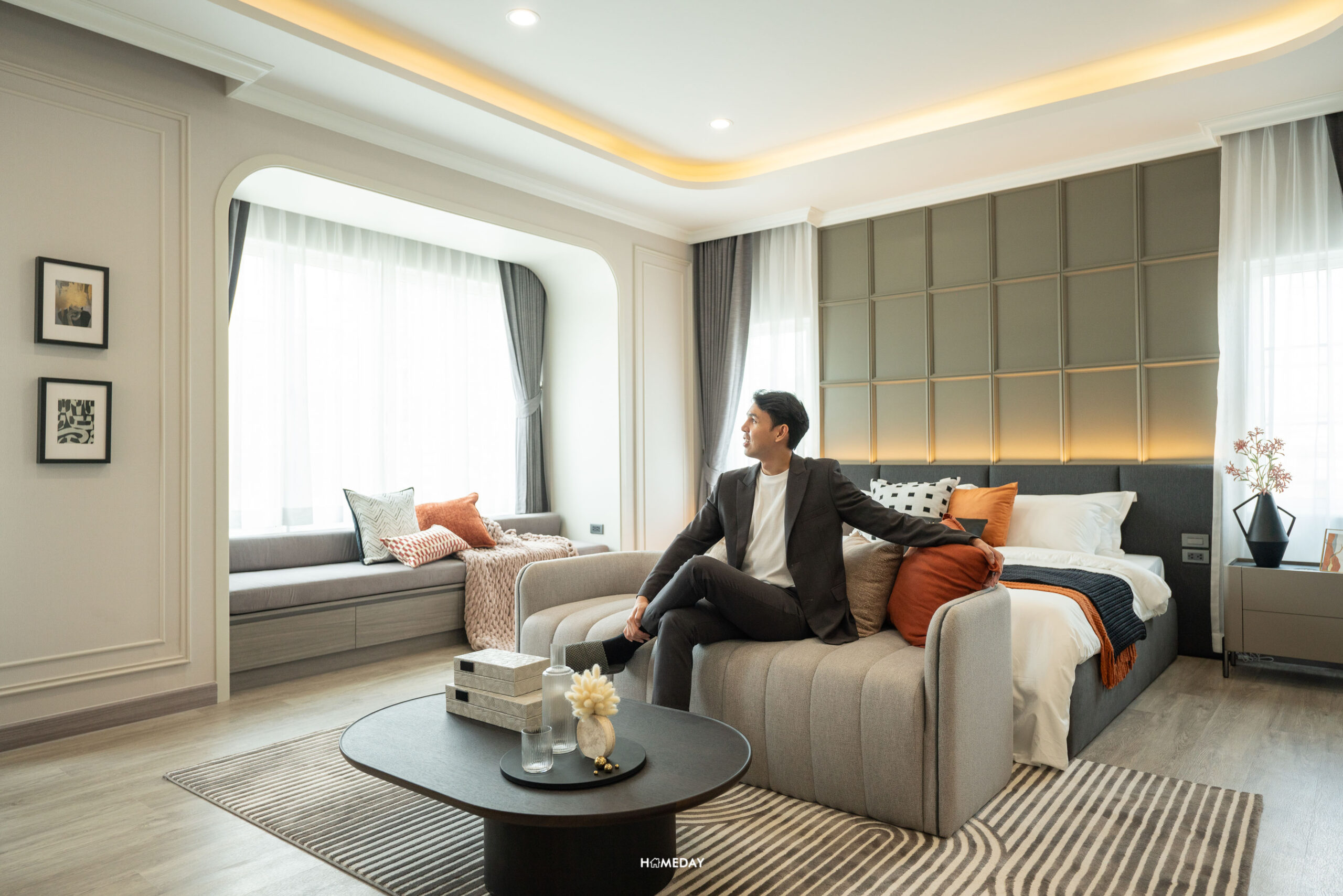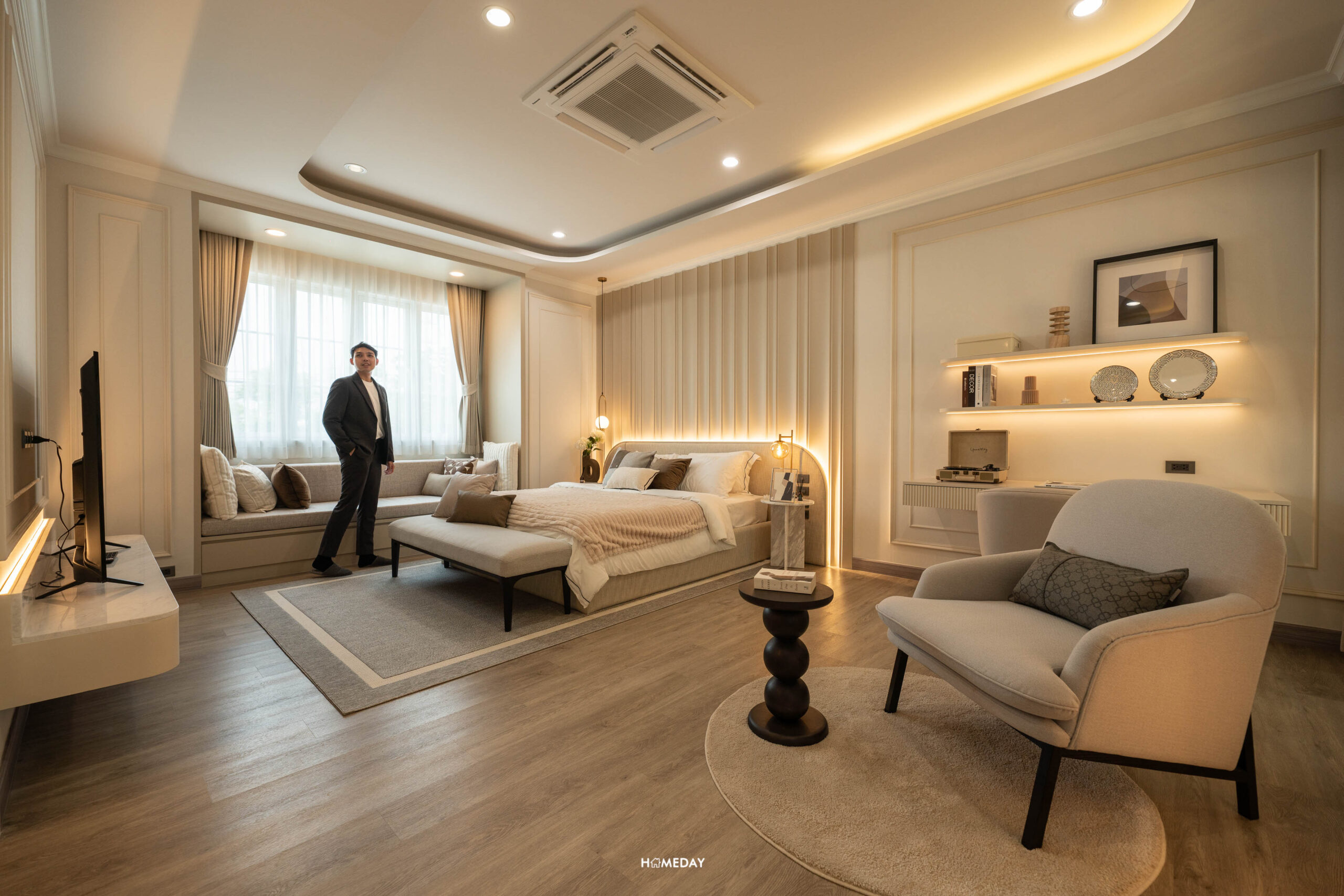 Master Bedroom จะอยู่ทางซ้ายมือ ภายในห้องกว้างขวางมาก ๆ มาพร้อมช่องแสงขนาดใหญ่ สามารถจัดแบ่งฟังก์ชันให้เป็นสัดส่วนได้เป็นอย่างดี อย่างทางโครงการวางเตียง King Size มาให้ดูตรงกลางพร้อมโต๊ะหัวเตียง ปลายเตียง สามารถวางโซฟา โต๊ะกลาง และชั้นทีวี ไว้เป็นที่นั่งเล่น พักผ่อน ดูหนัง ดูซีรีส์ได้ หรือจะแบ่งทำเป็นโต๊ะทำงานขนาดใหญ่ก็ยังได้ ส่วนที่ช่วยเพิ่มพื้นที่ในห้องนี้คือ Bay Window สามารถจัดเป็นโต๊ะทำงานตรงนี้ก็ได้ หรือจะทำเป็นที่นั่งพักผ่อนเพื่อโอบรับแสงธรรมชาติในช่วงเช้ายามแดดอ่อน ๆ ก็เป็นอีกหนึ่งมุมที่น่าจะได้ใช้งานกันบ่อย ๆ ครับ