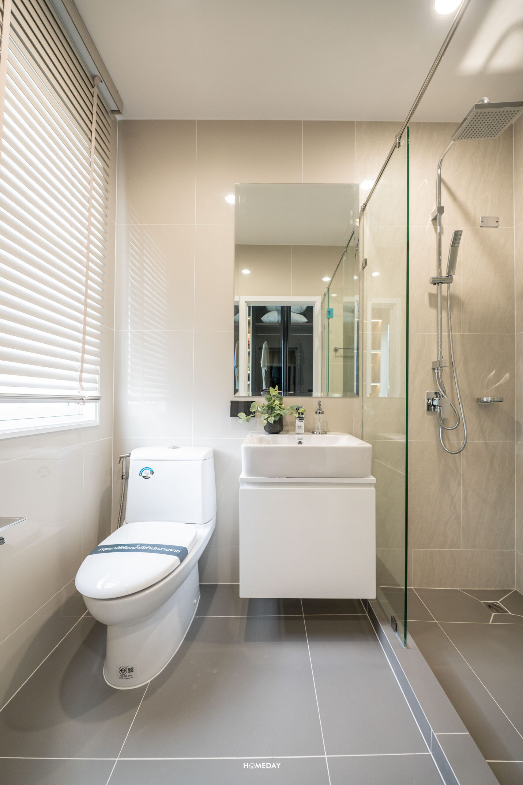 ห้องน้ำชั้น 1 กั้นส่วนเปียกส่วนแห้งชัดเจน ทางโครงการทำ Low Wall ด้านหลังอ่างล้างหน้าและโถสุขภัณท์ ไว้วางขวดสบู่ แชมพูได้ด้วยครับ อ่างล้างหน้ามีตู้เก็บของมาให้ด้านล่าง ได้กระจกบานใหญ่ Shower Box เป็นกระจกนิรภัย ติดตั้งฝักบัวมาให้ 2 แบบ ทั้งแบบ Hand Shower และ Rain Shower พร้อมที่วางสบู่ มีช่องแสงส่องเข้าถึงทำให้ไม่อึดอัด ทางโครงการวางระบบไฟฟ้าสำหรับติดตั้งเครื่องทำน้ำอุ่นไว้ให้ด้วยครับ
