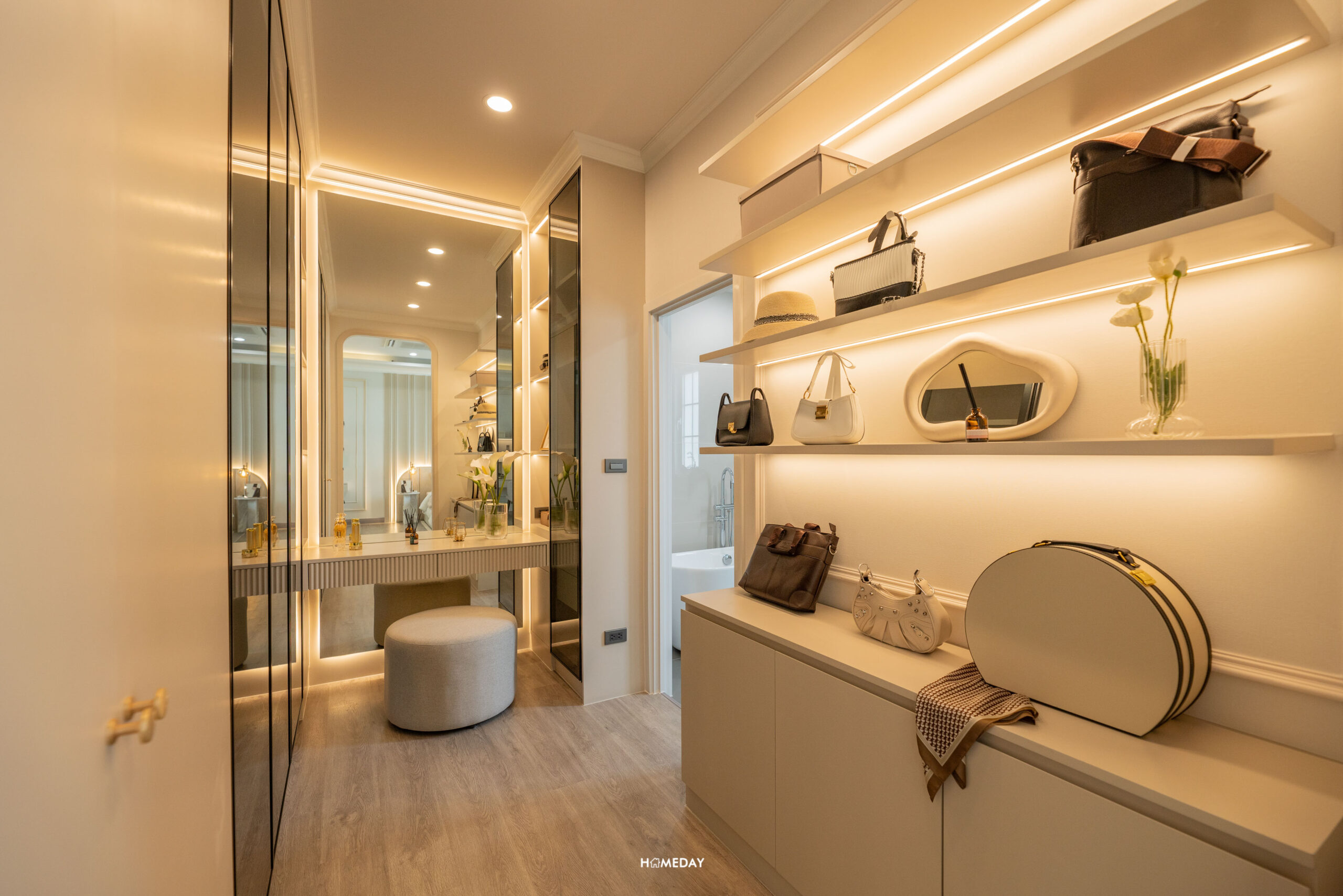 มาดูส่วนพื้นที่แต่งตัวกันบ้าง บ้านทุกหลังทางโครงการจะกั้นเป็นห้อง Walk-in Closet ไว้ให้ทุกห้อง สามารถที่จะ Built-in เป็นตู้และชั้นขนาดใหญ่ได้เต็มพื้นที่ และยังมีพื้นที่เหลือรองรับโต๊ะเครื่องแป้งได้พอดี ขวามือจะเป็นห้องน้ำของ Master Bedroom เป็นห้องน้ำที่ให้มา Full Function เลยครับ