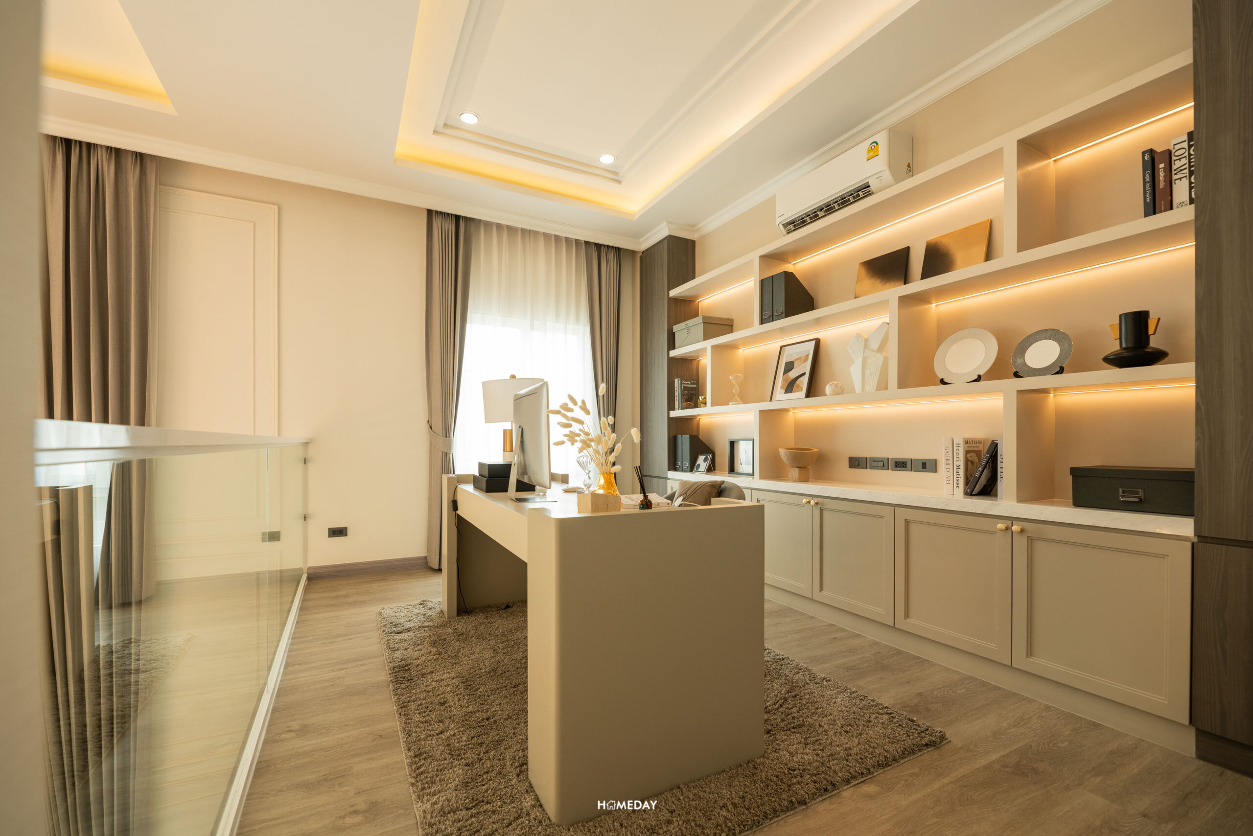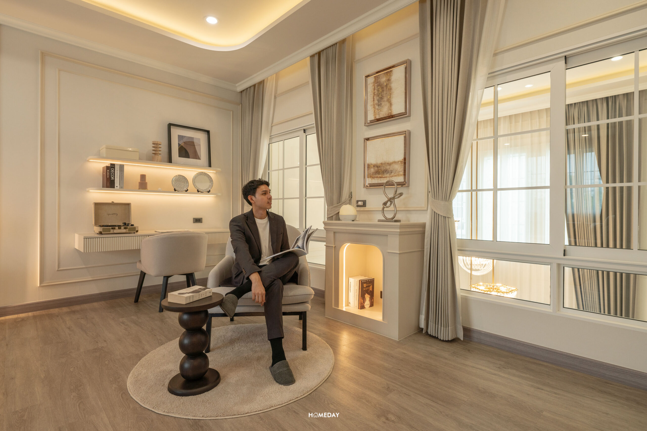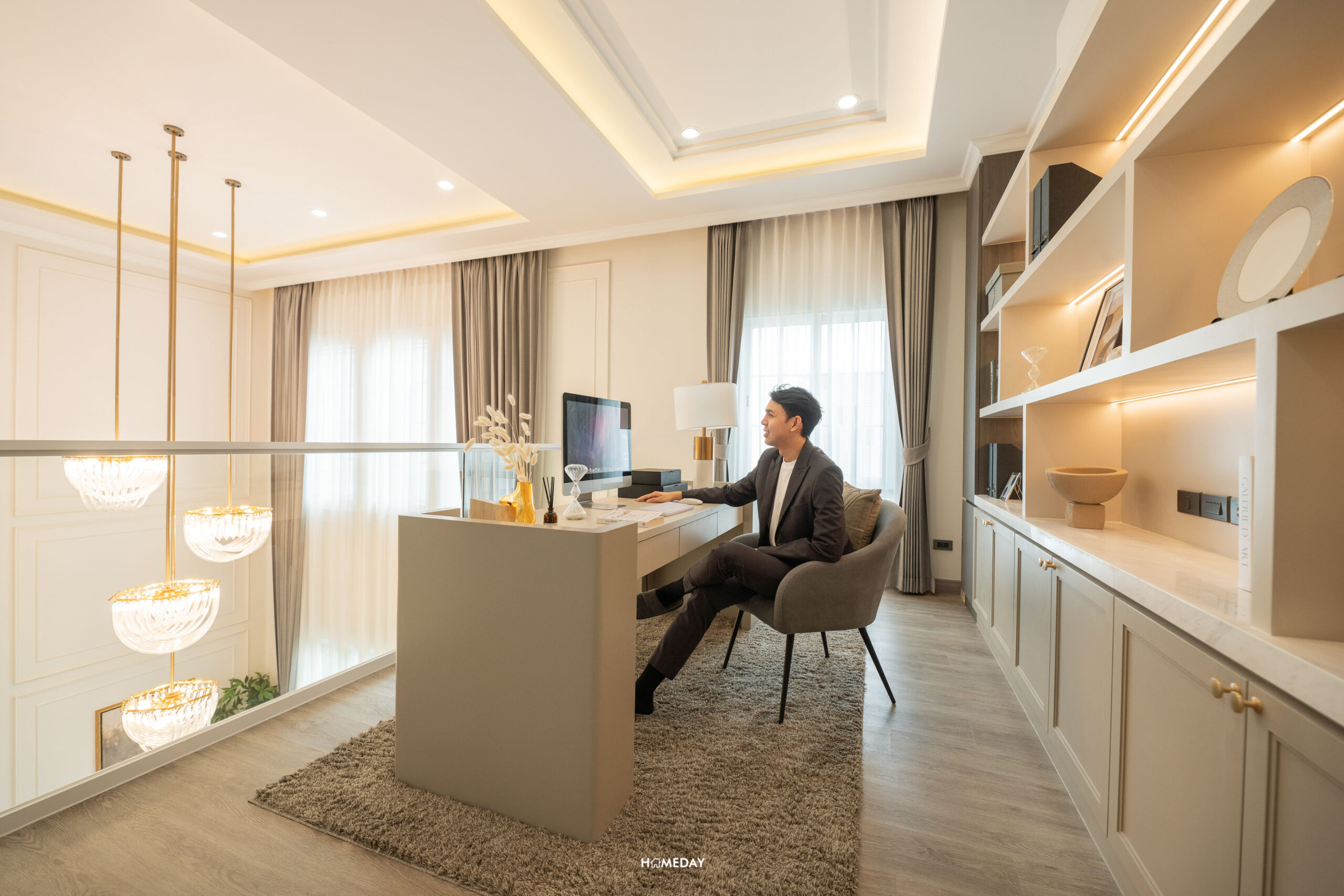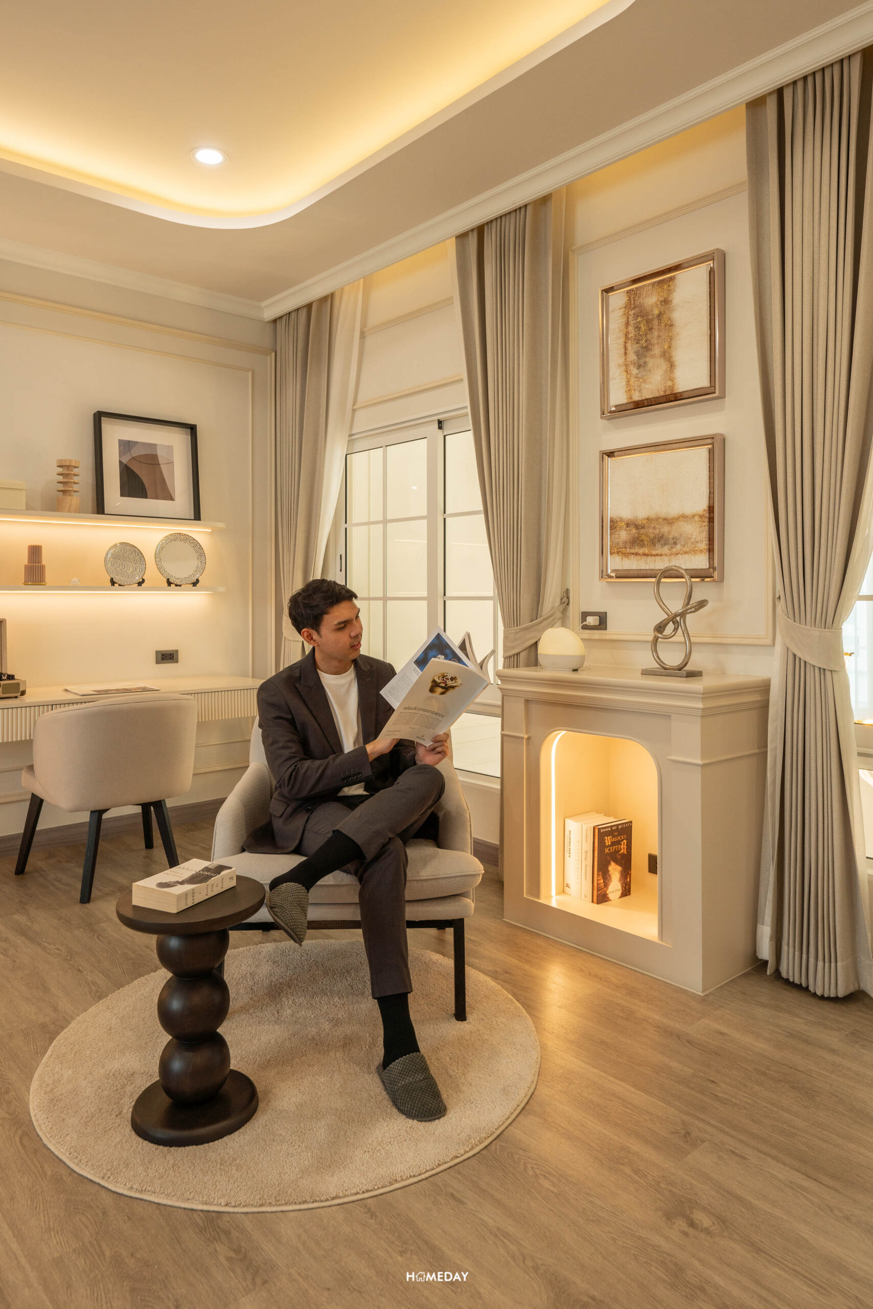 มองหันกลับไปยังอีกฝั่ง ก็จะมีหน้าต่างที่เปิดโล่ง มองไปยัง Dining Area ข้างล่างได้ โซนนี้ทางโครงการทำเป็นโซนนั่งทำงาน ที่มีโต๊ะทำงานขนาดใหญ่ มาพร้อมอาร์มแชร์ที่นั่งข้างเตาผิง ไว้สำหรับนั่งพักผ่อนชิล ๆ ให้อารมณ์เหมือนอยู่บ้านในยุโรปเลยครับ