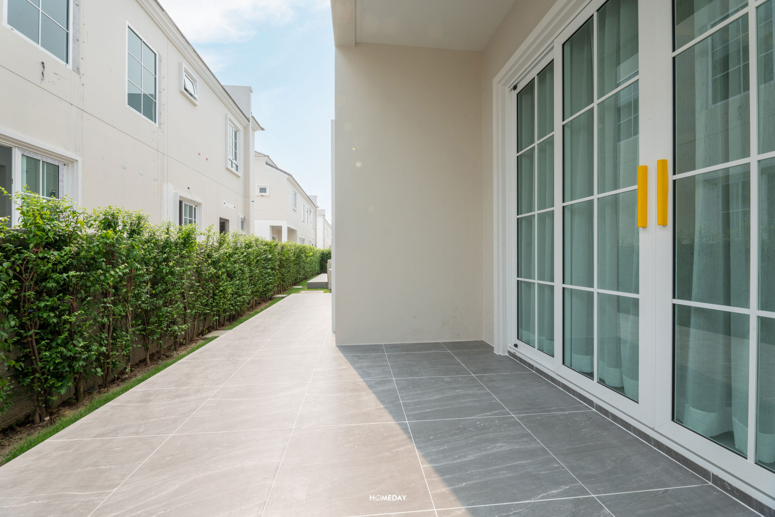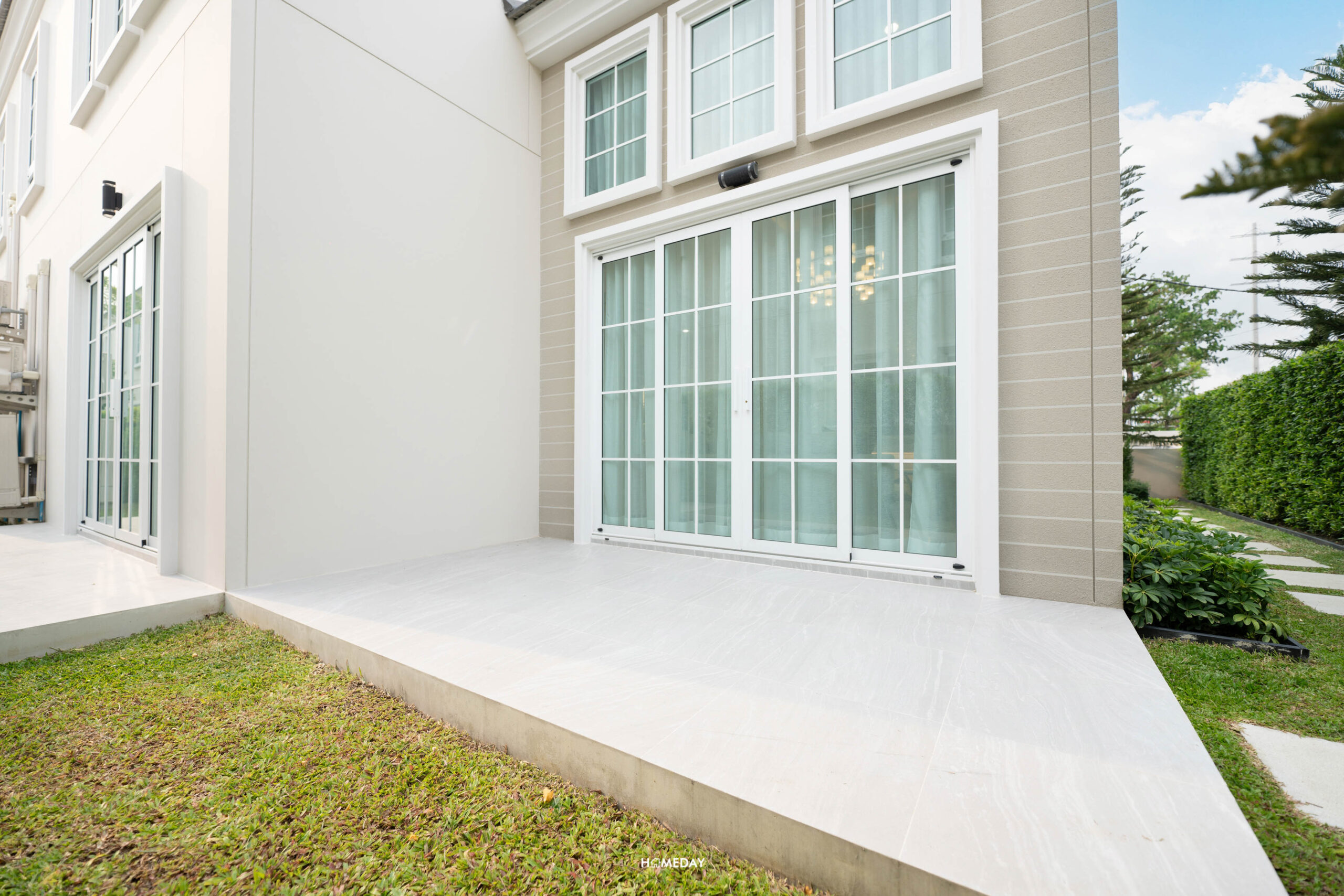 ในส่วนของด้านหลังบ้านที่เชื่อมต่อจากภายในบ้าน จะได้เฉลียงหลังบ้านมาถึง 3 จุด ทุกจุดลงเสาเข็ม เทคอนกรีตพร้อมปูพื้นกระเบื้องให้เรียบร้อย ประตูเป็นแบบบานเลื่อนเปิดกว้าง ประดับด้วยบัวประตูหน้าต่างขนาดใหญ่ กระจกเป็นกระจกเขียวตัดแสง ทำให้แสงที่ผ่านเข้ามาในบ้านไม่ร้อน และทำให้บ้านดูโปร่งโล่ง สามารถทำเป็นมุมนั่งเล่นพักผ่อนเพิ่มเติมได้เลยครับ