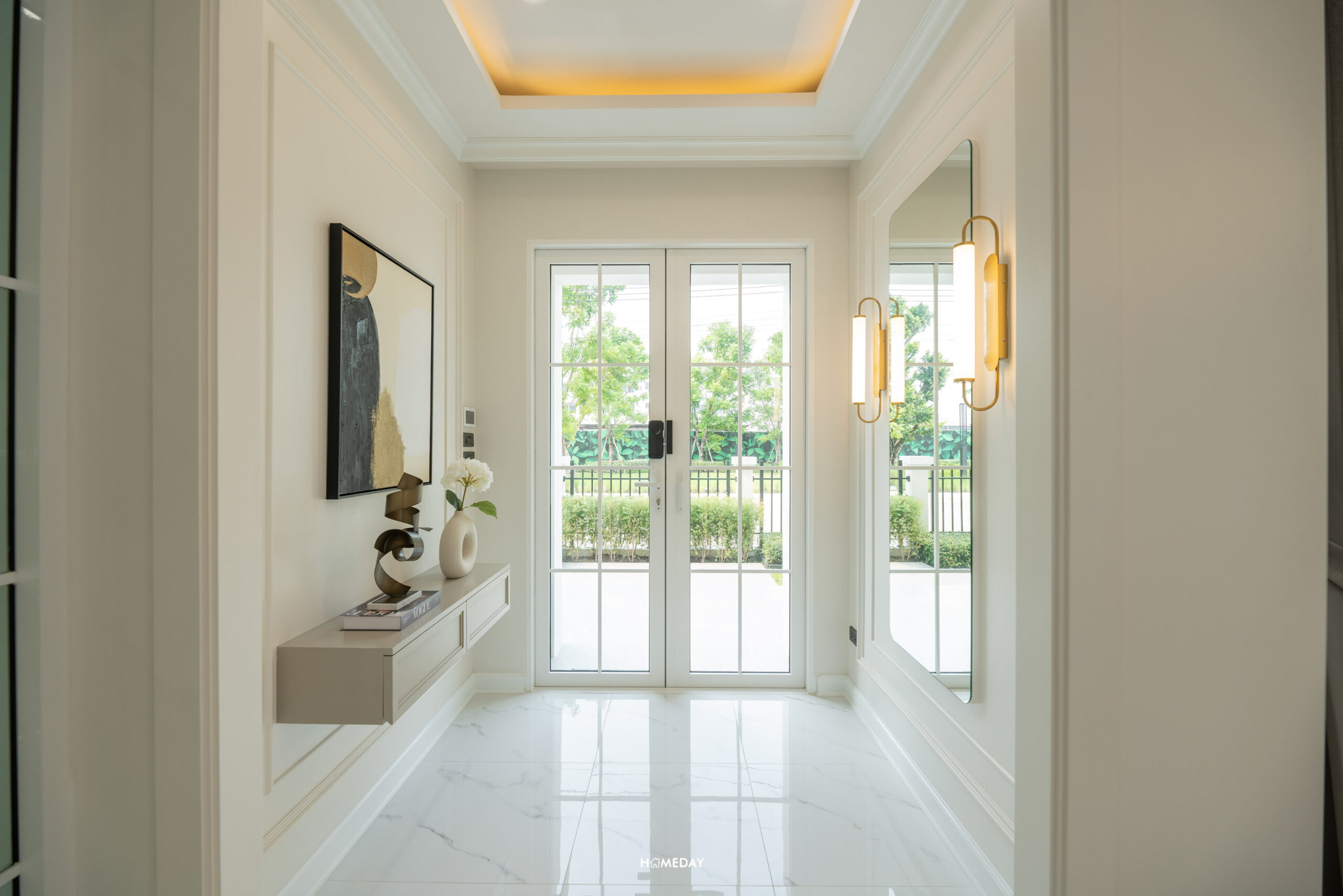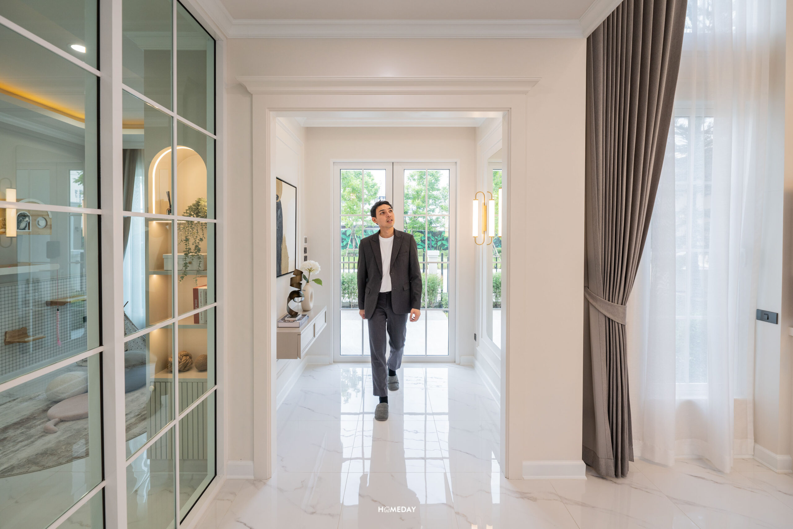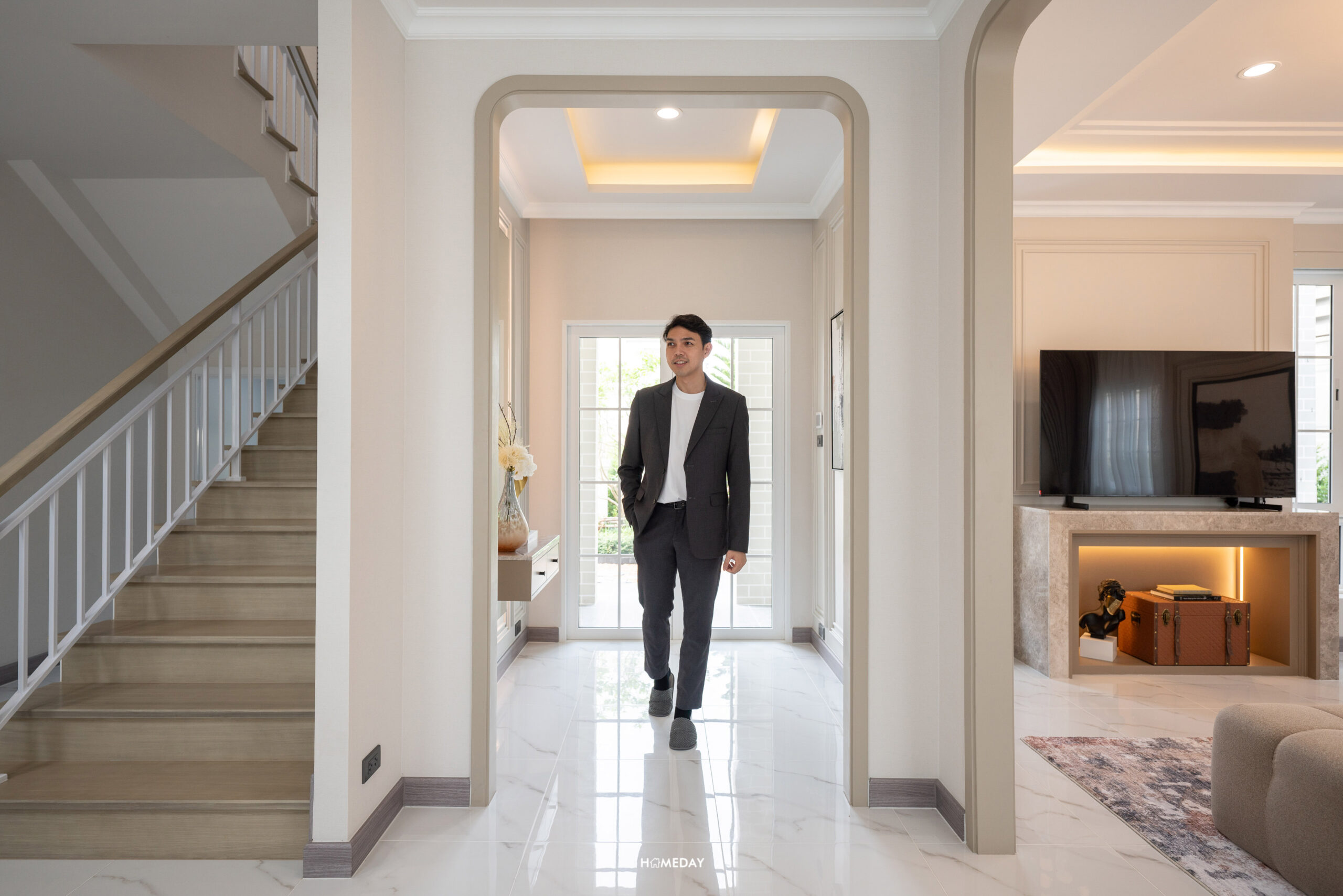 เดินเข้ามาภายในบ้าน จะเจอกับ Foyer ที่กั้นความเป็นส่วนตัวก่อนเข้าไปถึง Living Area ตรงโซนนี้สามารถทำเป็นที่นั่งเปลี่ยนรองเท้า หรือตกแต่งเป็นกระจกบานใหญ่ไว้ส่องเช็กดูความเรียบร้อยก่อนออกจากบ้านก็ได้ครับ ในส่วนของความสูงทั่วไปภายในบ้าน Floor to Ceiling อยู่ที่ 2.8 เมตร พื้นชั้น 1 ปูเป็นกระเบื้อง Porcelain ลายหินอ่อน มีความแข็งแรงทนทาน ให้ความรู้สึกหรูหราตามแบบฉบับบ้านหรู