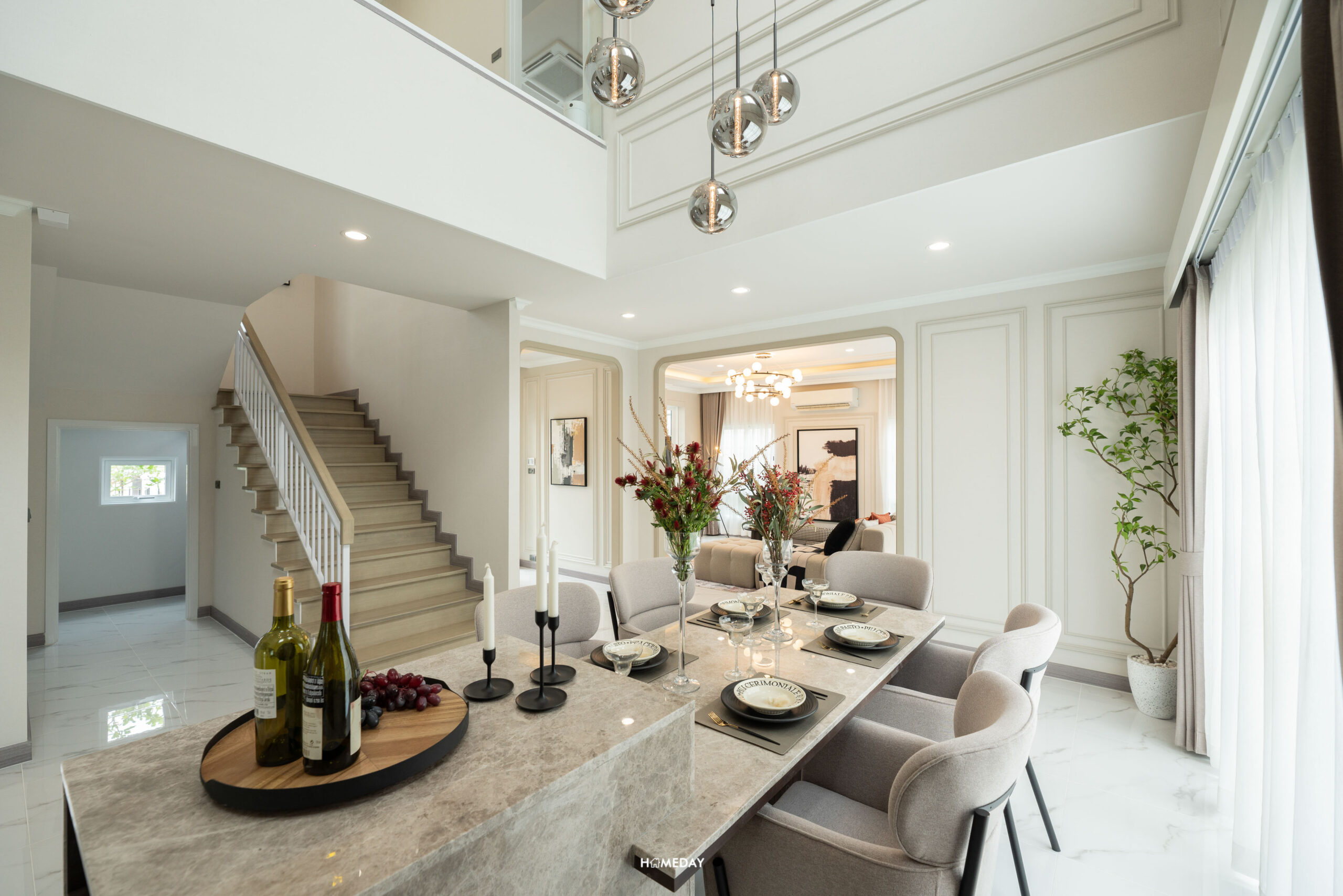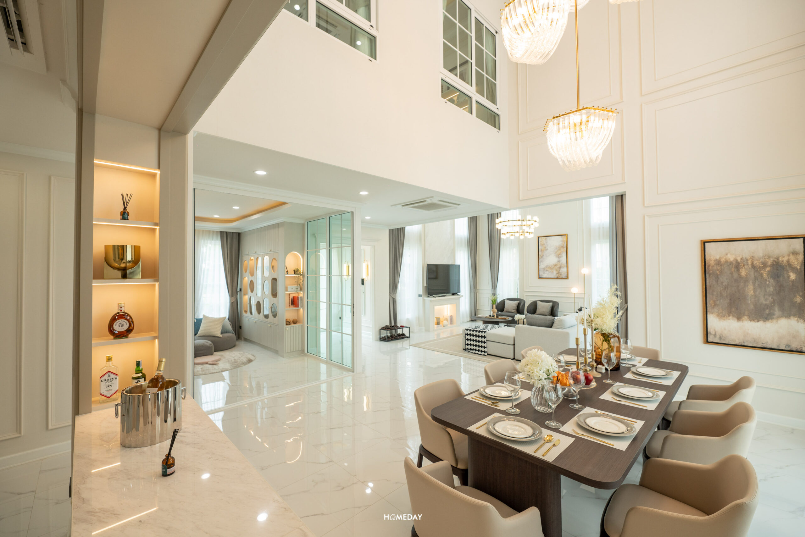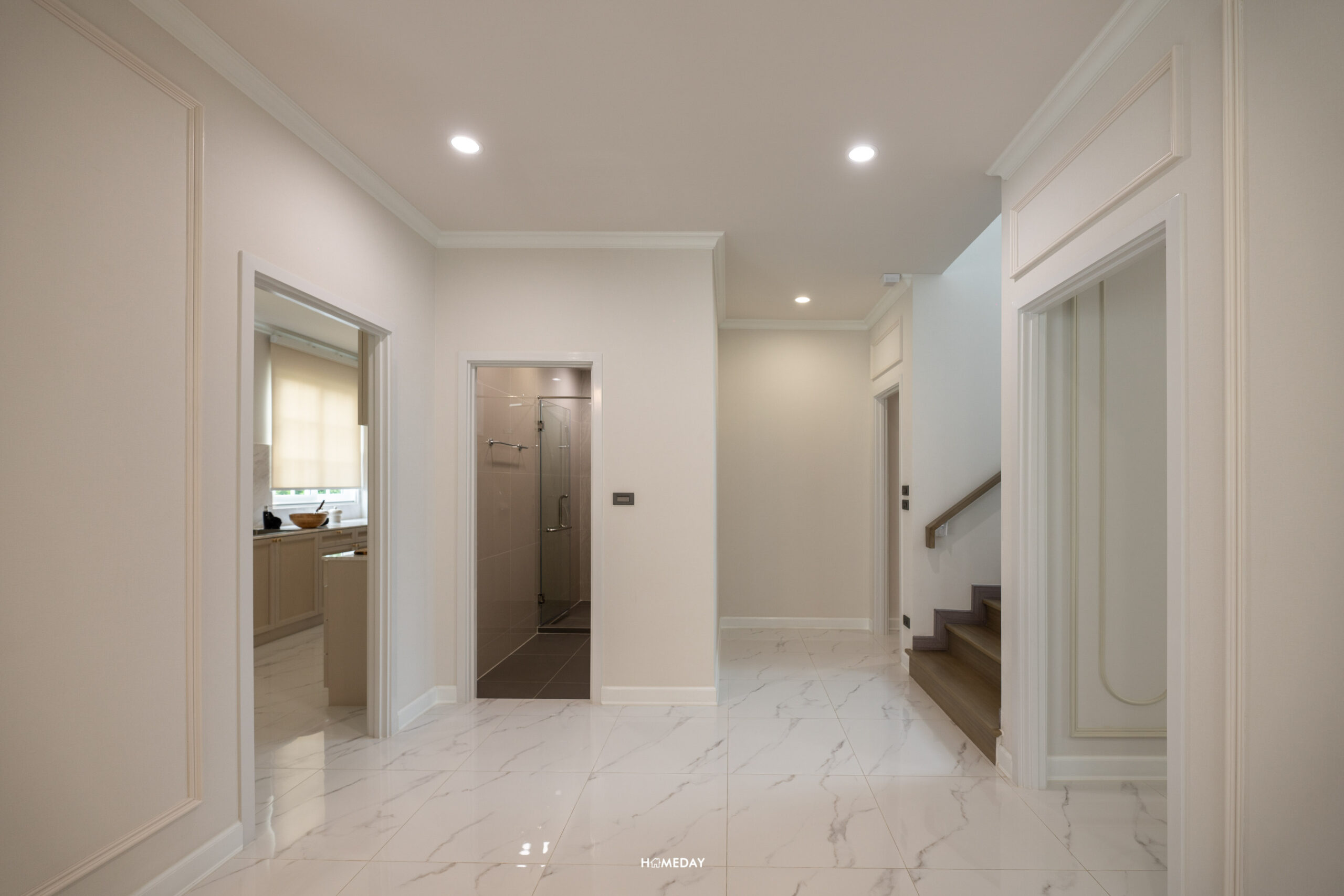 เดินเข้ามาภายในบ้าน จะเจอกับ Foyer ที่กั้นความเป็นส่วนตัวก่อนเข้าไปถึง Living Area ตรงโซนนี้สามารถทำเป็นที่นั่งเปลี่ยนรองเท้า หรือตกแต่งเป็นกระจกบานใหญ่ไว้ส่องเช็กดูความเรียบร้อยก่อนออกจากบ้านก็ได้ครับ ในส่วนของความสูงทั่วไปภายในบ้าน Floor to Ceiling อยู่ที่ 2.8 เมตร พื้นชั้น 1 ปูเป็นกระเบื้อง Porcelain ลายหินอ่อน มีความแข็งแรงทนทาน ให้ความรู้สึกหรูหราตามแบบฉบับบ้านหรู