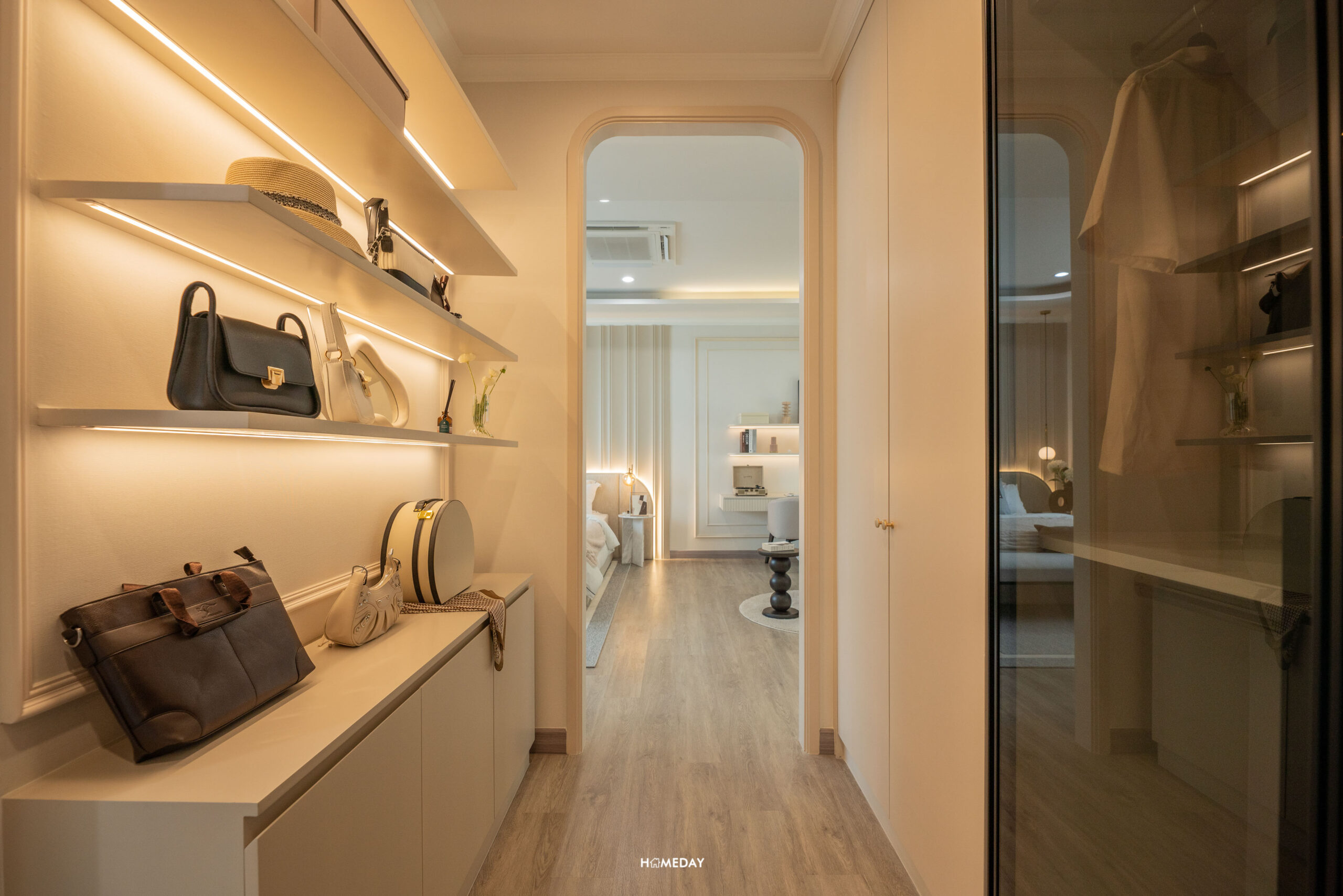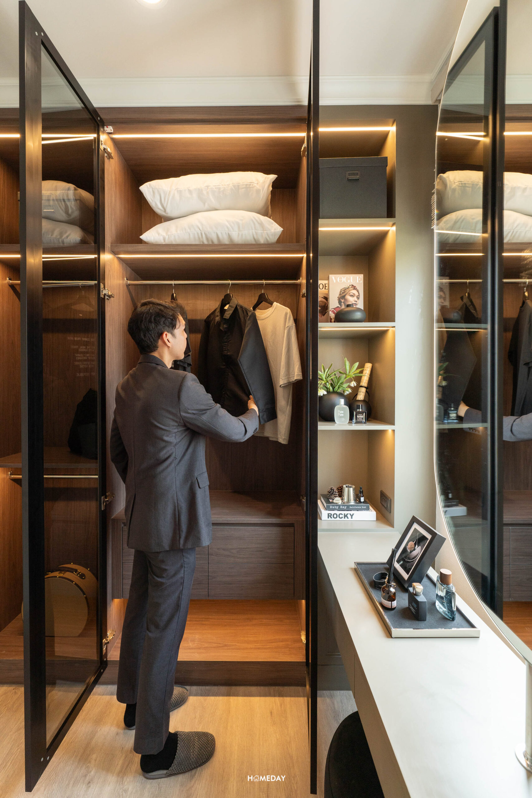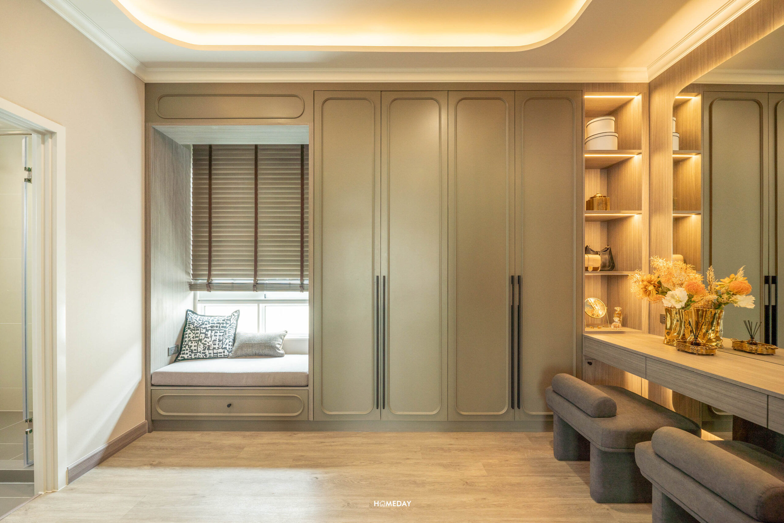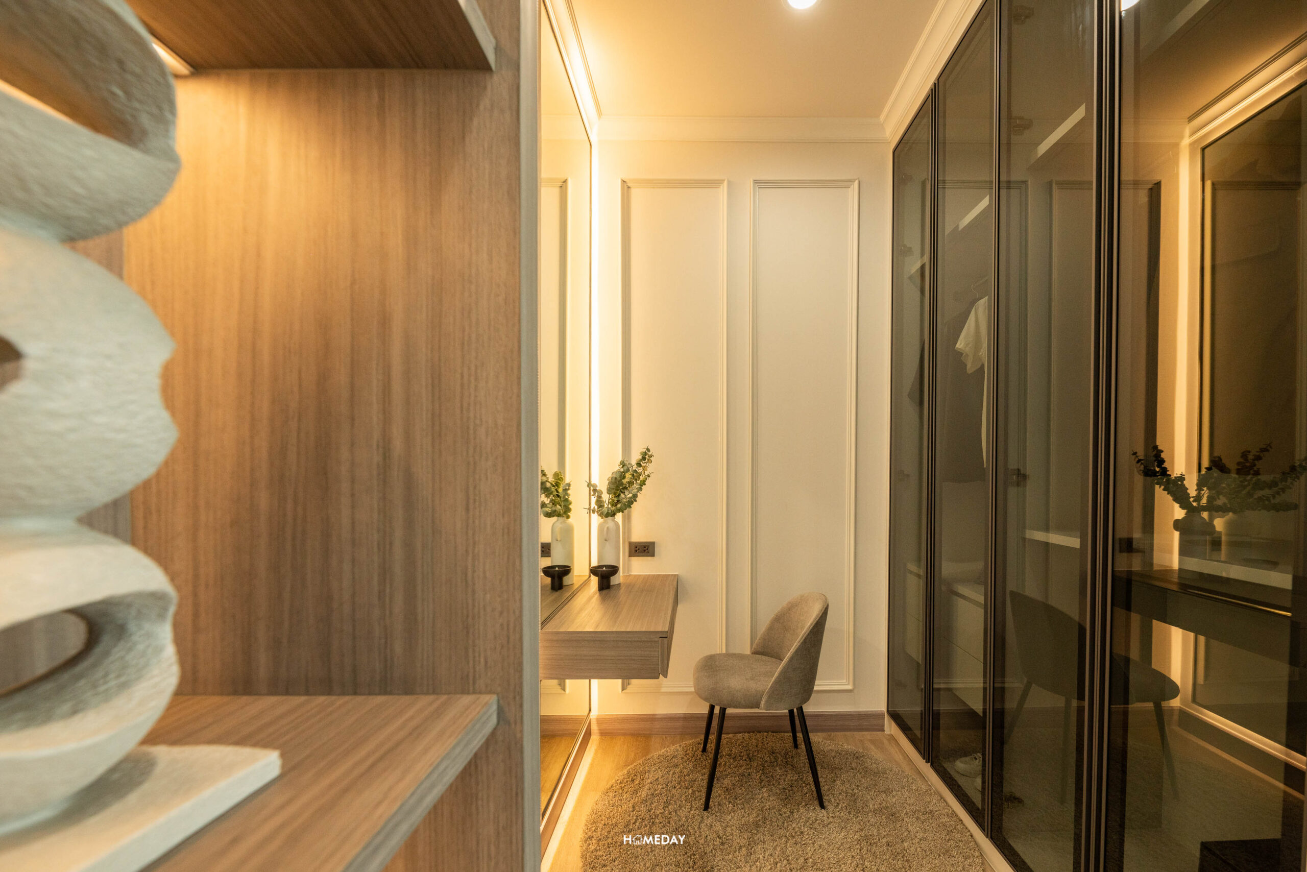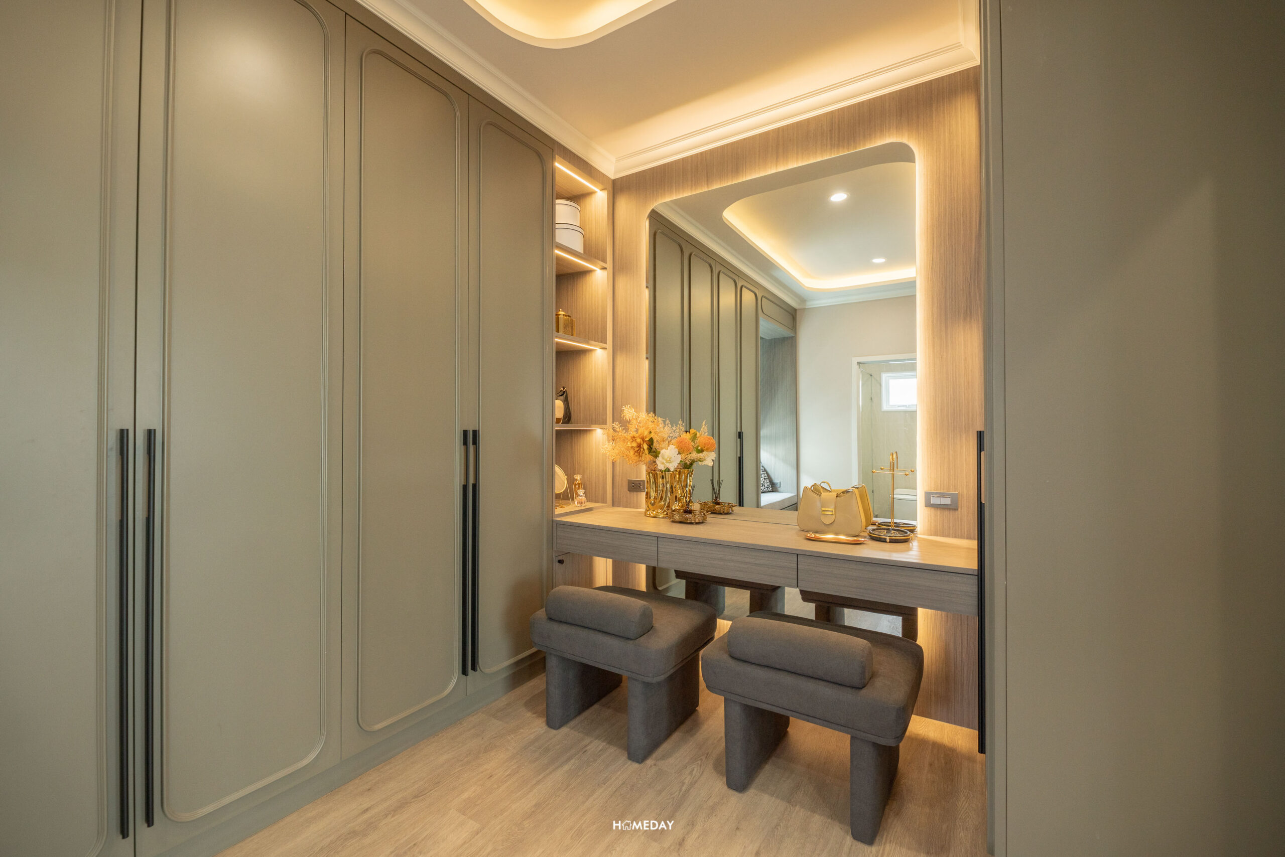 มาต่อกันที่ห้องนอน 2 เข้ามาจะเจอกับโซน Walk-in Closet ก่อนเลยครับ แบ่งแยกความเป็นส่วนตัวไว้ได้ดีทีเดียว ซ้ายมือจะเป็นโต๊ะเครื่องแป้ง ส่วนพื้นที่ 2 ฝั่ง ซ้ายและขวา สามารถ Built-in ทำเป็นตู้เสื้อผ้าขนาดใหญ่ได้เลย