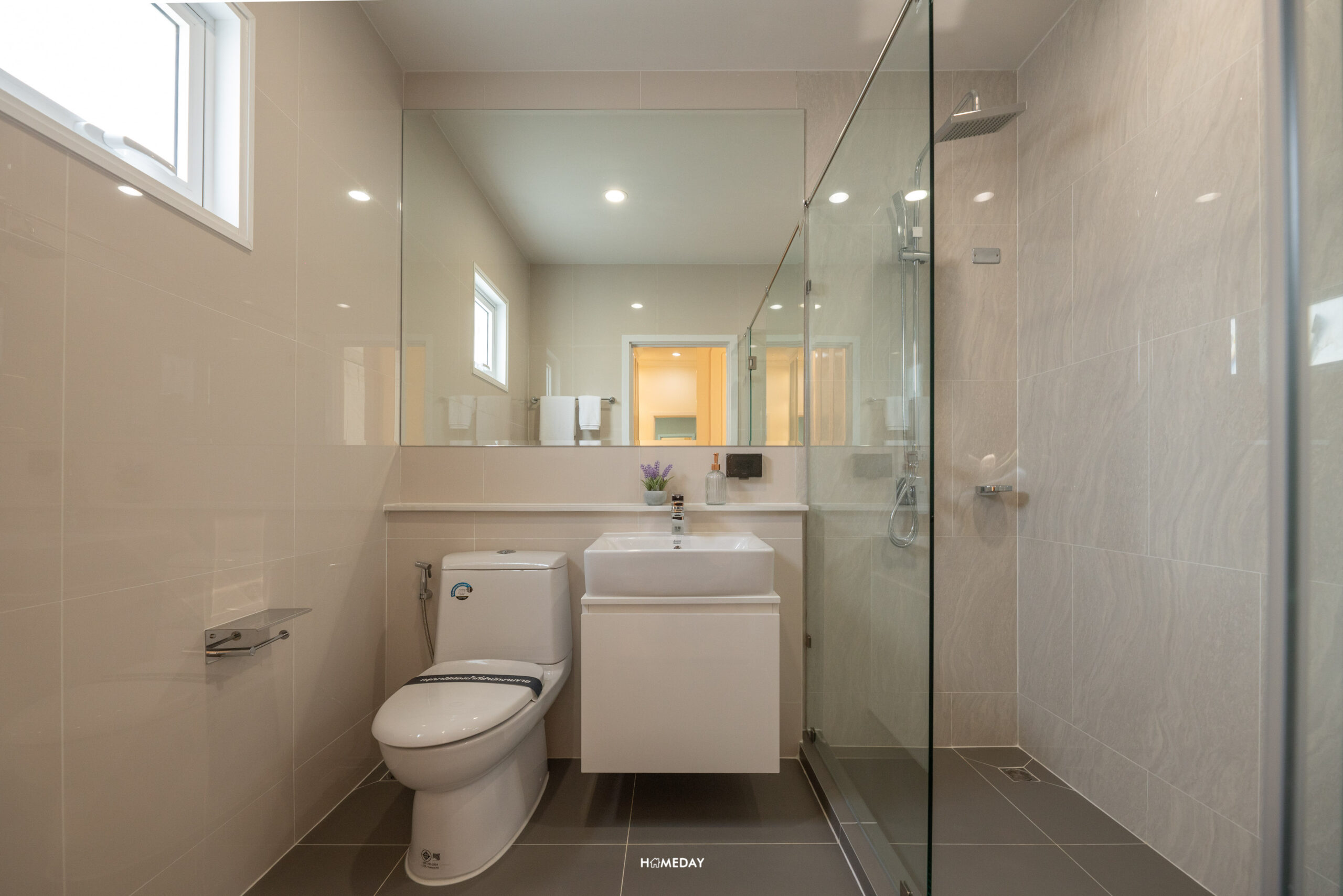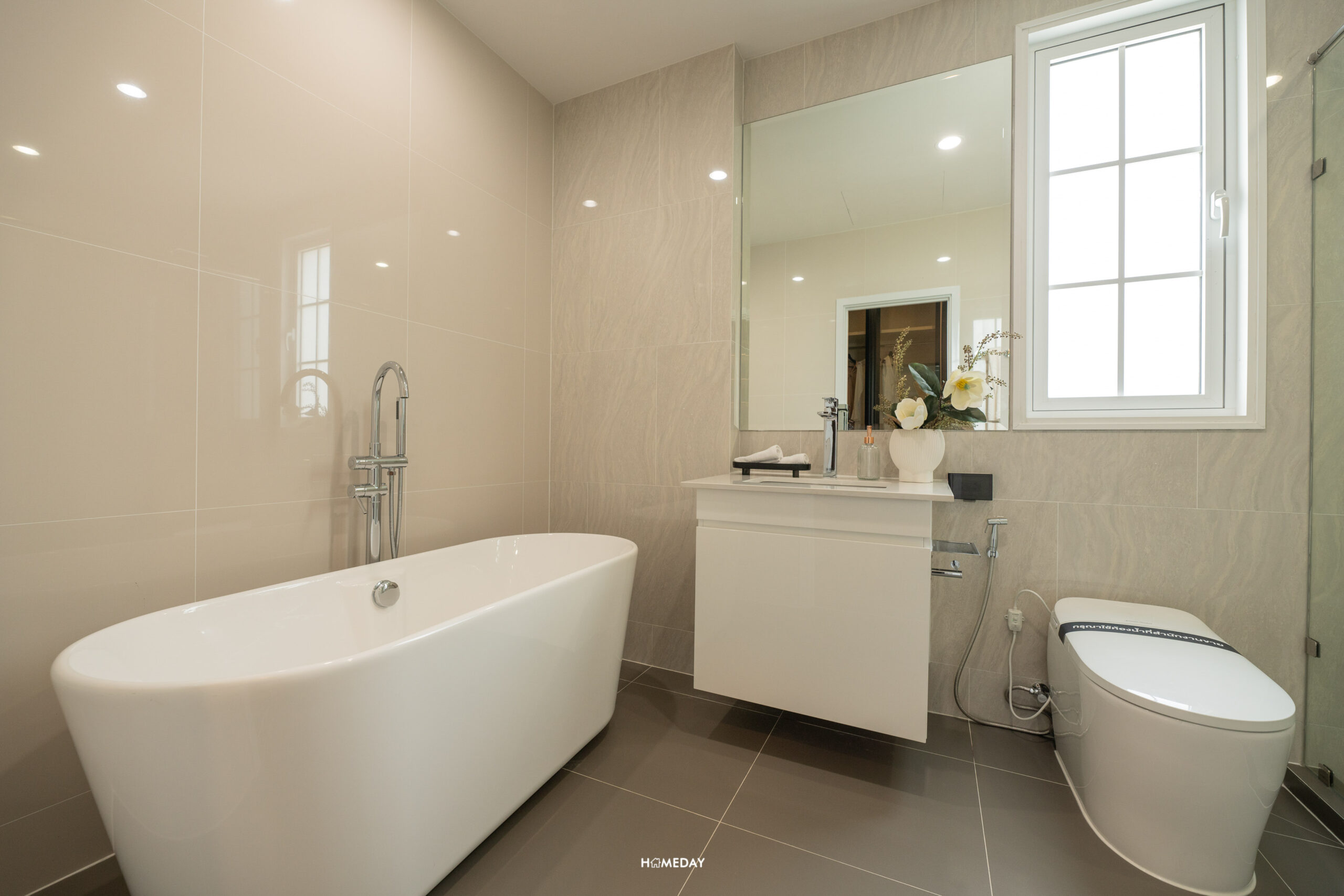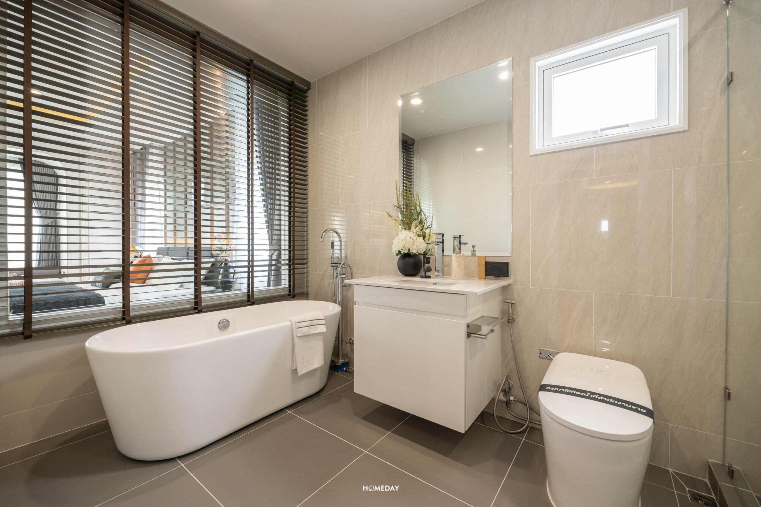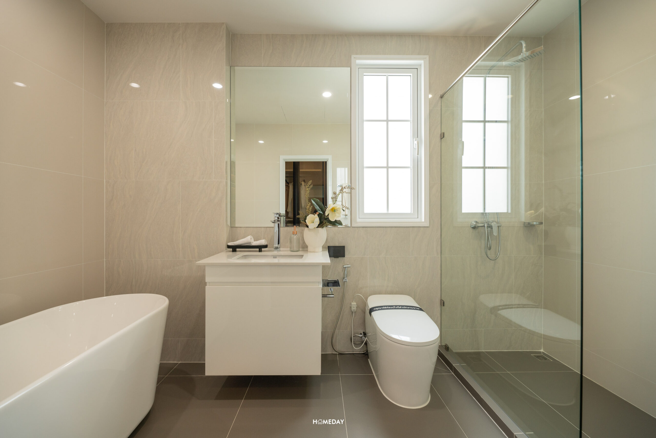 ห้องน้ำของ Master Bedroom มาพร้อมฉากกั้นอาบน้ำ ฝักบัวให้มา 2 แบบ ทั้ง Hand Shower และ Rain Shower สุขภัณฑ์จาก American Standard ในส่วนของโถสุขภัณฑ์จะเป็นระบบอัตโนมัติ และ Bathtub แบบ Freestanding ให้เฉพาะห้อง Master Bedroom เท่านั้นครับ อ่างล้างหน้าขนาดพอเหมาะสามารถวาง แปรงสีฟัน หรือจะตกแต่งด้วยแจกันเครื่องหอมก็ได้ ด้านล่างเป็นตู้เก็บของได้ พร้อมกระจกส่องหน้าบานใหญ่ ด้านข้างเป็นหน้าต่างช่องแสงขนาดใหญ่ ทำให้ประหยัดไฟได้ในเวลากลางวัน