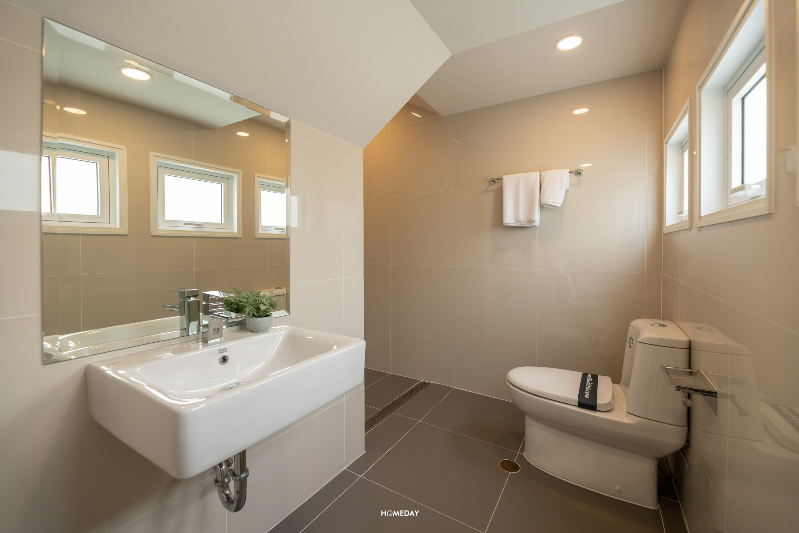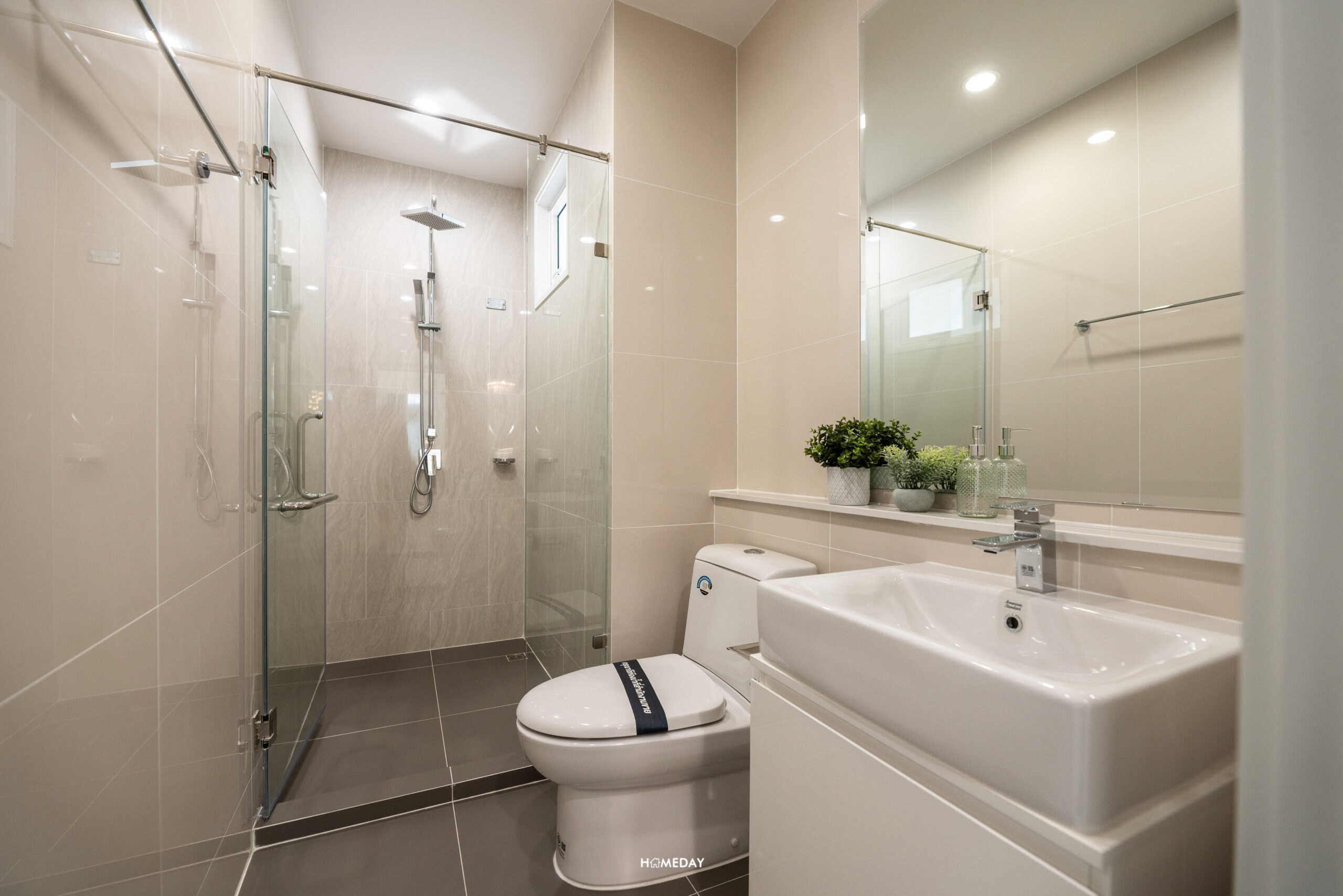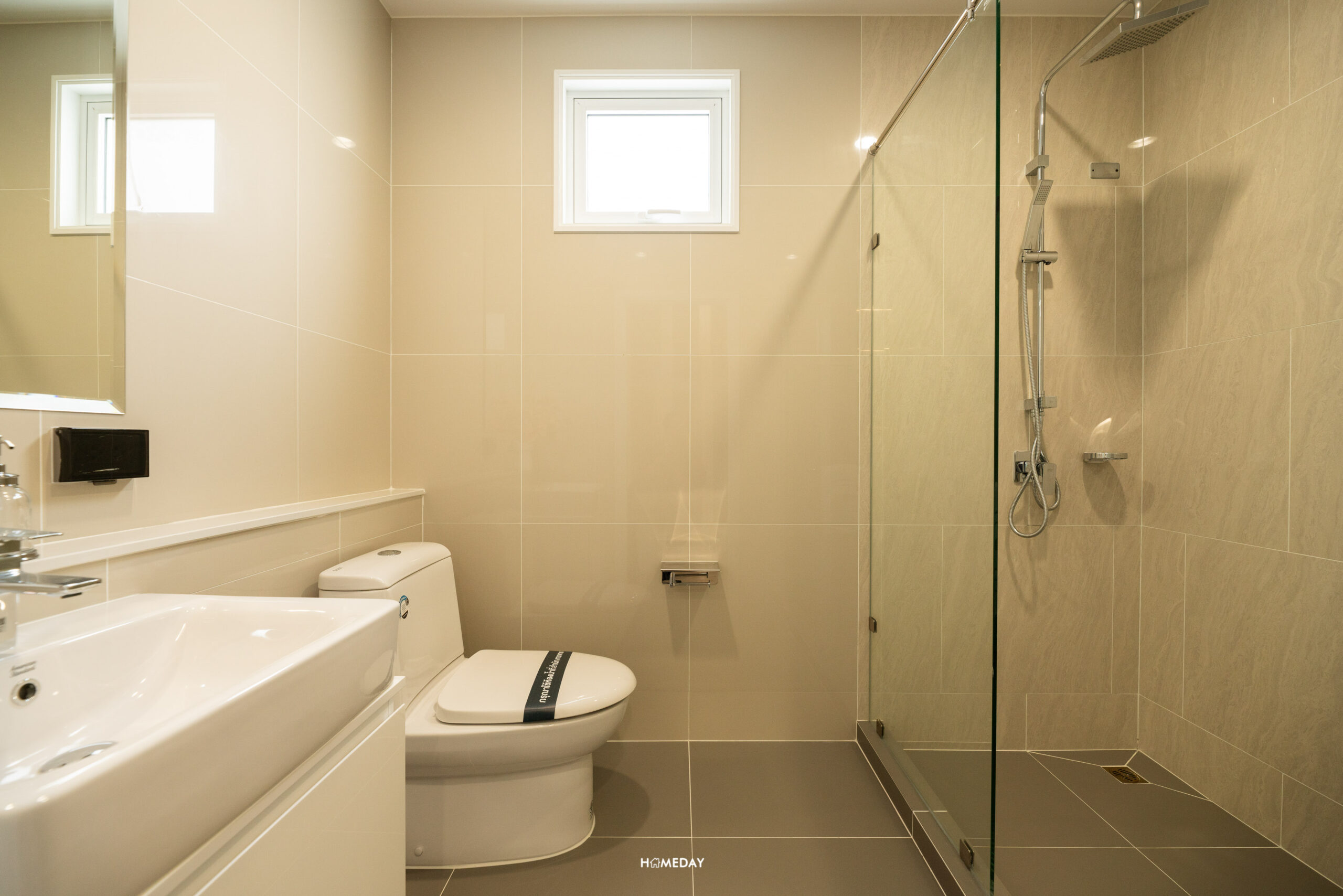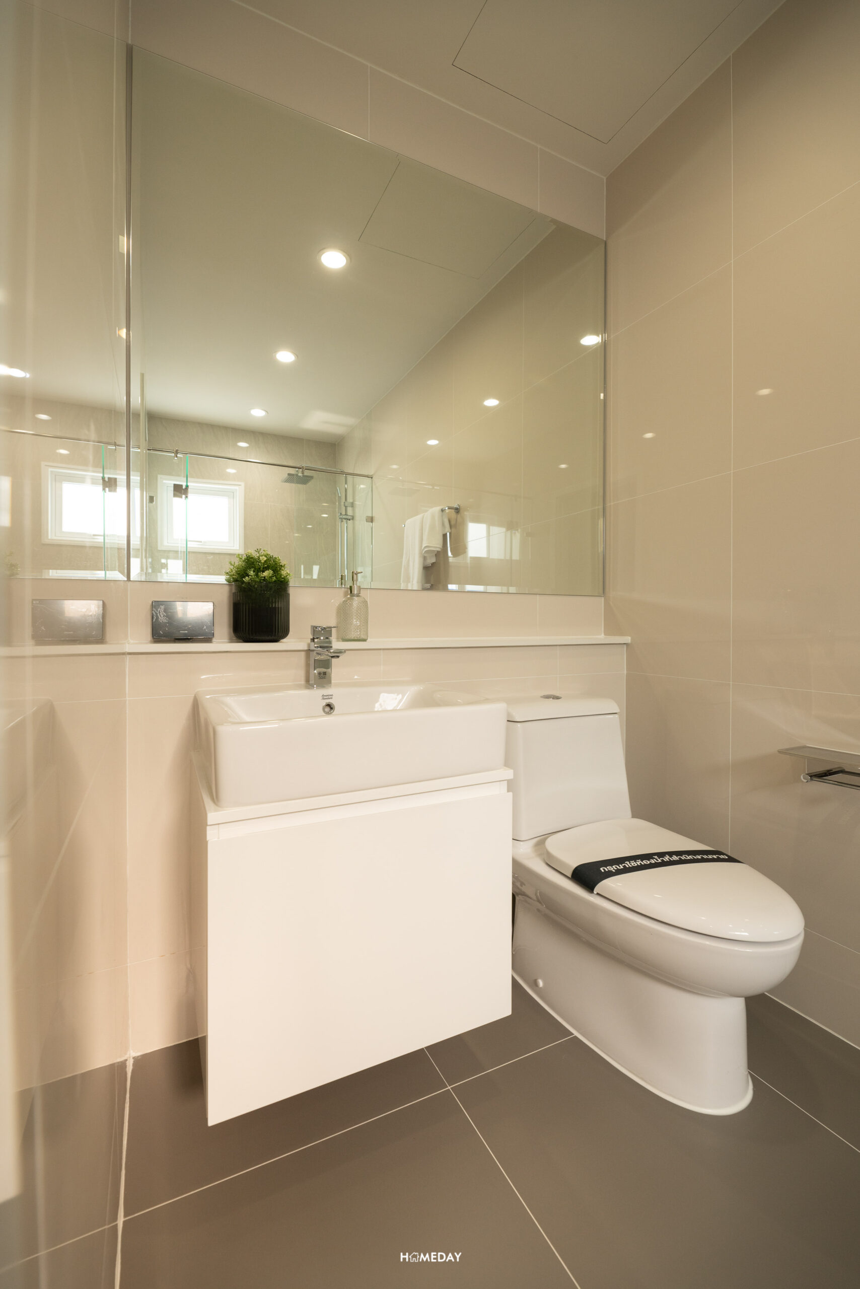 ห้องน้ำของ Master Bedroom มาพร้อมฉากกั้นอาบน้ำ ฝักบัวให้มา 2 แบบ ทั้ง Hand Shower และ Rain Shower สุขภัณฑ์จาก American Standard ในส่วนของโถสุขภัณฑ์จะเป็นระบบอัตโนมัติ และ Bathtub แบบ Freestanding ให้เฉพาะห้อง Master Bedroom เท่านั้นครับ อ่างล้างหน้าขนาดพอเหมาะสามารถวาง แปรงสีฟัน หรือจะตกแต่งด้วยแจกันเครื่องหอมก็ได้ ด้านล่างเป็นตู้เก็บของได้ พร้อมกระจกส่องหน้าบานใหญ่ ด้านข้างเป็นหน้าต่างช่องแสงขนาดใหญ่ ทำให้ประหยัดไฟได้ในเวลากลางวัน