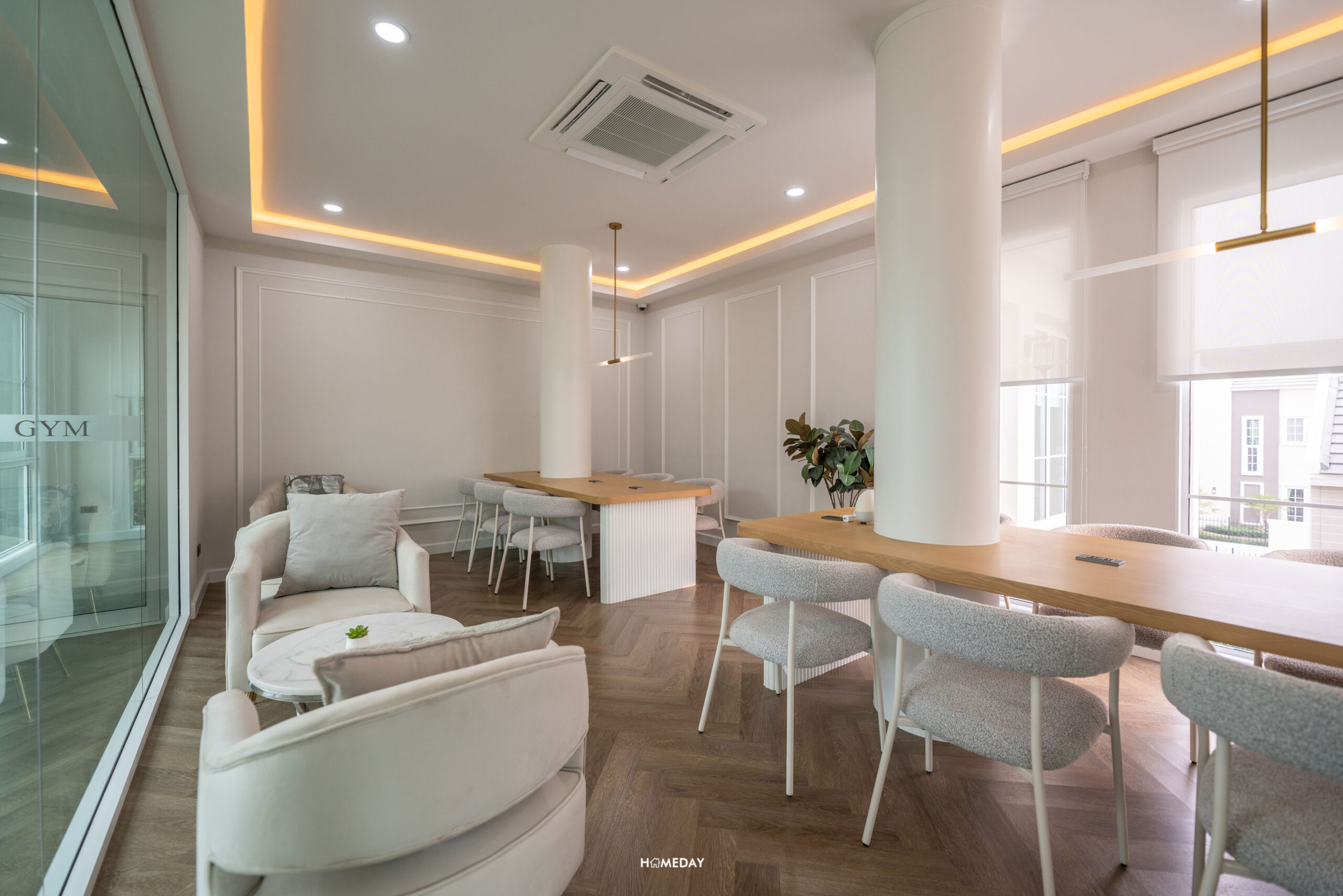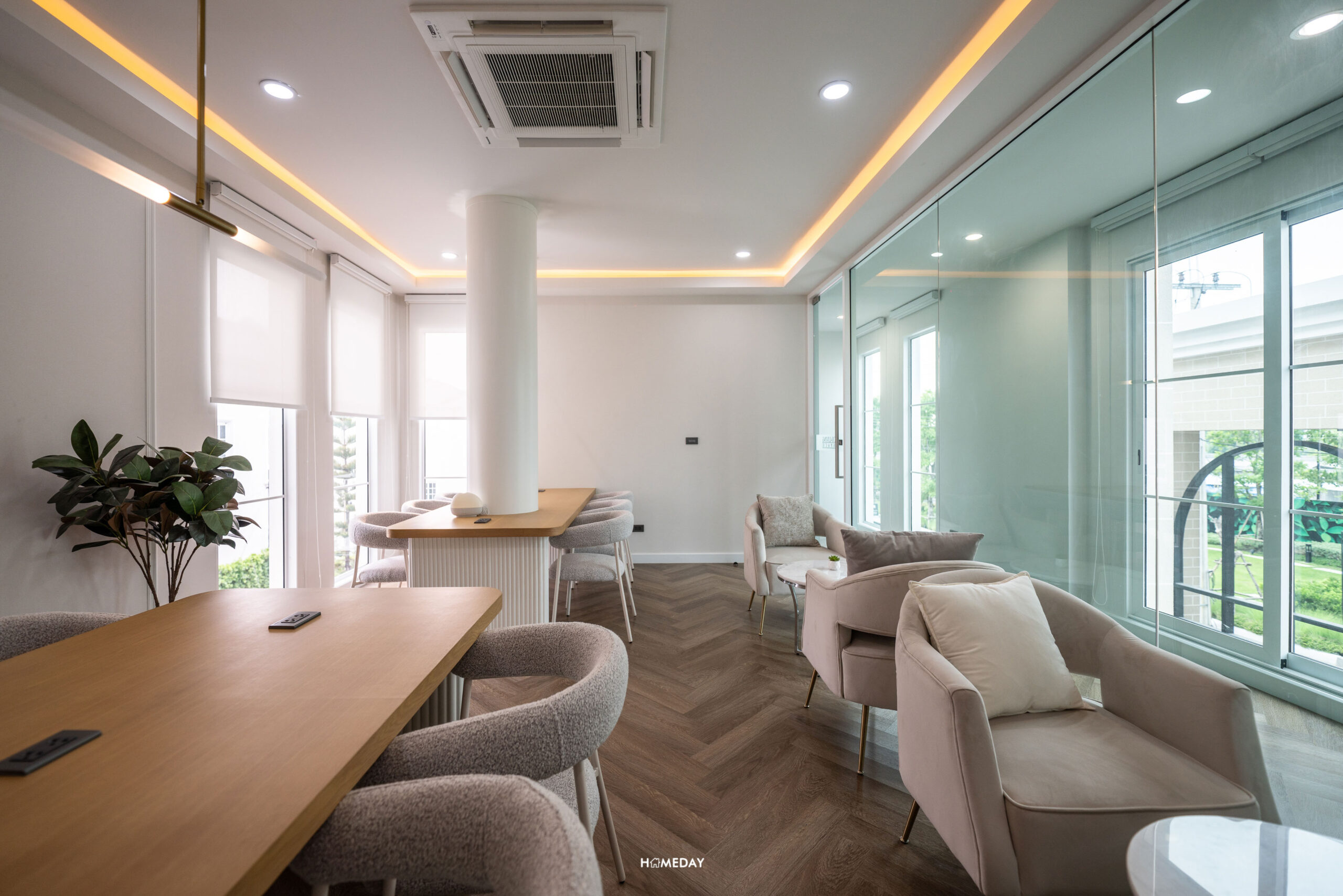 ในส่วนของห้อง Co-living Space เป็นห้องผนังกระจกแบบ Full Height วางชุดเก้าอี้ไว้ให้เป็นที่นั่งพักผ่อนแบบ 2 ท่าน หรือจะประชุมกันแบบกลุ่มก็มีแบบ 6 ที่นั่งด้วยครับ ส่วนโต๊ะจะมีปลั๊กไฟไว้รองรับการชาร์จโทรศัพท์และ Laptop เพื่อไม่พลาดการติดต่อ หรือทำงานได้อย่างต่อเนื่อง