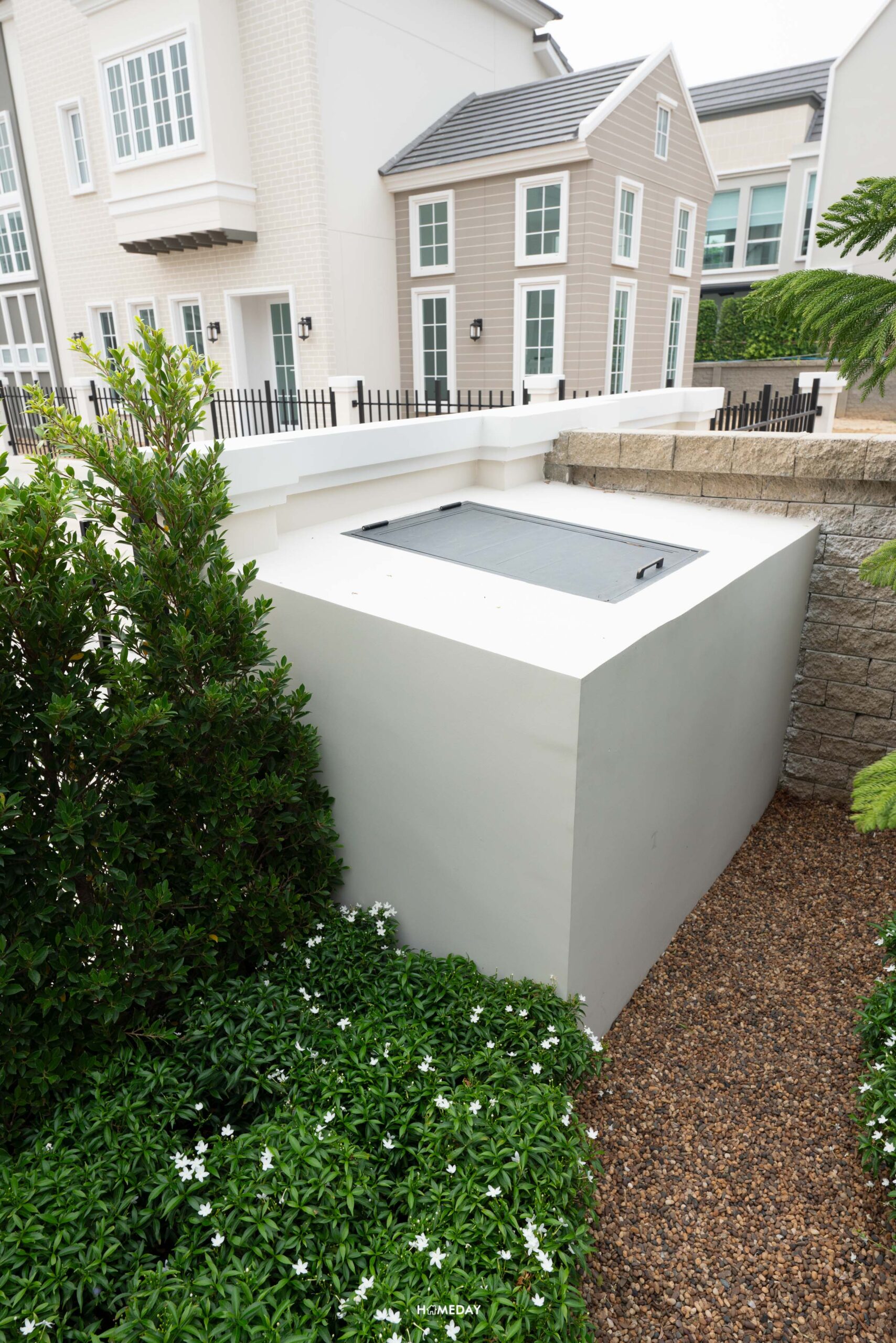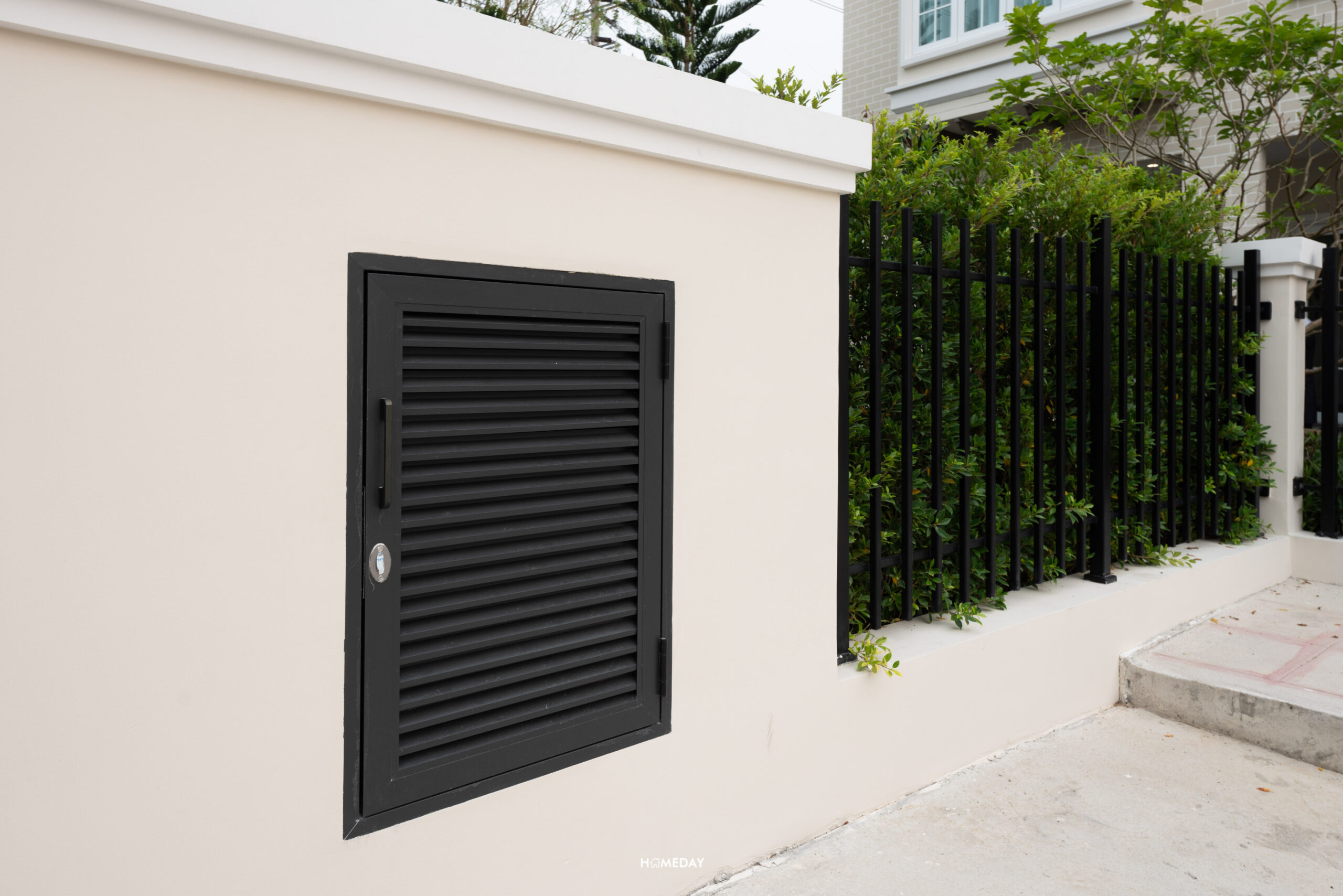 ถังขยะเป็นแบบฝังกำแพงตั้งอยู่หน้าบ้าน หน้าบานเป็น Aluminium สีดำ ง่ายต่อการ Service ส่วนตัวถังจะอยู่ด้านในบ้านก่อปูนสูงเท่ากับรั้ว มีฝาปิดมิดชิดมาให้ ช่วยเก็บกลิ่น และทำให้ดูเรียบร้อยเป็นระเบียบ หมดห่วงเรื่องความสกปรกหน้าบ้านไปได้เลยครับ