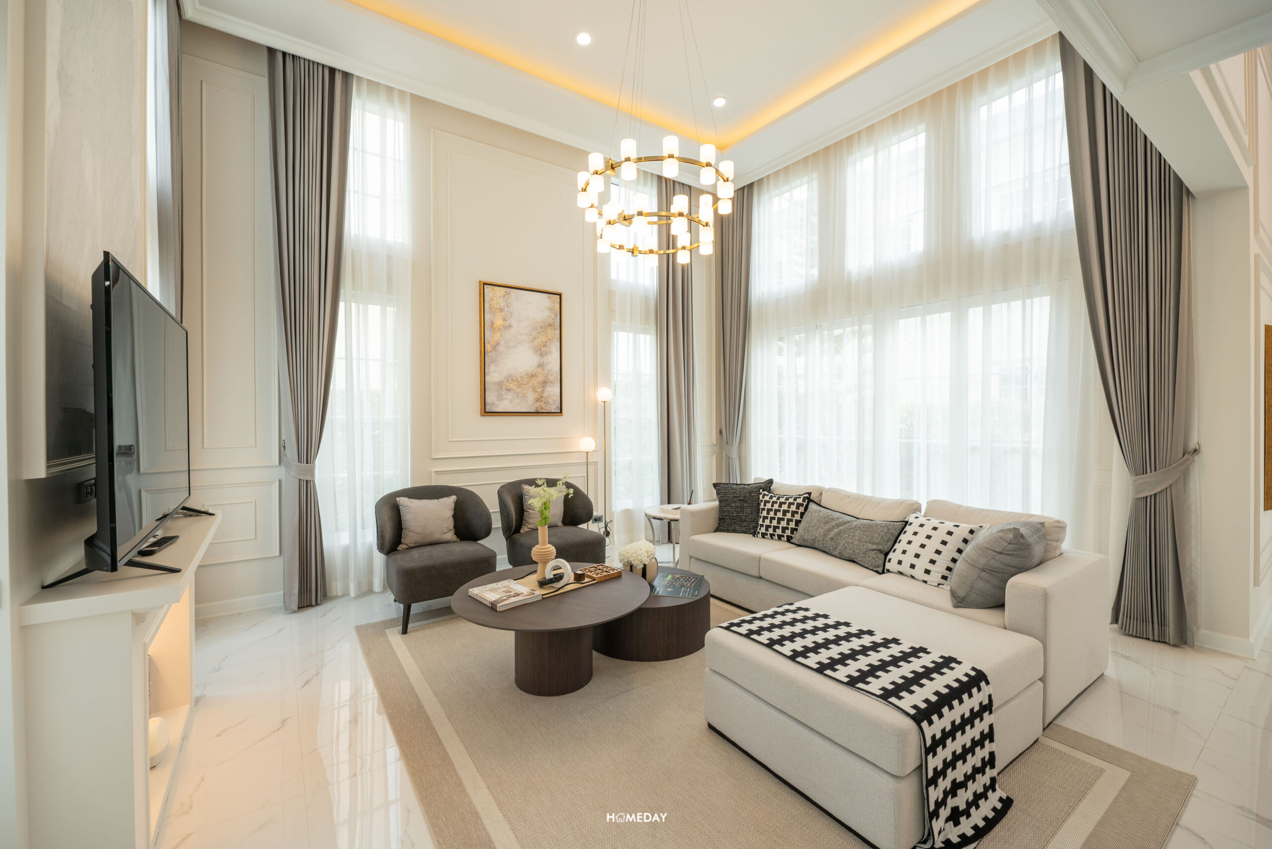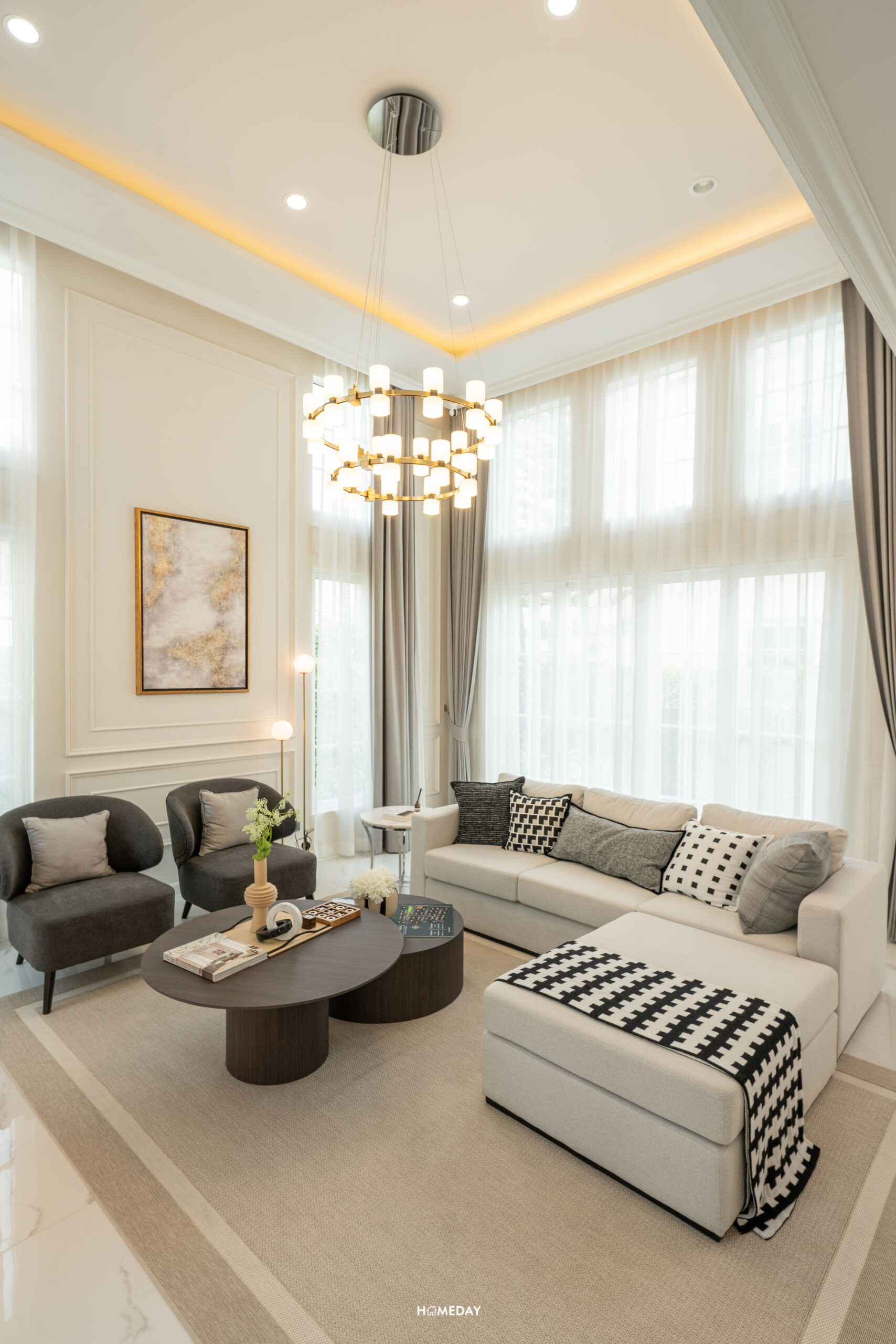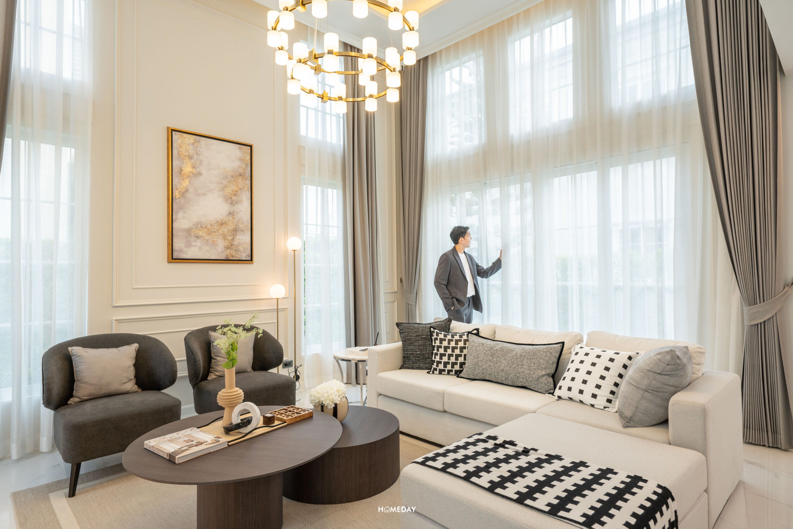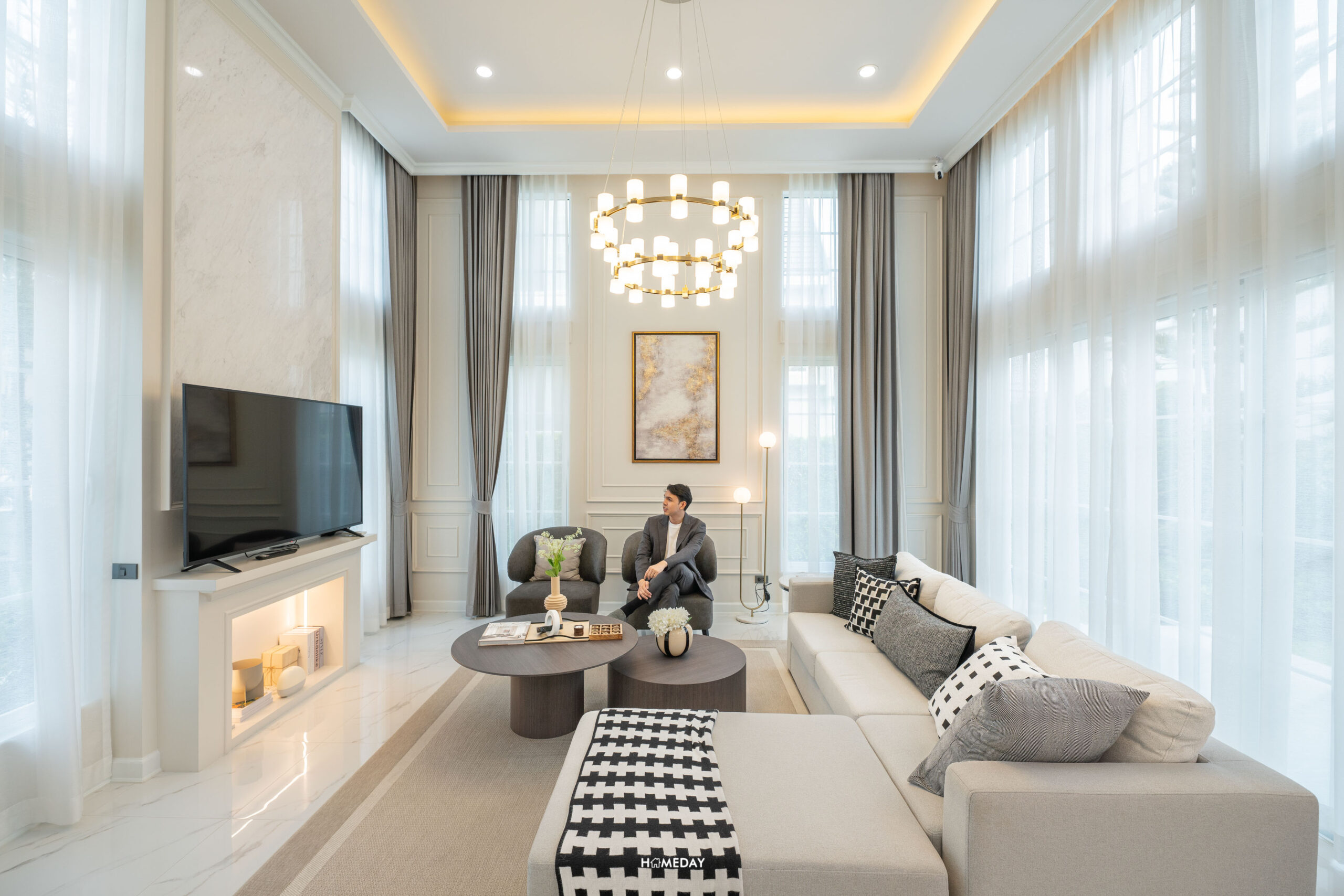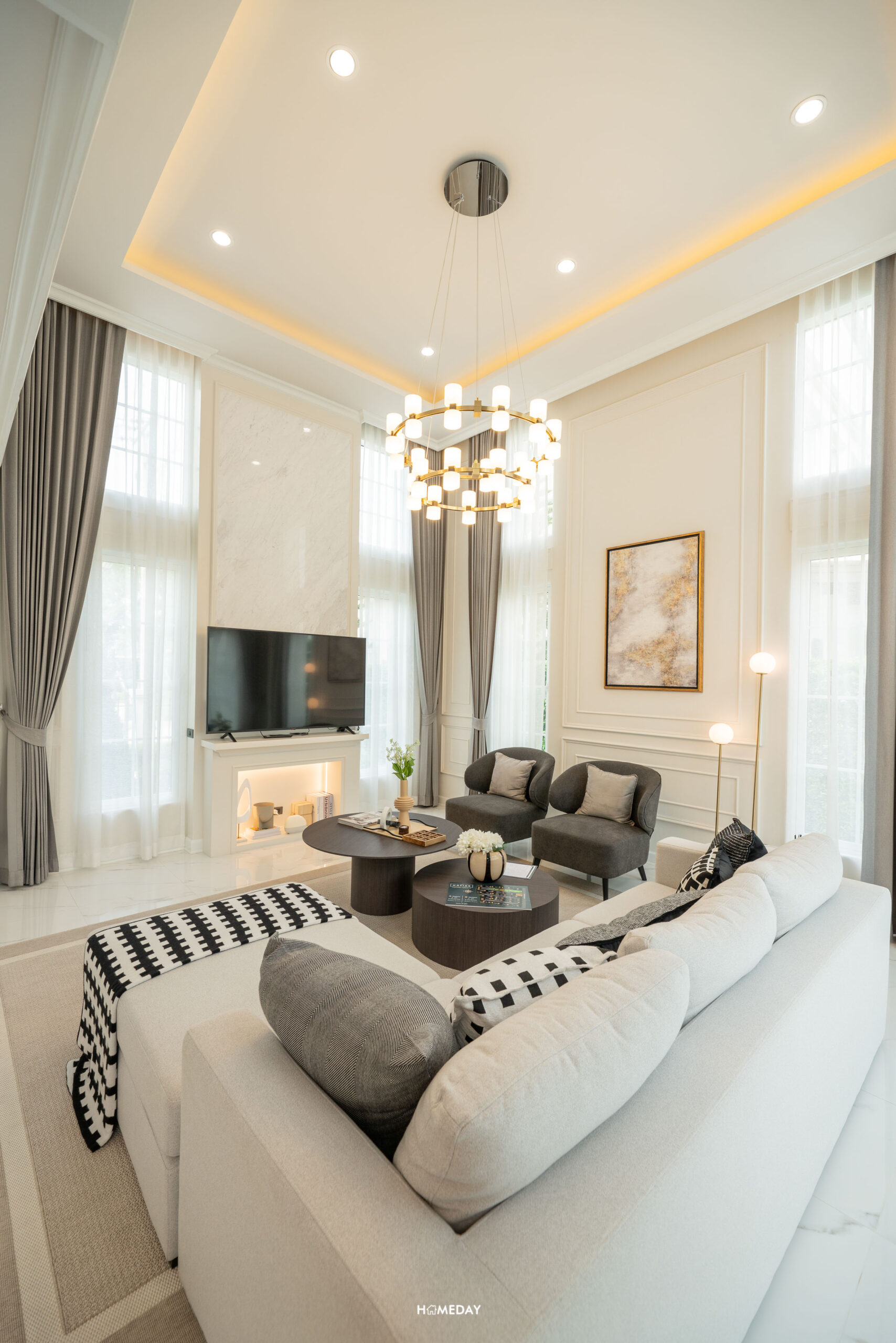 Highlight ของบ้านมี 2 จุดด้วยกัน จุดแรกจะเป็นห้องนั่งเล่นขนาดใหญ่ Double Volume Living สูงถึง 4.4 เมตร มาพร้อมด้วยบานหน้าต่างแบบ Oversize บานใหญ่ ล้อมรอบห้อง ทำให้บ้านยิ่งโปร่งโล่ง ดูแกรนด์มาก ๆ ครับ