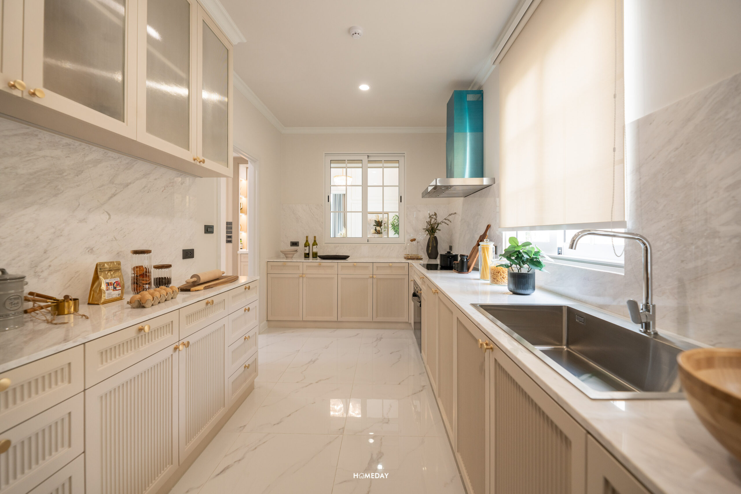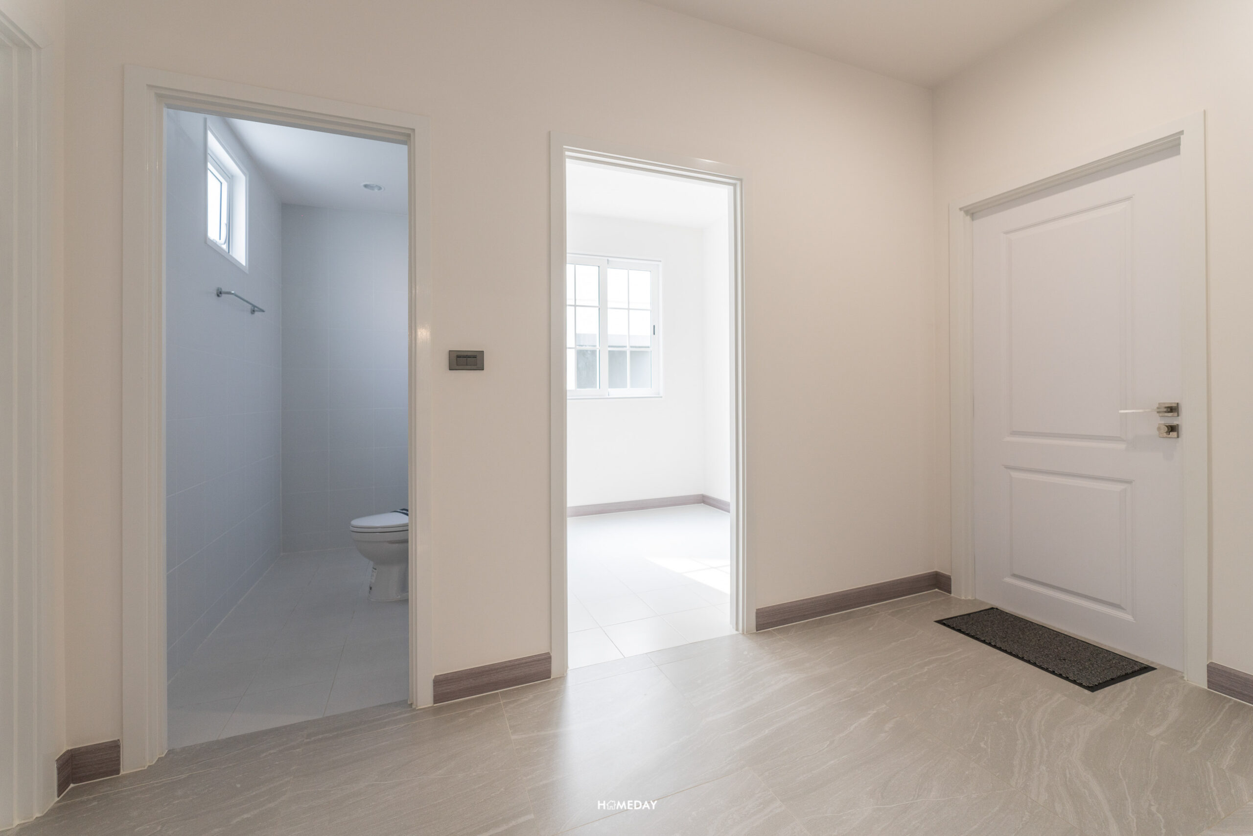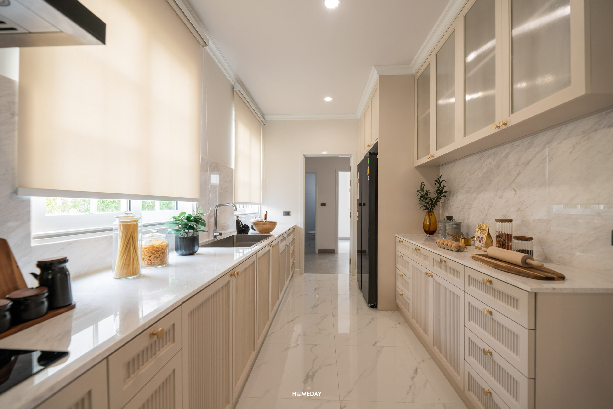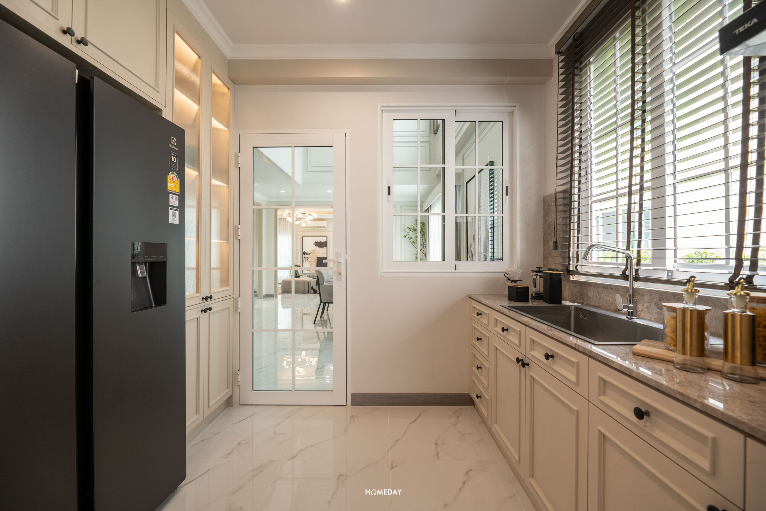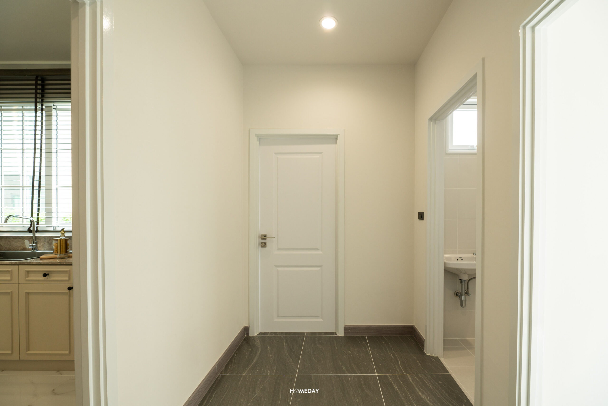 มองทะลุครัวออกไปเป็นโซน Maid Plaza ที่เชื่อมต่อกับประตูโรงจอดรถทางขวามือ ส่วนซ้ายมือจะเป็นประตูออกไปหลังบ้านที่เป็นโซนลานซักล้าง ส่วนถัดมาเป็นห้องน้ำของแม่บ้าน และห้องพักของแม่บ้านครับ