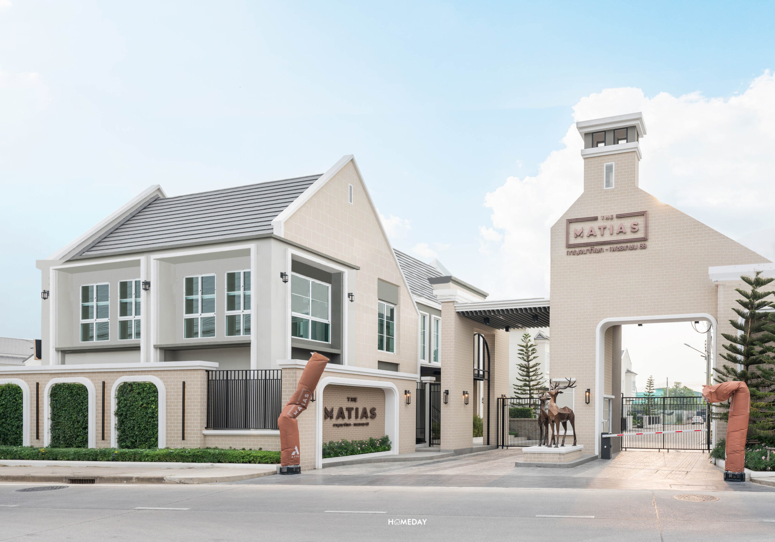 ซุ้มโครงการตกแต่งเป็นแบบ Dutch Colonial Style ตามสถาปัตยกรรมยุโรป สไตล์นี้จะโชว์หน้าจั่วทรงสูง บัวปูน ไม้ระแนง และผนังปูนเซาะร่องทำเป็นเหมือนอิฐบล็อก ให้ความรู้สึกเหมือนอยู่ยุโรป ตามสไตล์ Dutch Colonial ส่วนถนนเมนหน้าโครงการเป็นพื้น Stamp Concrete ช่วยทำให้ภาพรวมดู สะอาดตา สวยงาม ผสมผสานกับ Sculpture กวางเรนเดียร์ตัวผู้ สี Copper ตั้งตระหง่านตรงกลาง ให้ความรู้สึกถึงความสมบูรณ์แบบ สง่างาม และสะท้อนความเป็นตัวตนของผู้อยู่อาศัยไปด้วยครับ