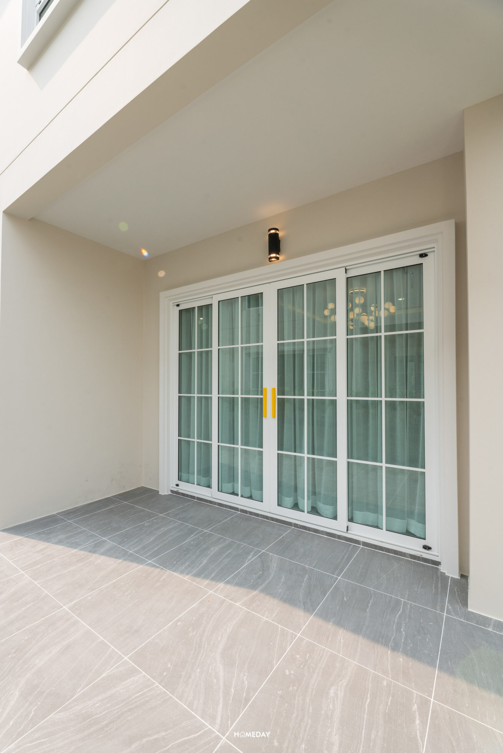 ด้านหน้าประตูทางเข้าจะมีโคมไฟกิ่งให้ 3 ดวง ทรงคลาสสิก ช่วยเพิ่มแสงสว่างระหว่างเดินเข้าบ้าน ทางโครงการได้ออกแบบประตูทางเข้าหลักให้ลึกเข้าไปด้านใน ทำให้ได้ทั้งชายคาที่ช่วยกันแดดกันฝน และทำให้บ้านดูสวยงาม มีมิติมากยิ่งขึ้น ตัวประตูทางเข้าหลักเป็นแบบเปิดคู่ สูงโปร่งบานกรอบ Aluminium สีขาว ตัวกระจกเป็นกระจกเขียวตัดแสงเหมือนเช่นเคย