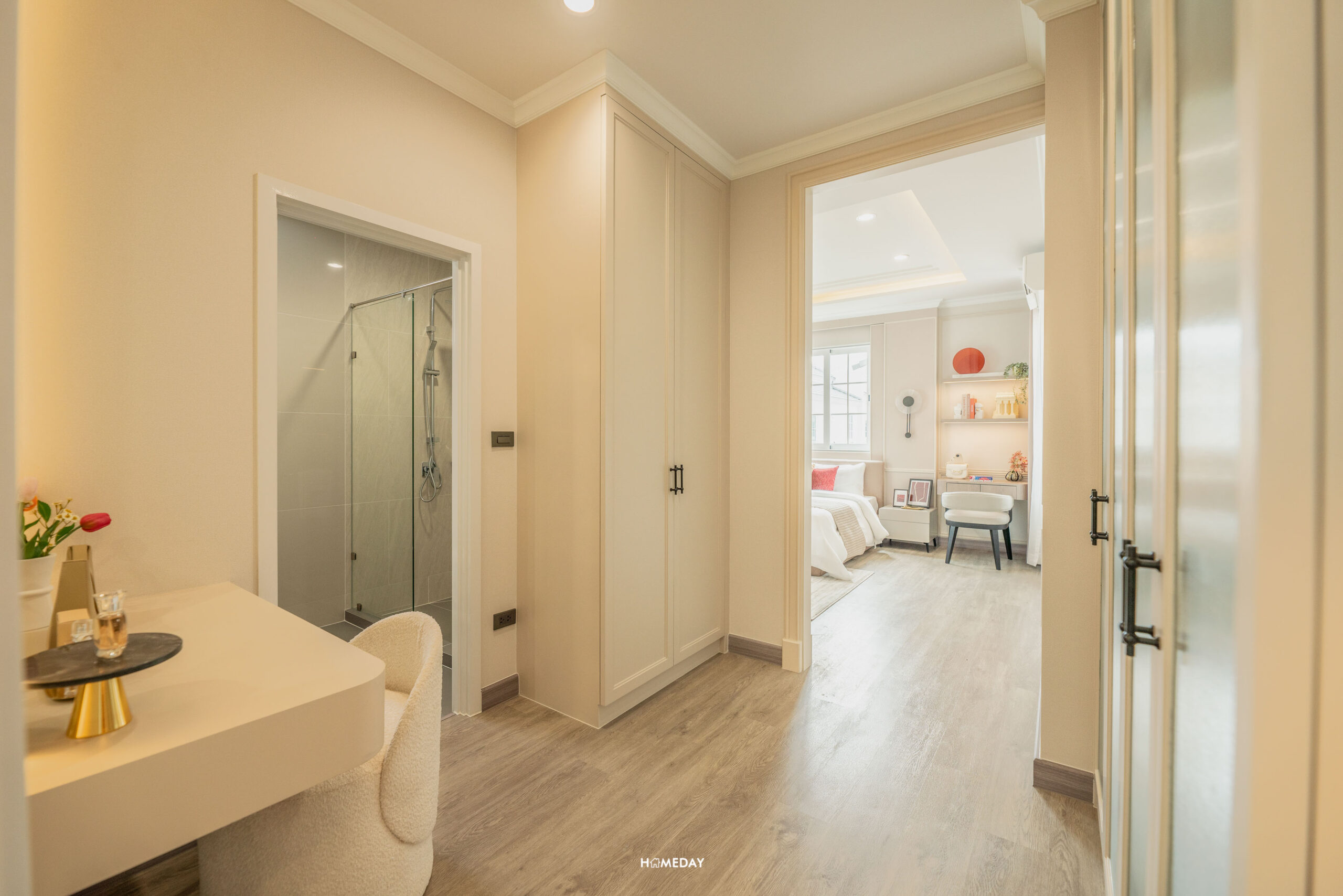 ห้องนอน 3 โถงทางเดินแบ่งแยกส่วน Walk-in Closet ก่อนเข้าไปยังโซนห้องนอน ทำให้มีความเป็นส่วนตัวมากยิ่งขึ้น ทางโครงการยังกั้นส่วน Walk-in Closet ให้เหมือนเดิมครับ เราสามารถ Built-in ตู้เสื้อผ้า ตู้เก็บของ รวมไปถึงโต๊ะเครื่องแป้งเพิ่มเติมได้เอง สามารถออกแบบให้เหมาะตามความต้องการของผู้อยู่อาศัยได้เลยครับ ในส่วนของห้องน้ำ ชุดสุขภัณฑ์ อ่างล้างหน้าเป็นของ American Standard ใต้อ่างล้างหน้าก็มีตู้ไว้เก็บของ ส่วนขวามือกั้นกระจกนิรภัยมาให้เป็น Shower Box มีฝักบัว 2 แบบ Rain Shower และ Hand Shower พร้อมติดตั้งวางงานระบบไฟฟ้าไว้รองรับเครื่องทำน้ำอุ่น