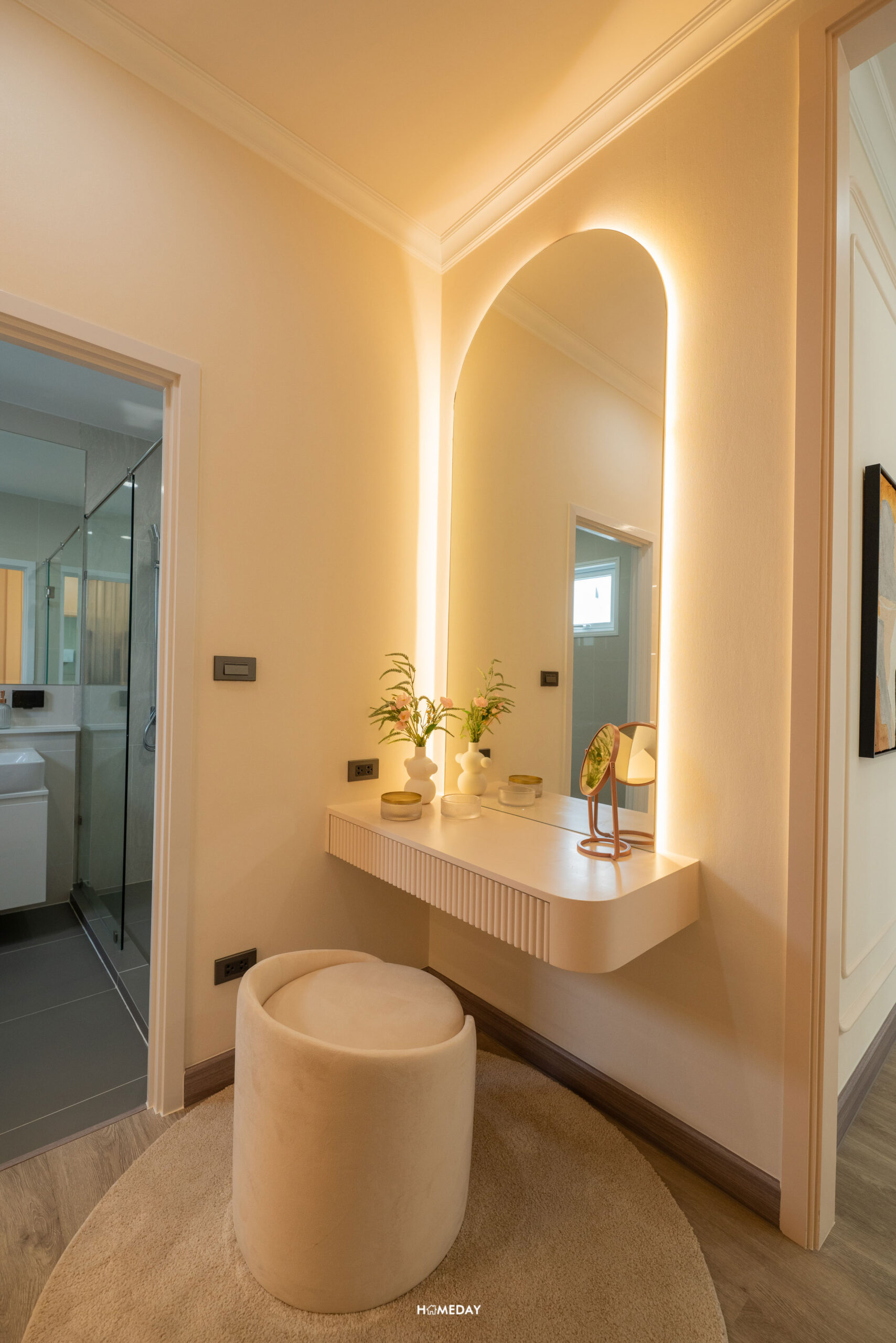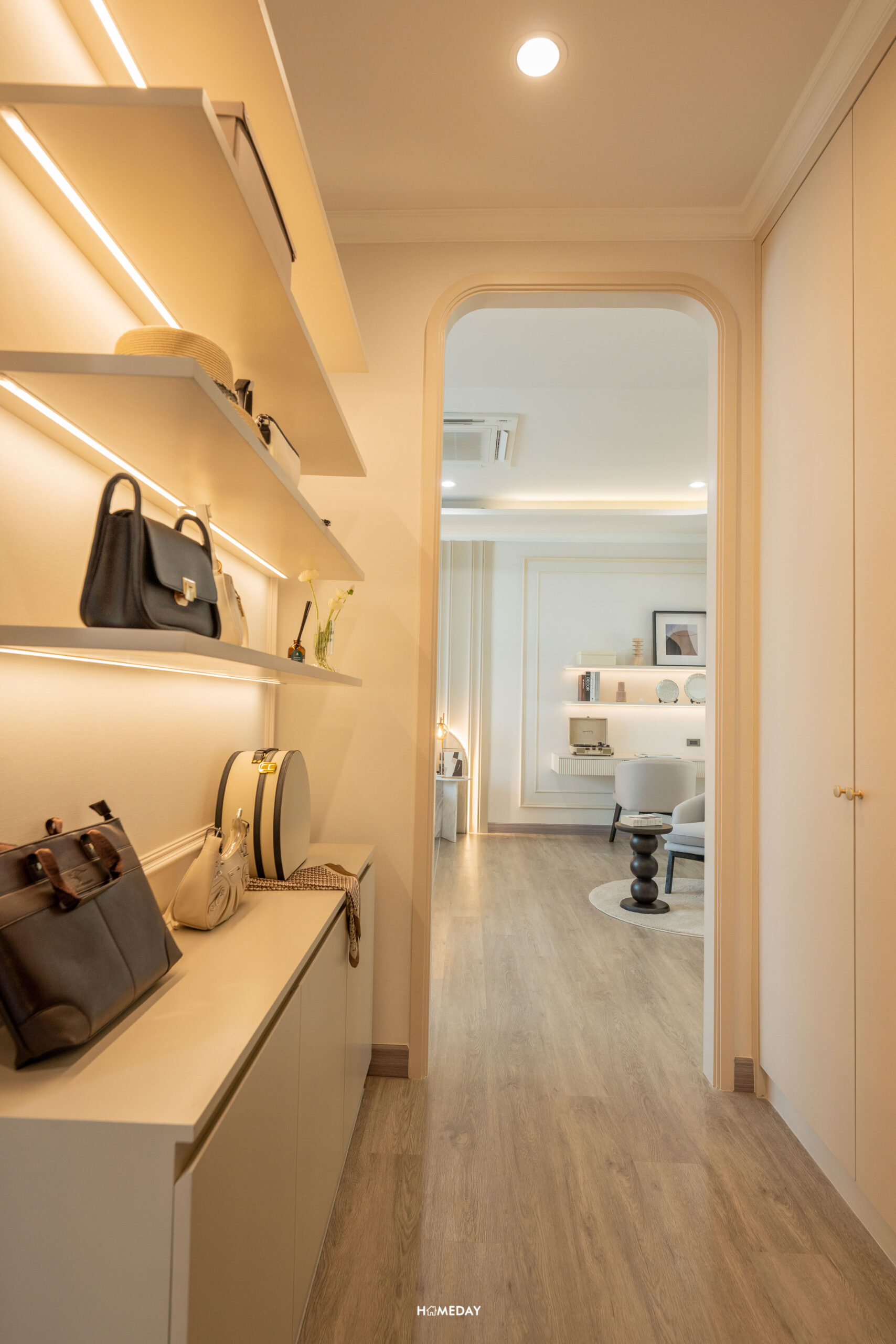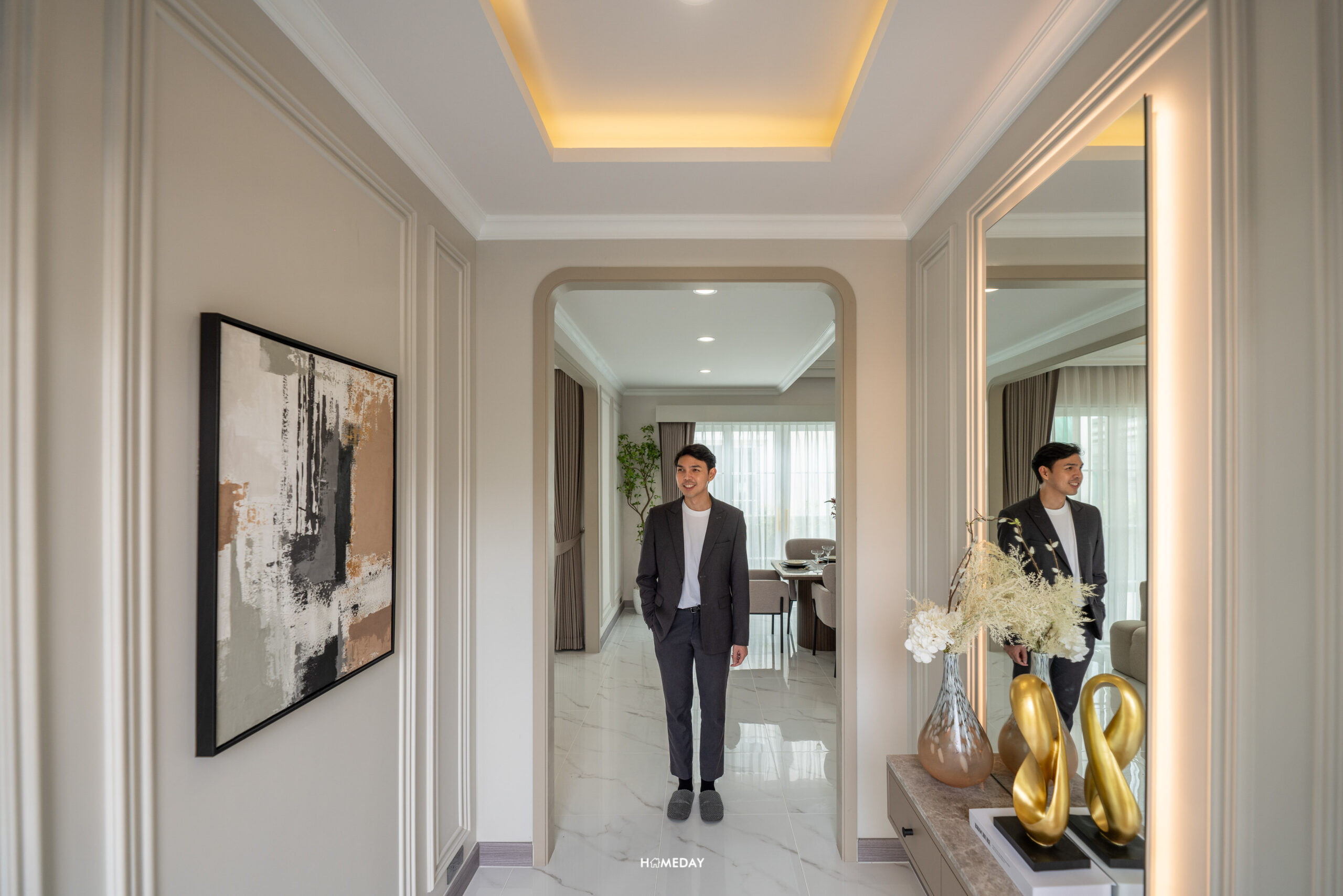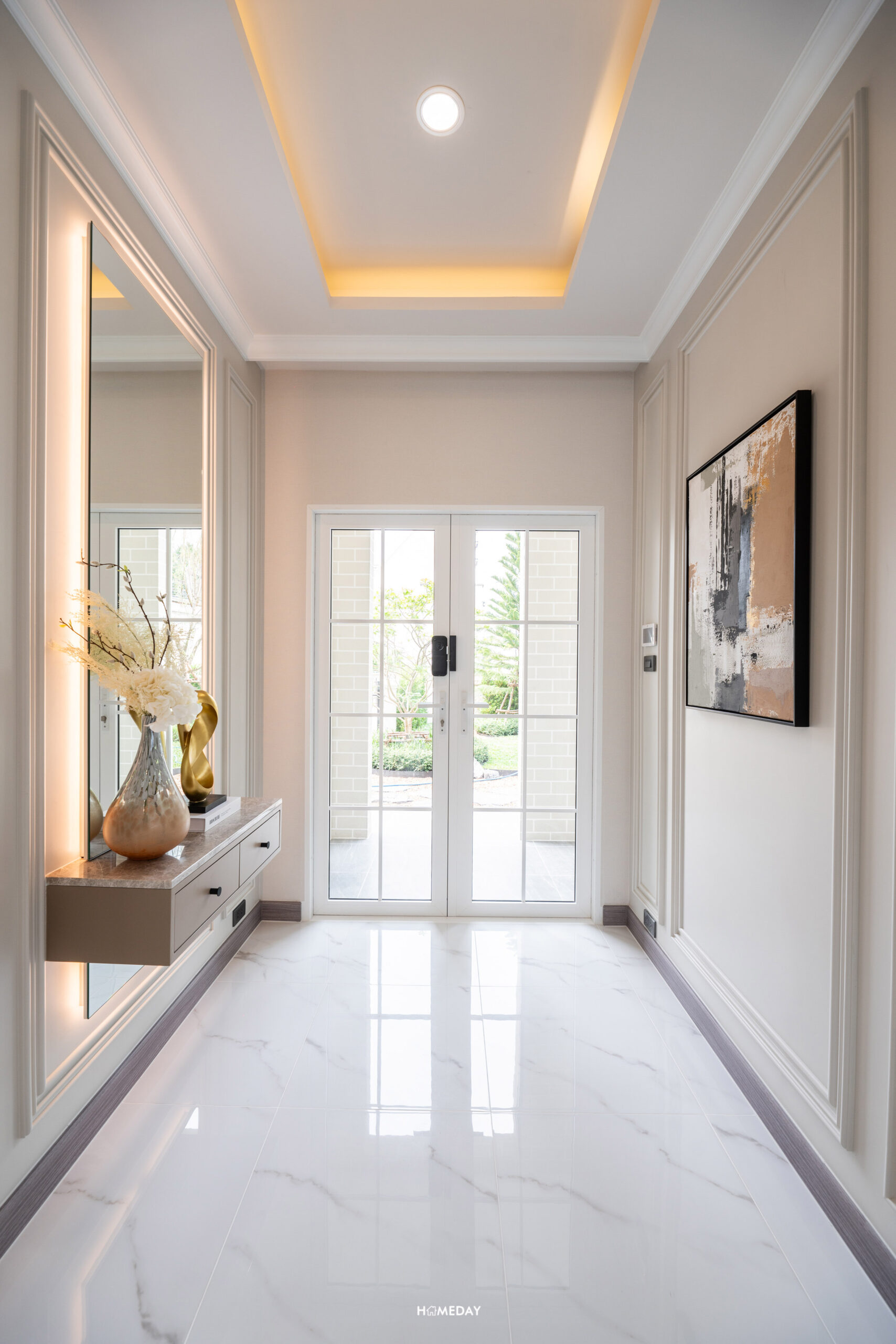 เชื่อมต่อกับเฉลียงหน้าบ้าน เข้ามาเจอ Foyer เป็นทางเดิน ที่แยกความเป็นส่วนตัวก่อนเข้า Living Area เหมือนกับบ้านไซซ์ใหญ่เลยครับ พื้นที่กว้างสามารถ Built-in ทำเป็นตู้เก็บรองเท้าได้ทั้ง 2 ฝั่ง หรือจะทำเป็นที่โล่ง ๆ มีตู้ลอยไว้วางของ วางกุญแจ และอีกฝั่งก็ติดกระจกบานใหญ่ไว้สำรวจความพร้อมก่อนออกจากบ้าน เหมือนที่บ้านตัวอย่างทำไว้ก็ได้