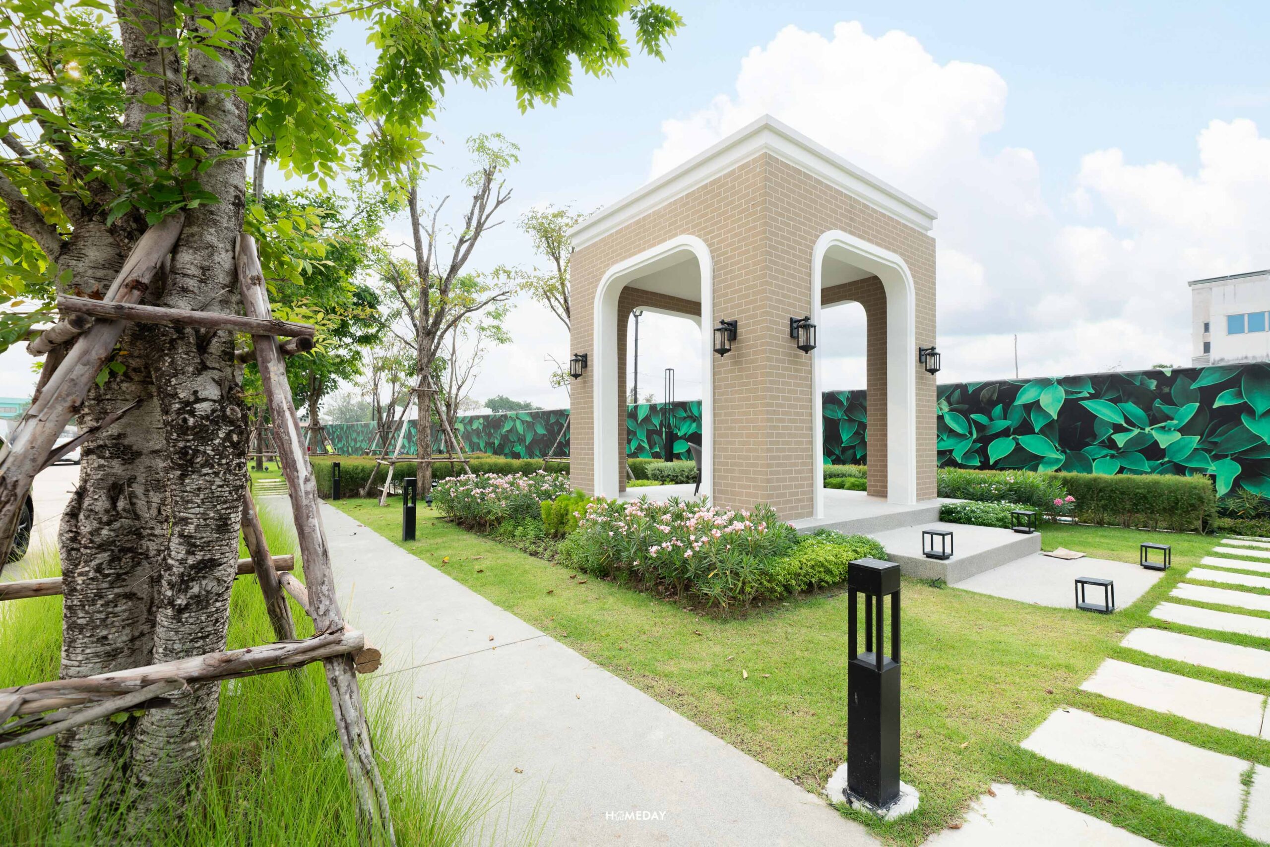 มากันที่พื้นที่สีเขียวของโครงการกันบ้าง สวนสาธารณะของโครงการจัดออกแบบ Formal Styles ผสมผสานความเป็นสไตล์ Dutch Colonial เป็นสวนแนวลึก ทรงสามเหลี่ยมขนานไปกับถนนเมน ล้อมด้วยบ้านภายในโครงการ ในสวนจะมีลานสนามหญ้าไว้ให้ลูกบ้านสามารถมาเดินเล่น ทำกิจกรรม ออกกำลังกายกลางแจ้งได้ มีต้นไม้ต้นใหญ่ตามจุดต่าง ๆ ทำให้บรรยากาศดูร่มรื่น สดชื่น สบายตา และยังมีทางเดินรวมไปถึง Pavilion ไว้ให้ได้นั่ง Relax พักผ่อน หรือหลบแดดได้ด้วยครับ