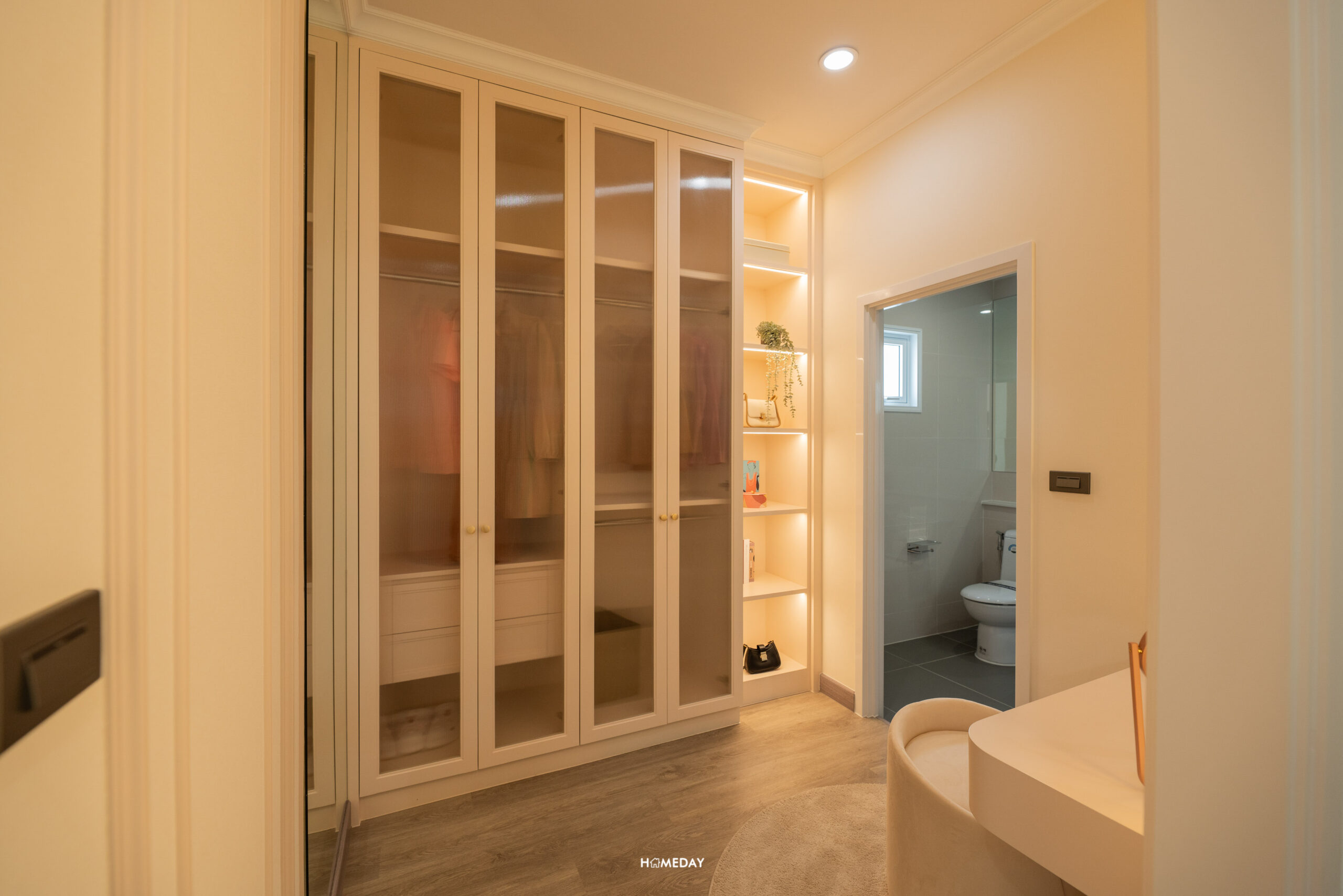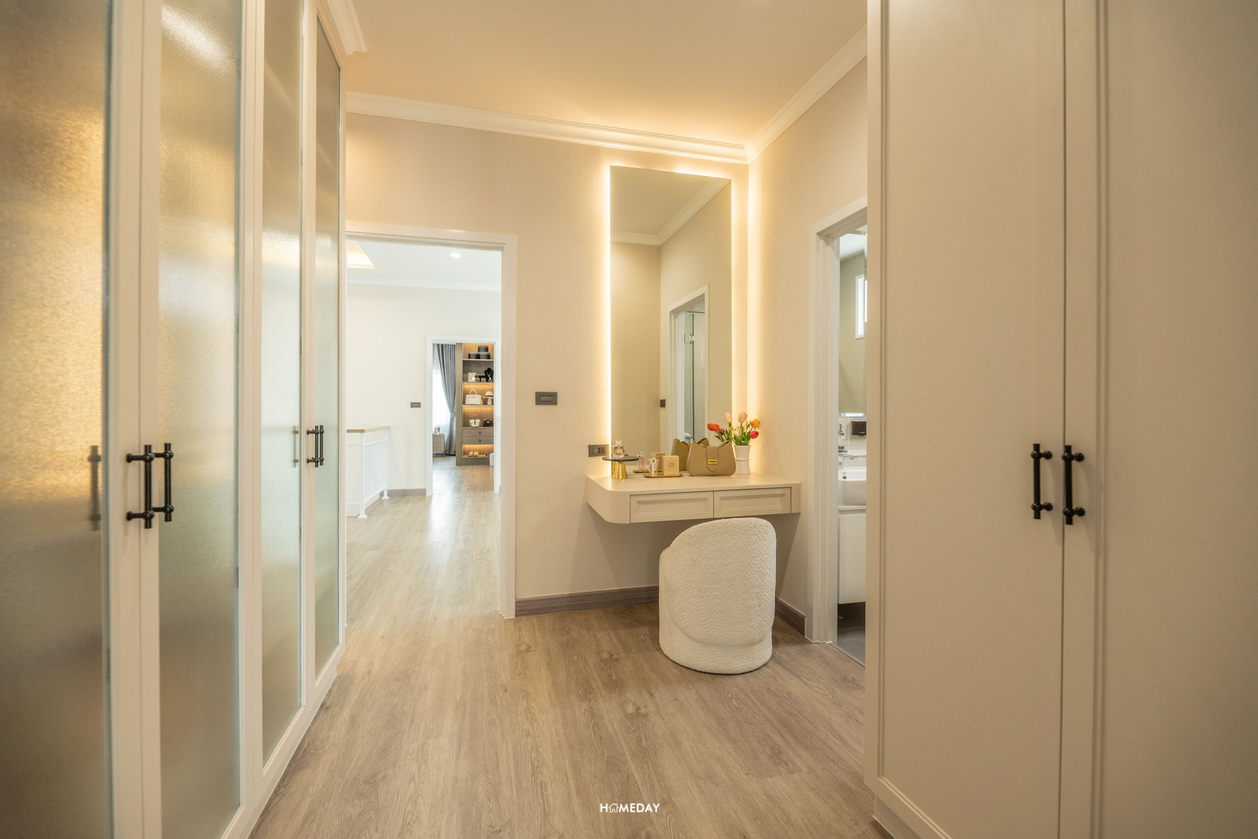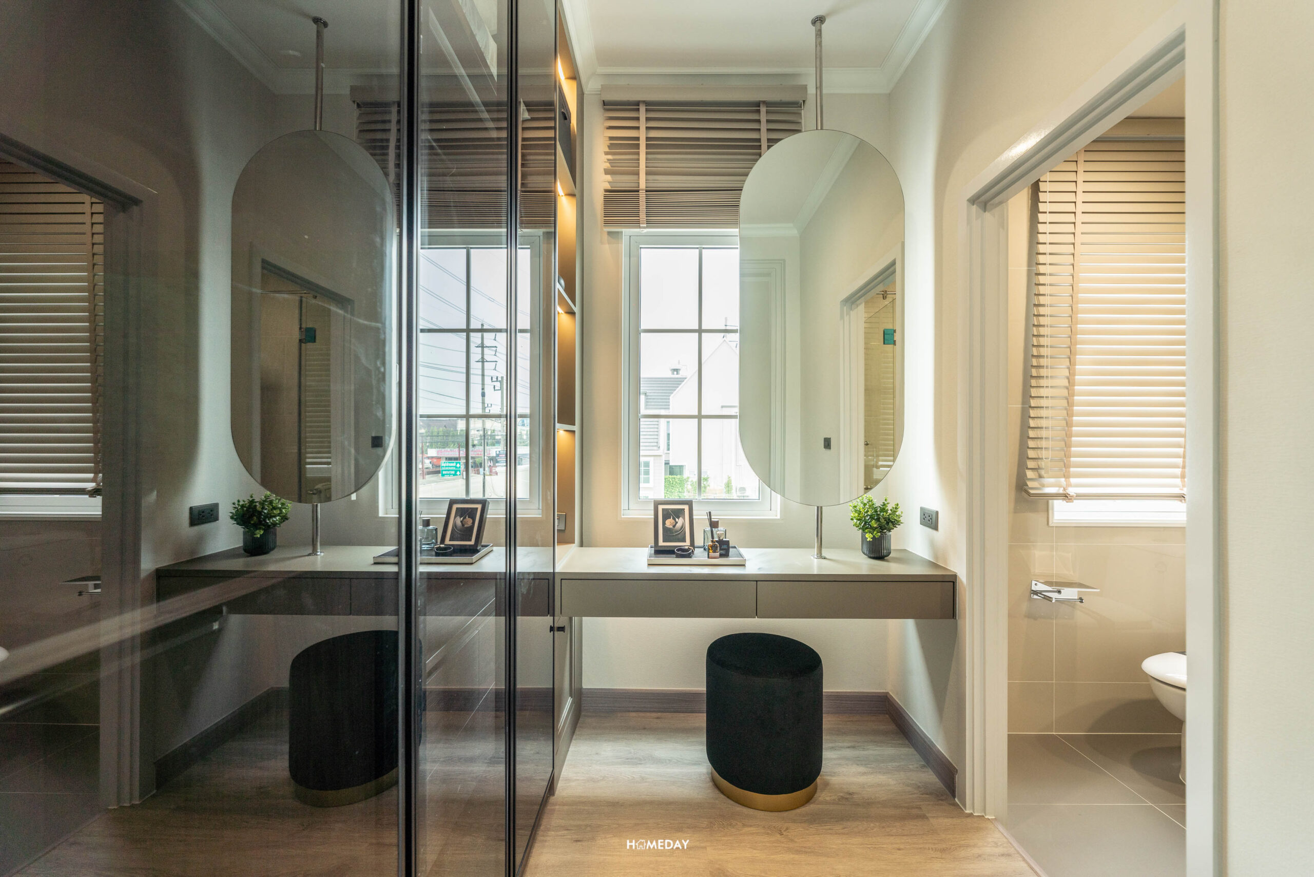 ทางโครงการกั้น Walk-in Closet ให้ทุกห้องนอนชั้นบน เราสามารถ Built-in ตู้เสื้อผ้า ตู้เก็บของ โต๊ะเครื่องแป้ง หรือจะทำเสริมเป็นที่นั่งเล่นริมหน้าต่าง ตามแบบบ้านตัวอย่างก็ได้ครับ