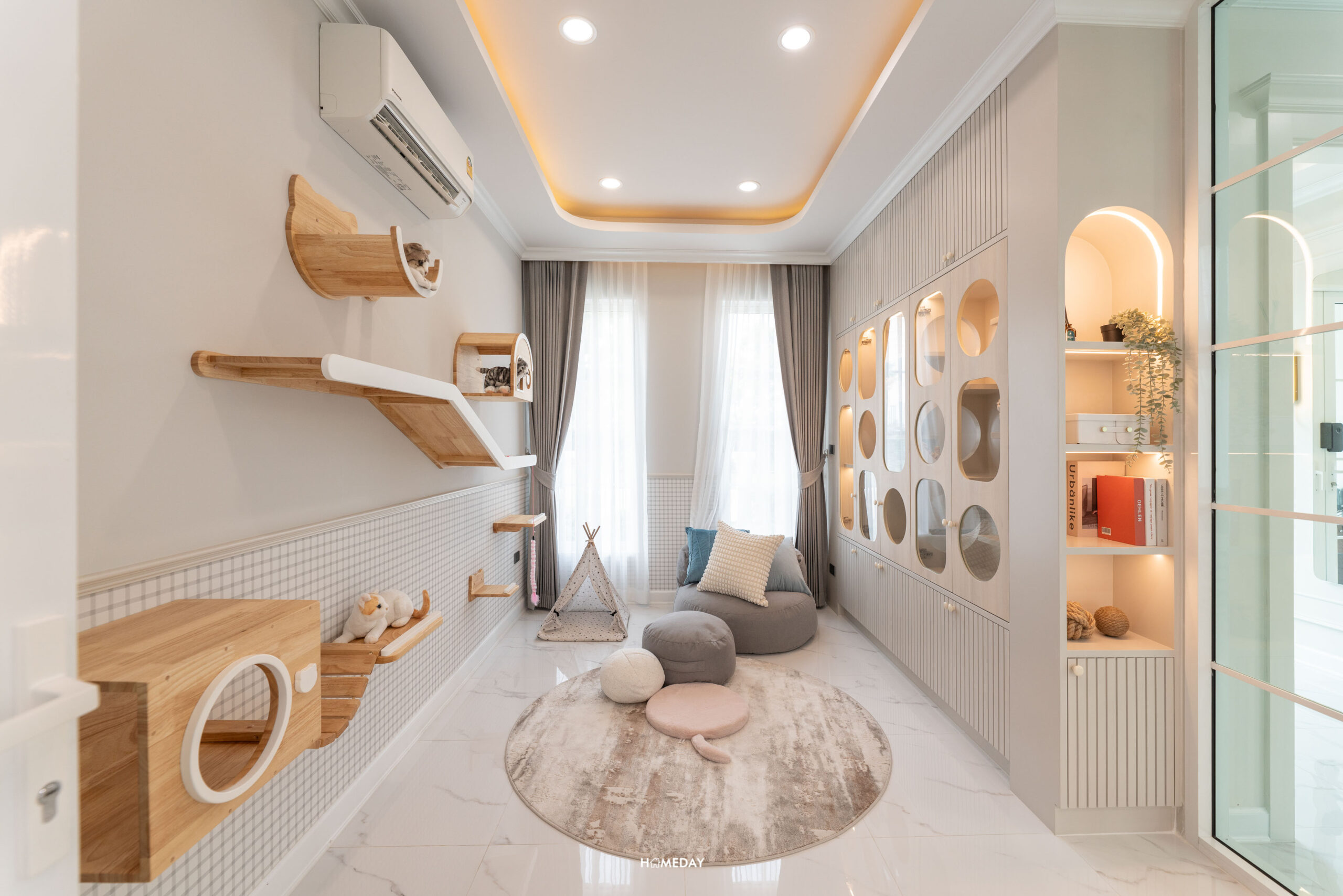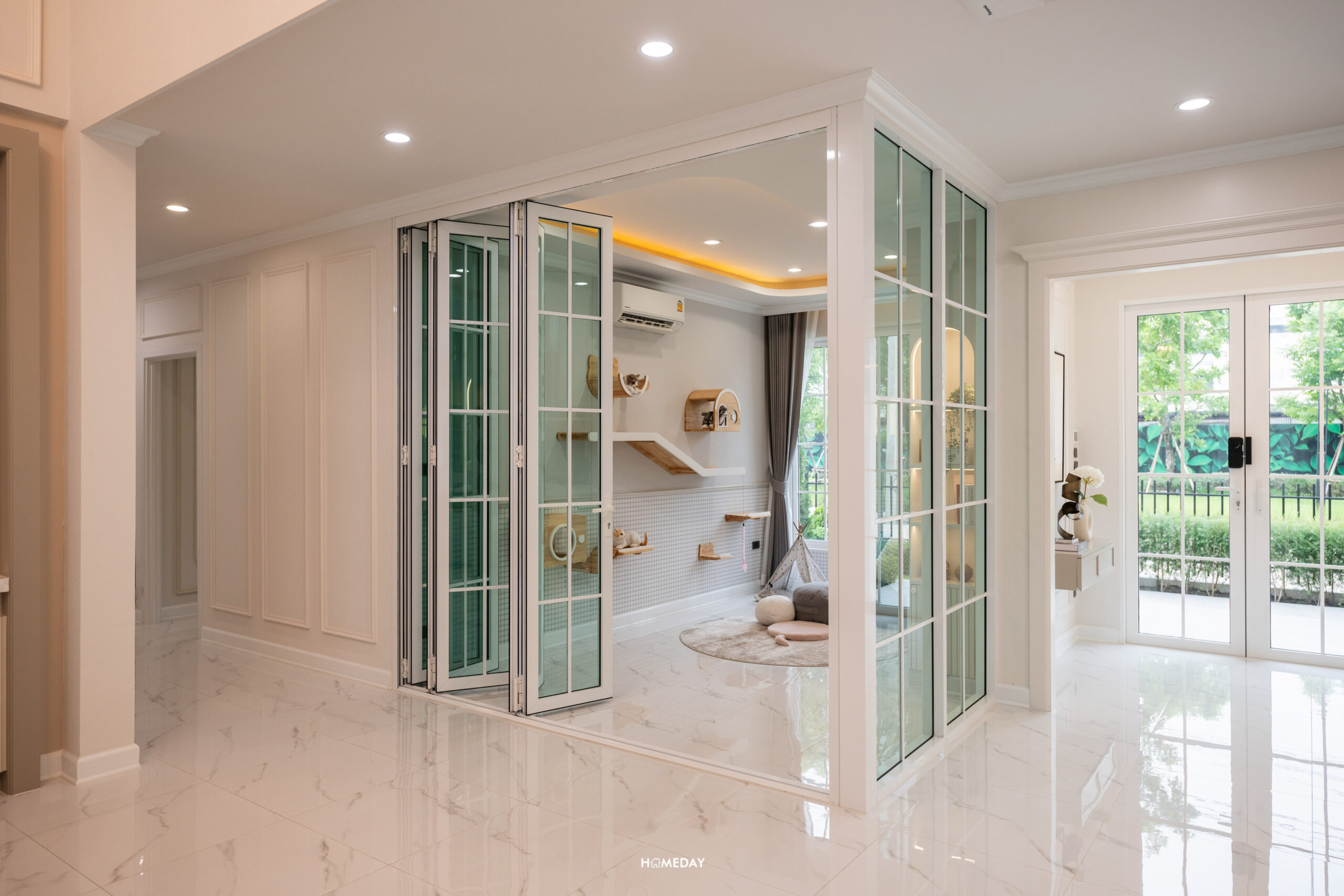 ห้องอเนกประสงค์ที่อยู่ติดกับ Foyer ทางขวามือจากทางเข้า ทางโครงการออกแบบให้ดูเป็นห้องสัตว์เลี้ยง ห้องน้องหมา น้องแมว บ้านจริงเราสามารถปรับเป็นห้องอื่น ๆ ตามไลฟ์สไตล์ได้เลย อาจจะทำเป็นห้อง Game Room ไว้สตรีมเกม รองรับเพื่อนชาว Gamer, โรงหนังส่วนตัว สำหรับให้ครอบครัวมาใช้เวลาร่วมกัน หรือจะเป็นห้องทำงานส่วนตัวก็ยังได้ครับ